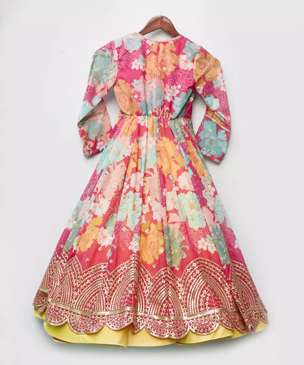 A Festive Perfect Anarkali For Your Little Girl. Featuring Round Neck, Full Sleeves Printed Georgette Jacket With Dori Tie Up In Front. This Anarkali Has An Elegant Touch With A Subtle Color Combination And Decent Sequins Work. This Set Is Smart And In Tune With Festive And Wedding Trends.