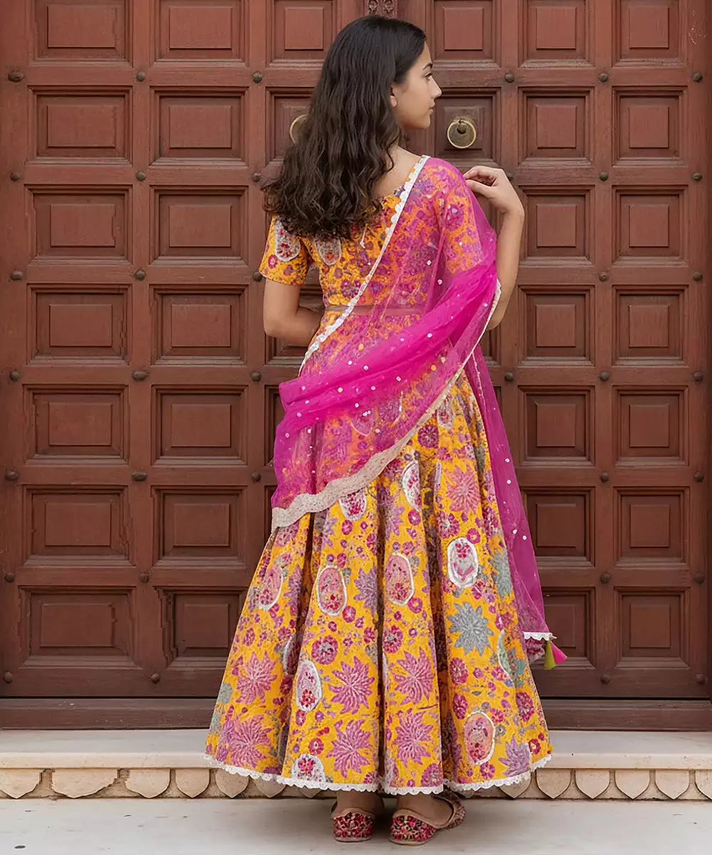 Brighten Your Festive Wardrobe With This Yellow Embroidered Cotton Lehenga Set. The Soft Cotton Lehenga Features Delicate Embroidery, Paired With A Matching Blouse And Dupatta. Perfect For Daytime Weddings Or Celebrations, This Set Combines Traditional Charm With Comfort, Offering A Cheerful, Vibrant, And Elegant Look For Festive Occasions.