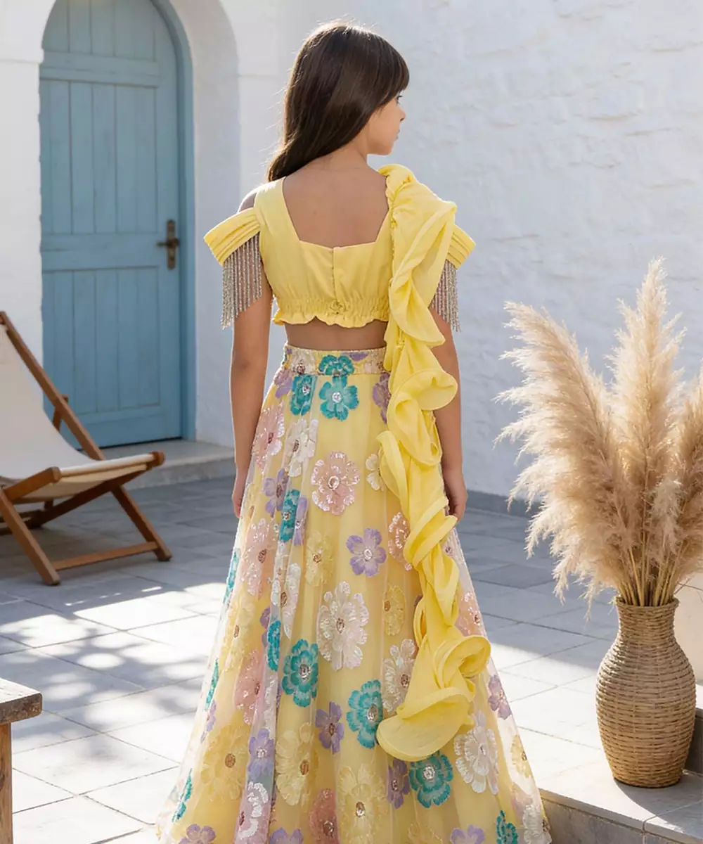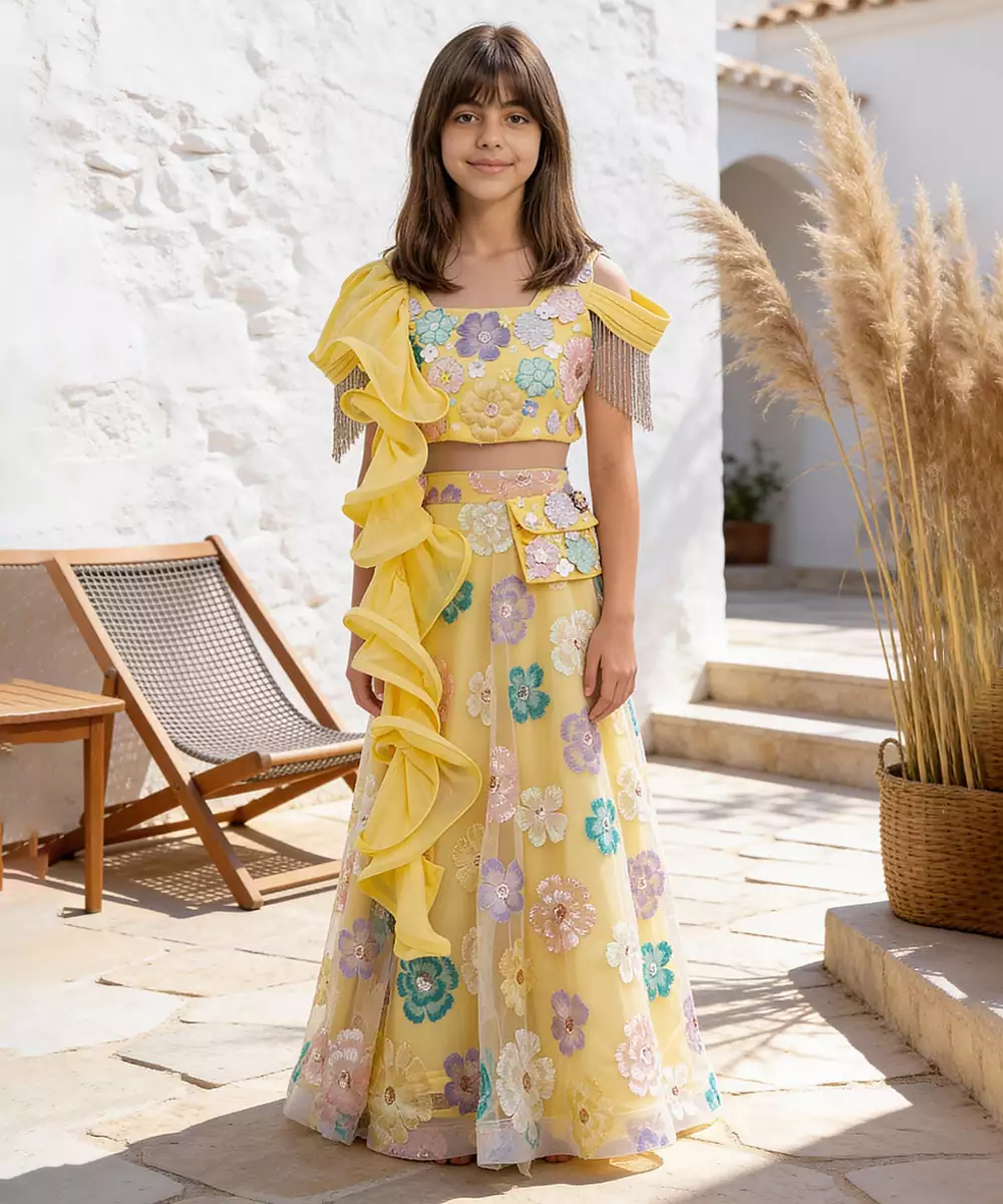 This Yellow Net Lehenga Set Features Delicate Embroidery That Enhances Its Bright And Cheerful Appeal. The Lightweight Fabric Creates A Soft And Flowy Silhouette, Perfect For Festive Occasions. Pair It With Subtle Jewelry For A Graceful And Elegant Look That Radiates Freshness.