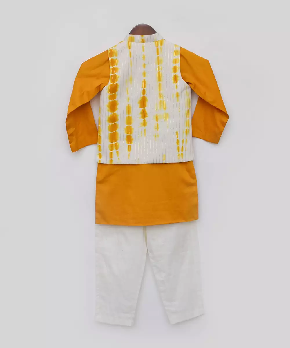 Experience Our Vibrant Boys Yellow Tie And Dye Nehru Jacket Set, Featuring A Stylish Tie And Dye Jacket With Cotton Lining And Embroidered Spectacles. The Cotton Silk Kurta With Lining Adds A Touch Of Elegance, While The Pant Without Lining Ensures Comfort. Make A Fashion Statement With This Yellow Tie And Dye Nehru Jacket, Kurta, And Pant Set, Perfect For Special Occasions And Celebrations.