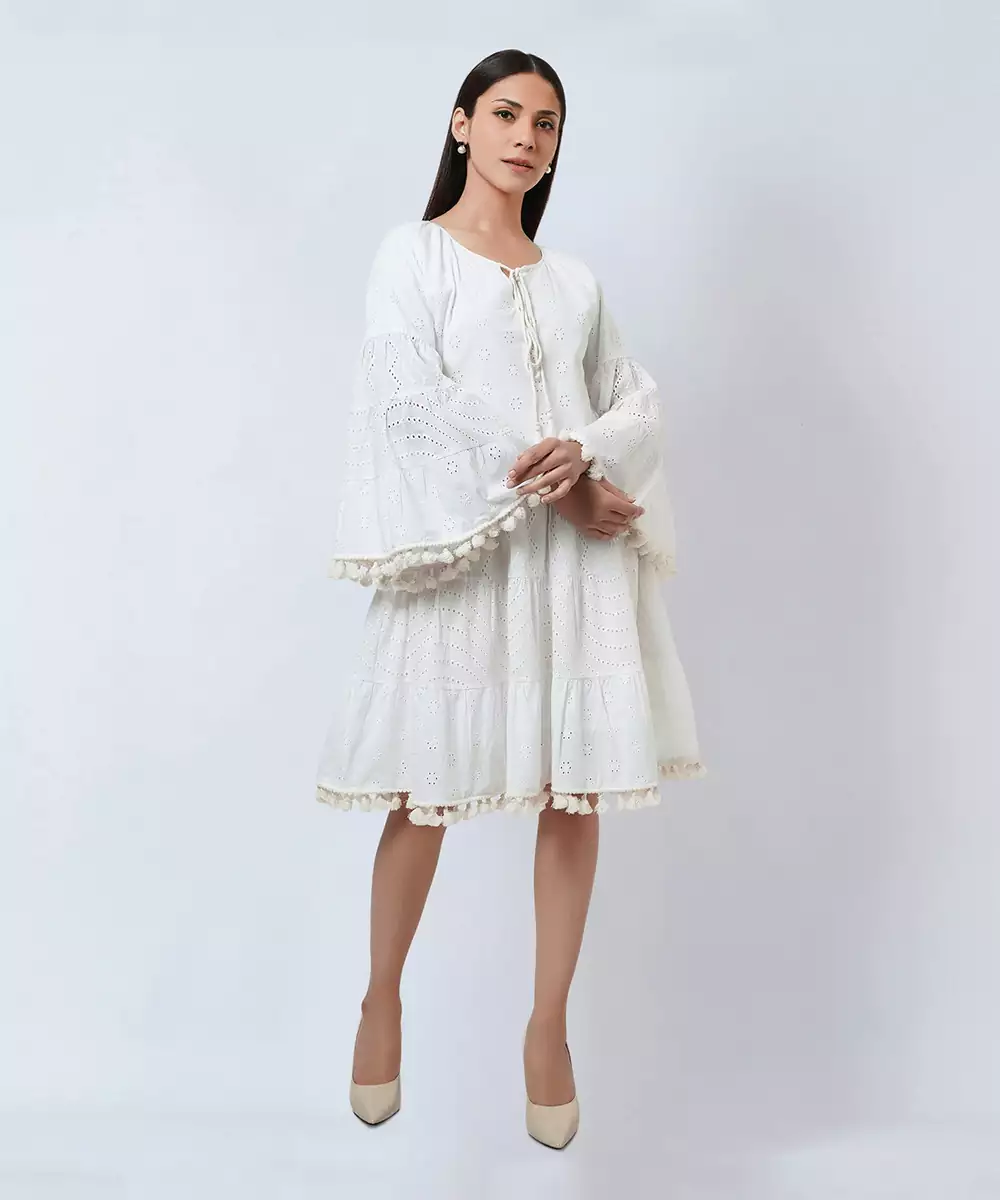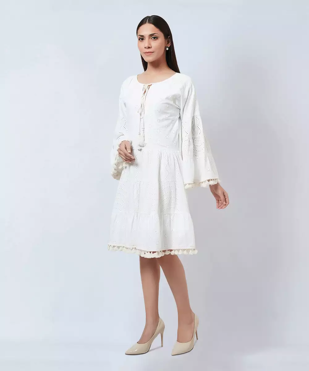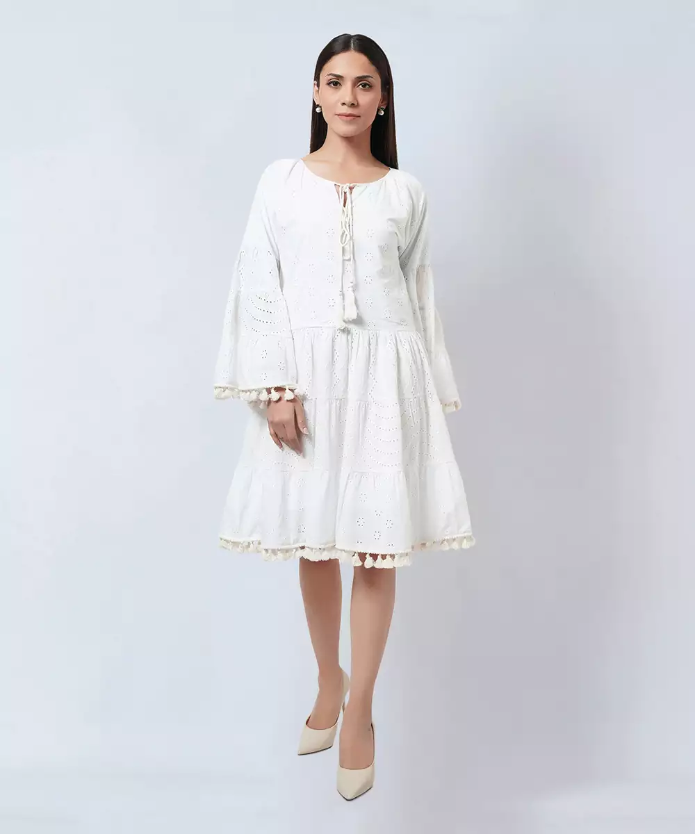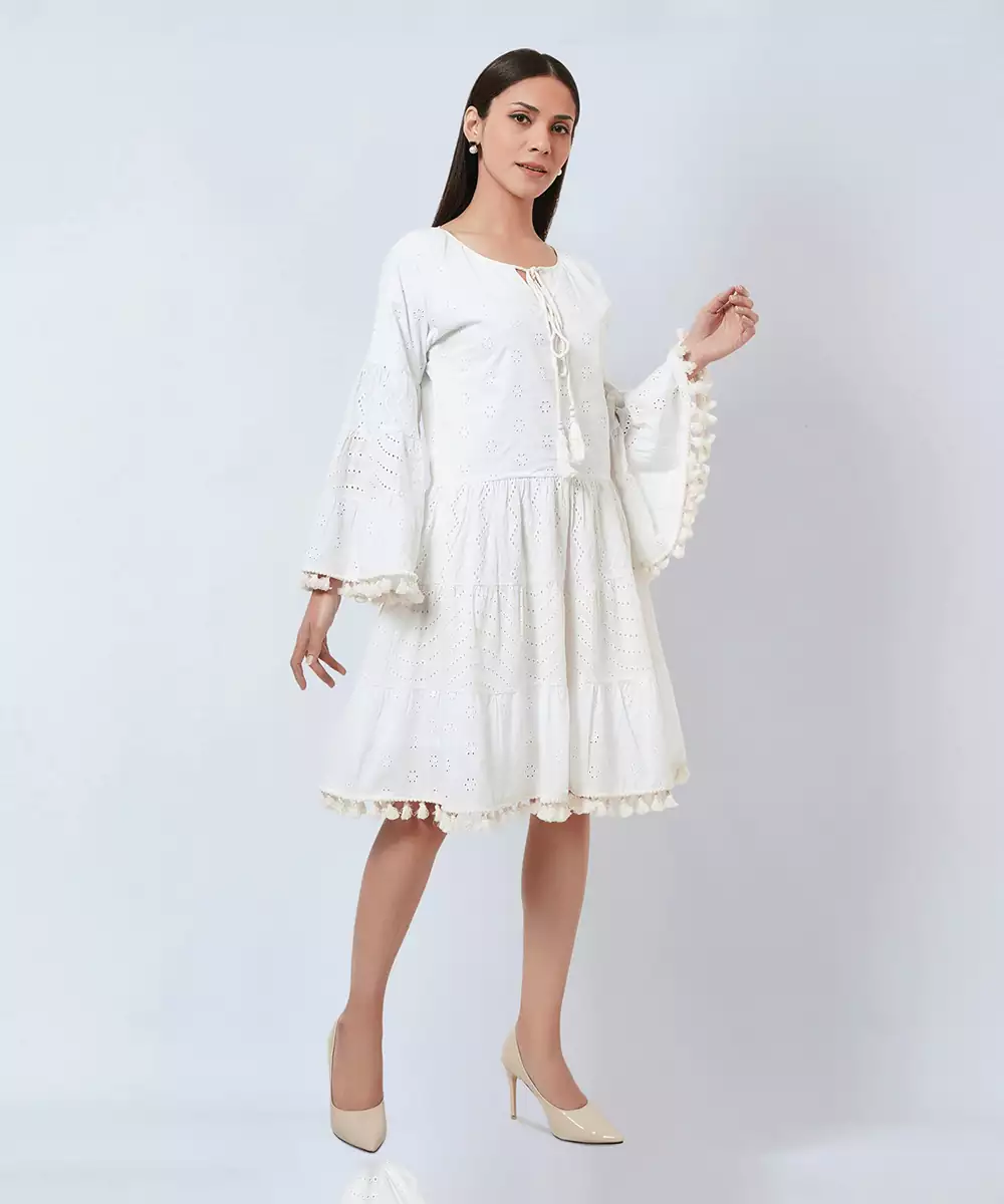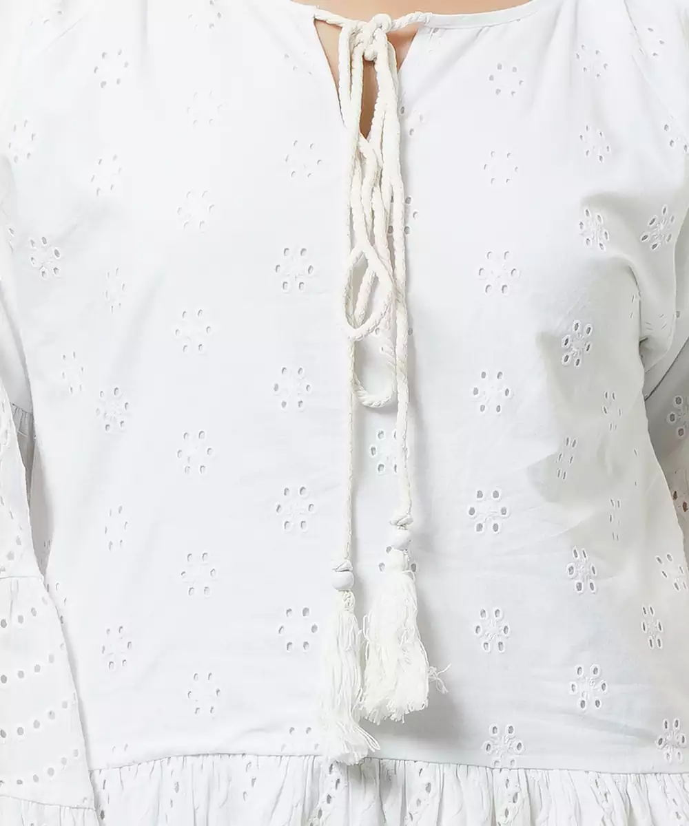 White Eyelet Tiered Cotton Dress With Tie Up Neckline And Tassels At Sleeves And At The Hem.