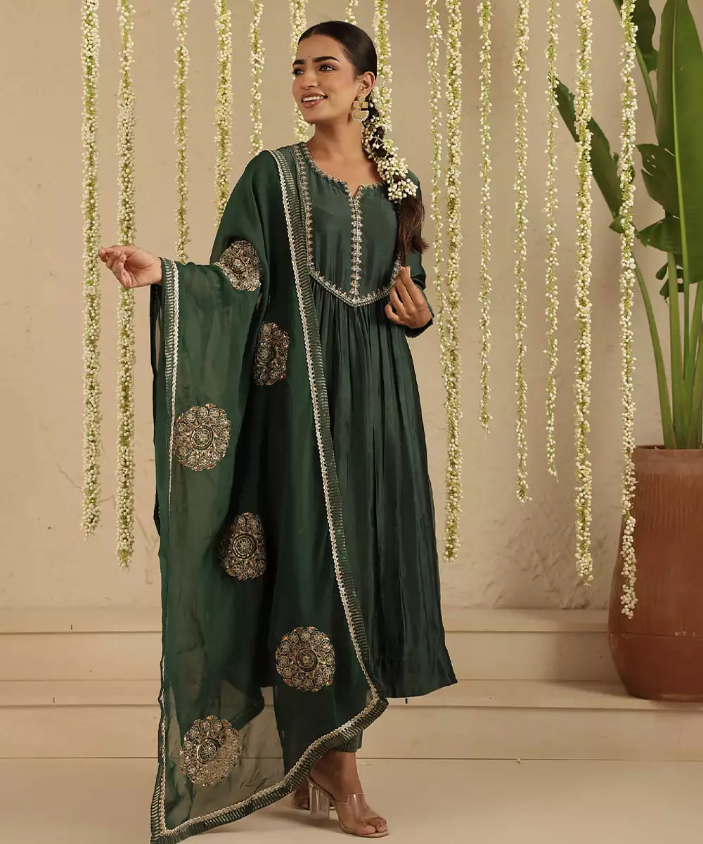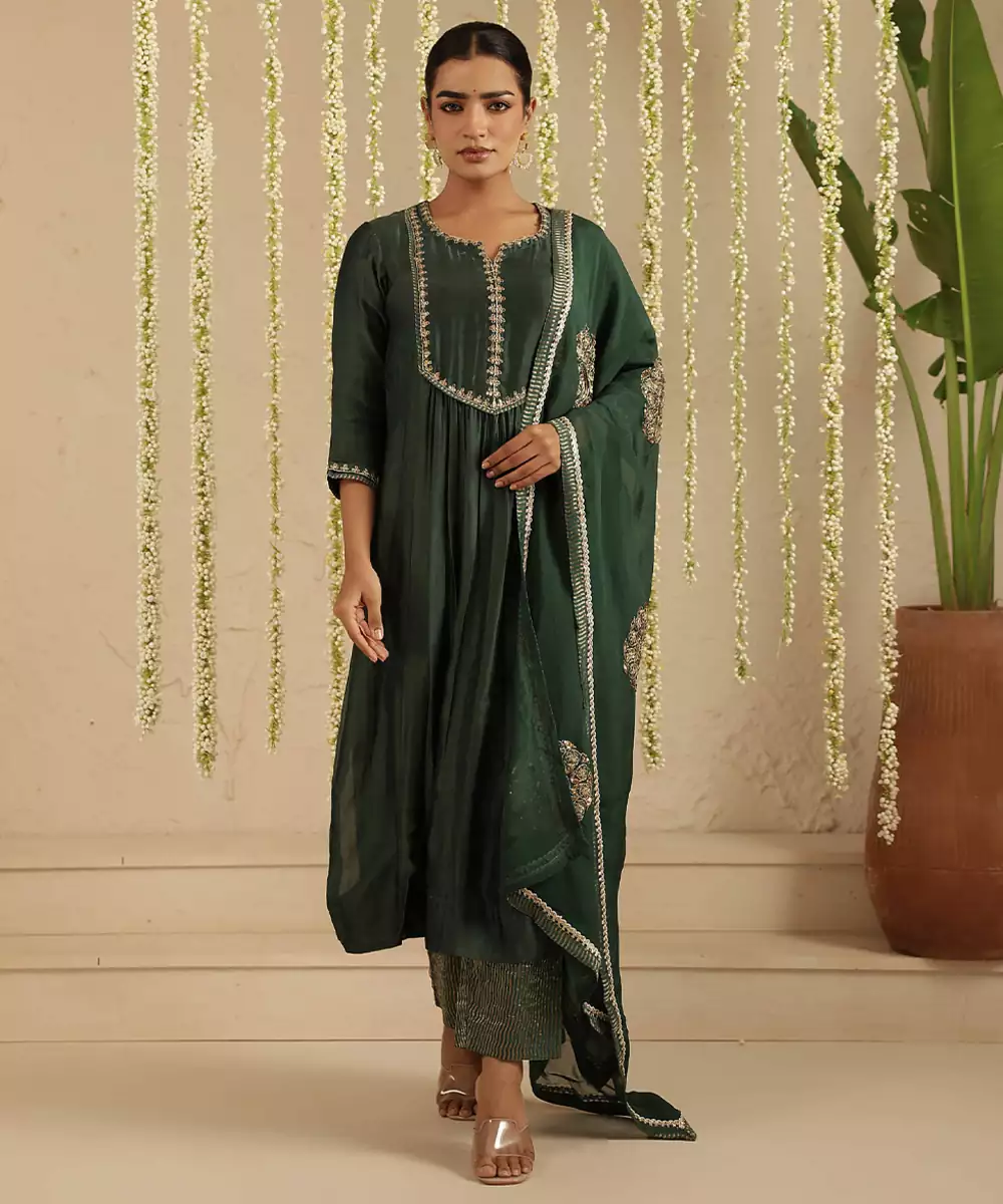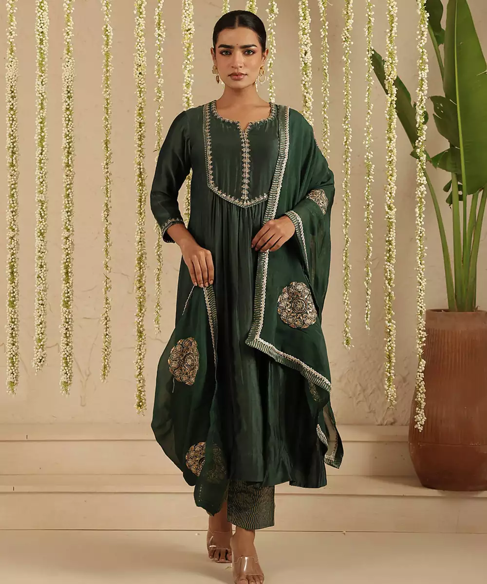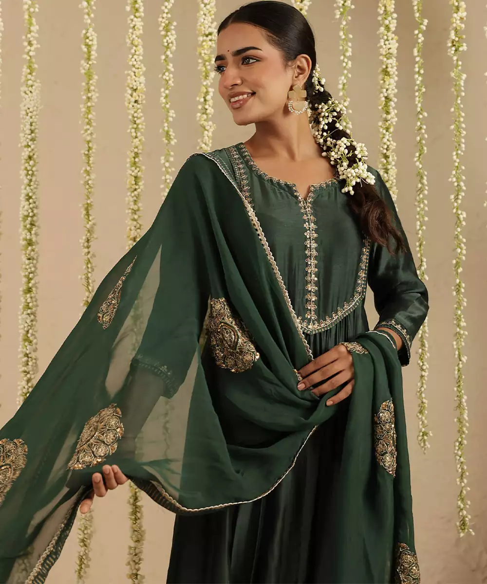 The Organza Dupatta With Beautiful Hand Embroidered Motifs On It Is The Usp Od This 3 Piece Set. The Set Is Made In Handloom Chanderi And Has Sequence And Dori Hand Emroidery On The Yoke And Dupatta. The Tissue Detailing On The Dupatta And Pants Gives It An Exquisite Look.