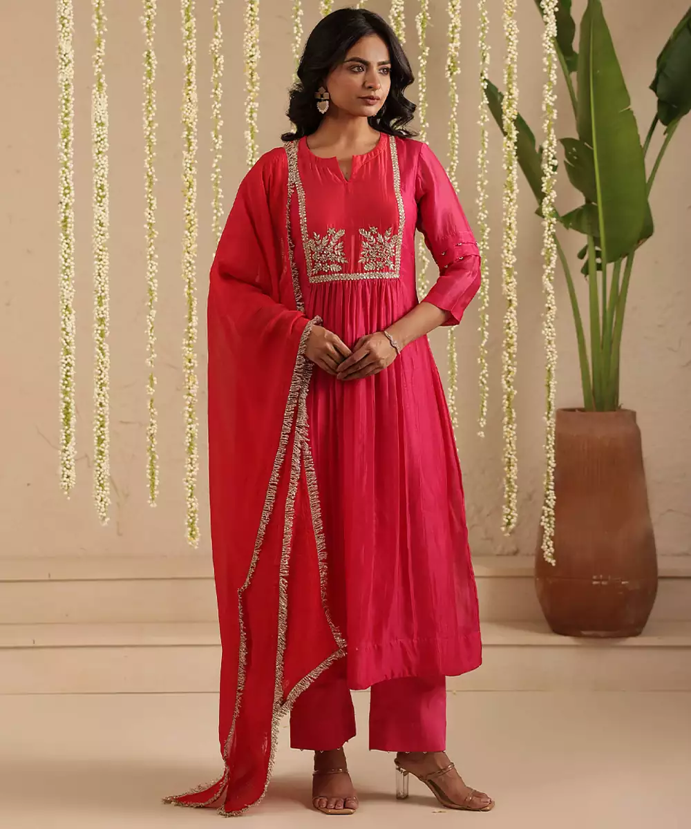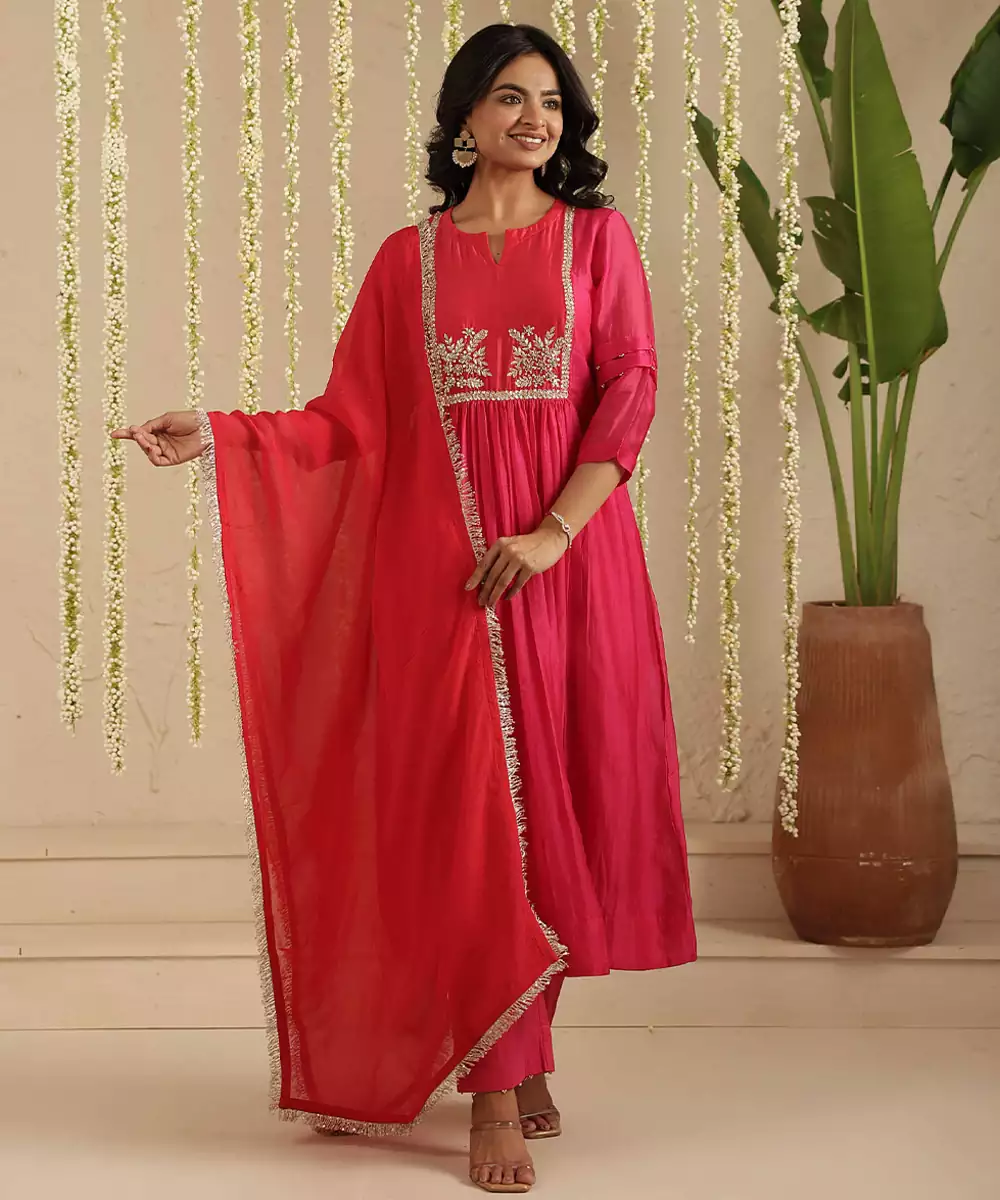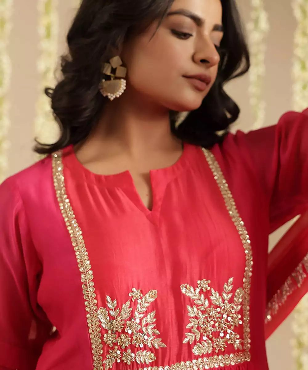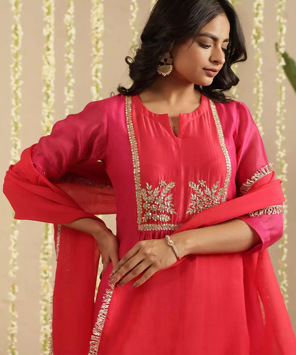 Shades Of Red And Hotpink Have Always Been The Topsellers Of Every Season Because Of Their Happy And Vibrant Vibe. This One Is No Different. The Intricate Detailing On The Sleeves And Yoke Makes It All The More Appealing.