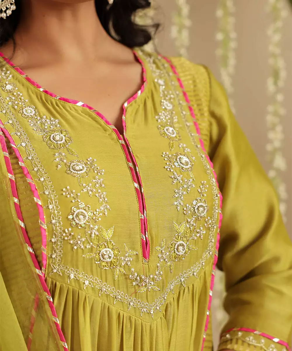 The 3 Piece Set Made In Handloom Chanderi Has Exquisite Hand Embroidery On The Front Yoke And Sleeves. The Set Has A Tissue Side Kali Which Adds To Its Charm.The Set Has A Cotton Pair Of Pants And An Organza Dupatta