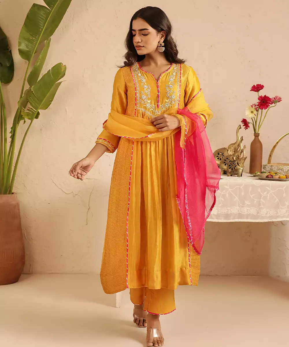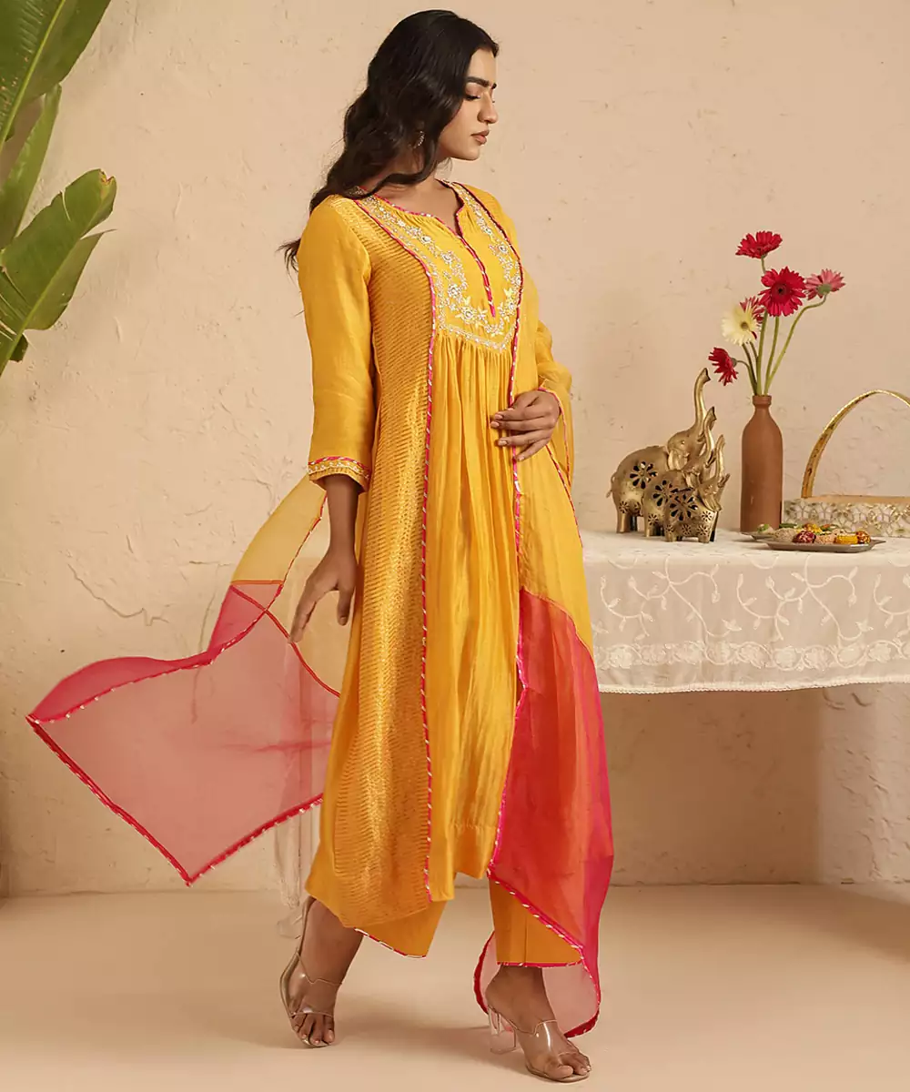 The 3 Piece Set Made In Handloom Chanderi Has Exquisite Hand Embroidery On The Front Yoke And Sleeves. The Set Has A Tissue Side Kali Which Adds To Its Charm.The Set Has A Cotton Pair Of Pants And An Organza Dupatta