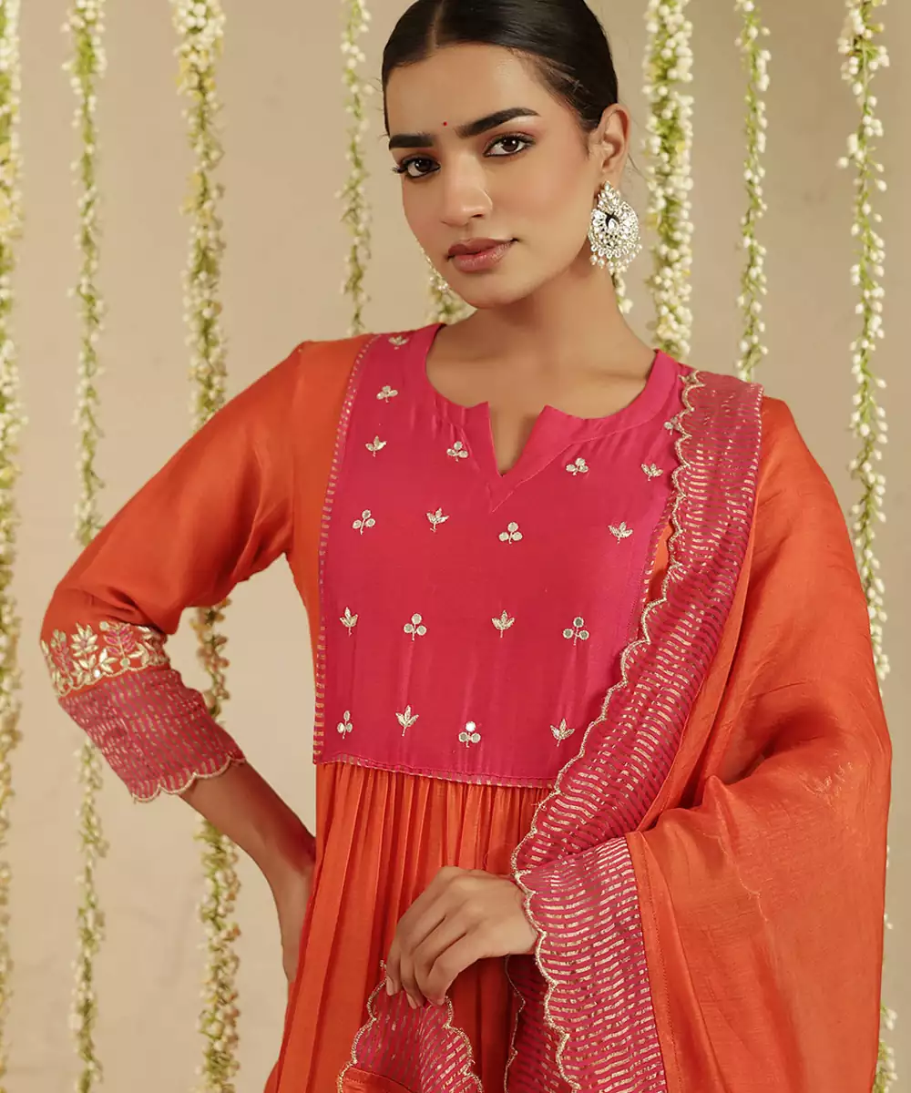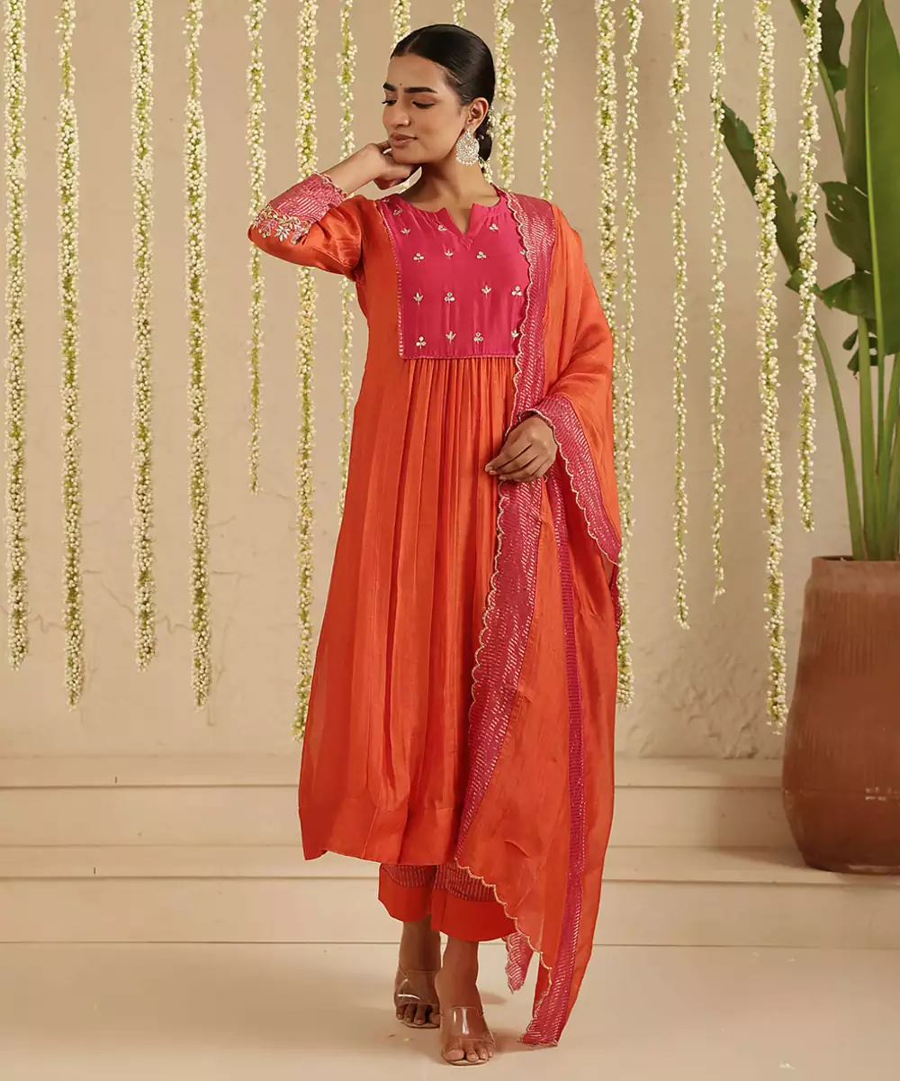 The 3 Piece Set Made In Handloom Chanderi Has Exquisite Gota Patti On The Front Yoke And Sleeves. The Set Comes With A Cotton Pant And A Handloom Chanderi Dupatta With Tissue Scalping