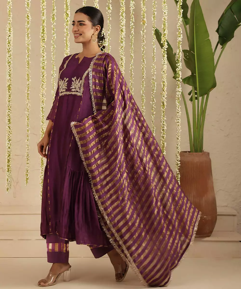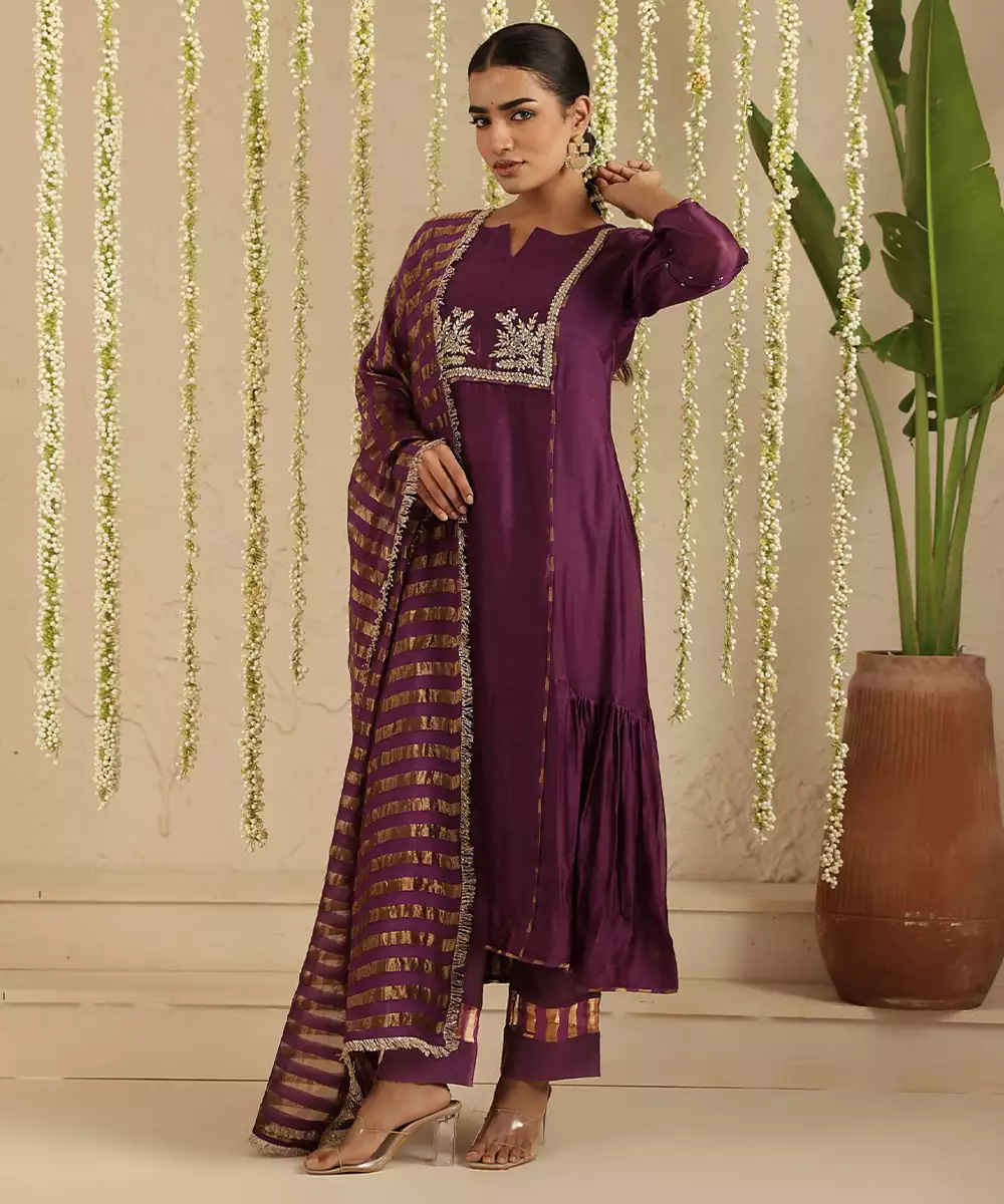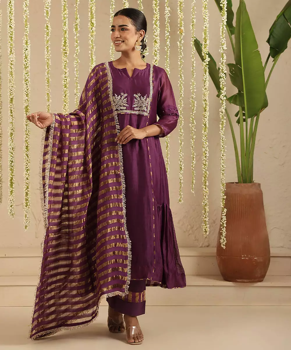 The 3 Piece Set Made In Handloom Chanderi Has Exquisite Hand Embroidery On The Front Yoke And Sleeves. The Set Comes With A Cotton Pant And A Tissue Chanderi Dupatta Adorned With Seasons Favourite Jhalar Lace