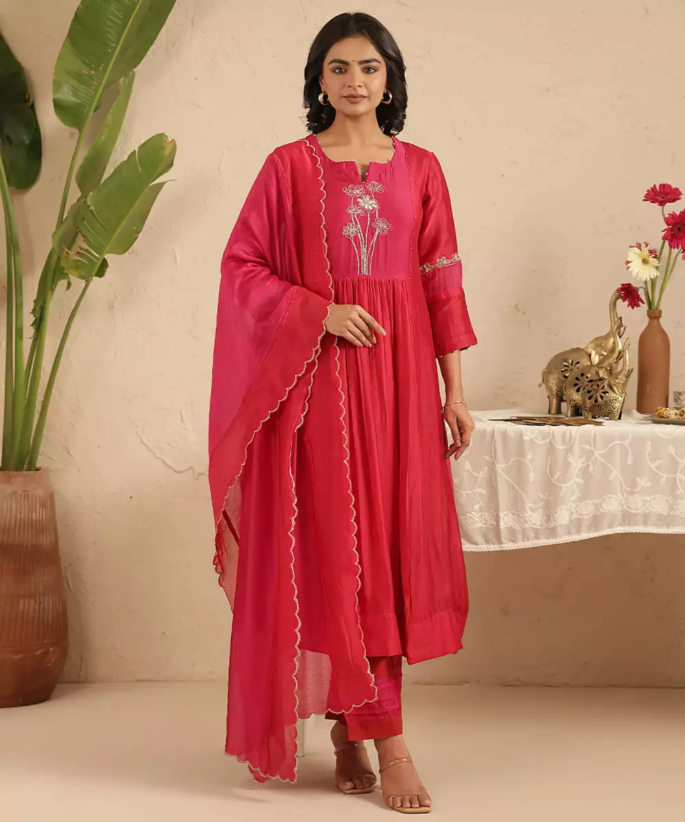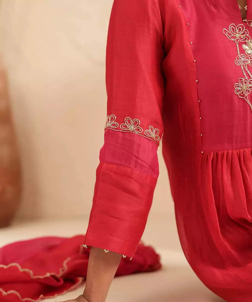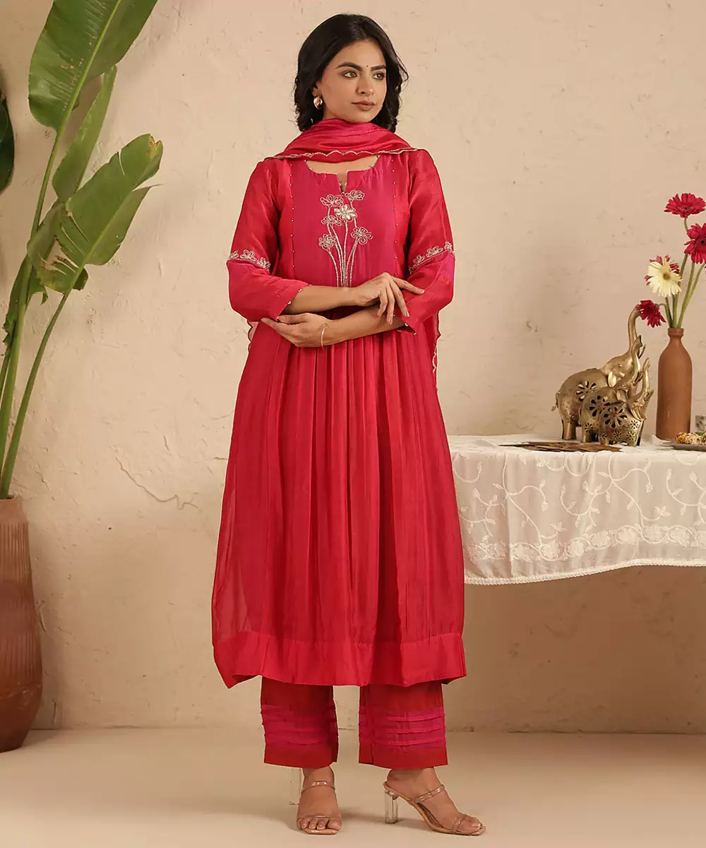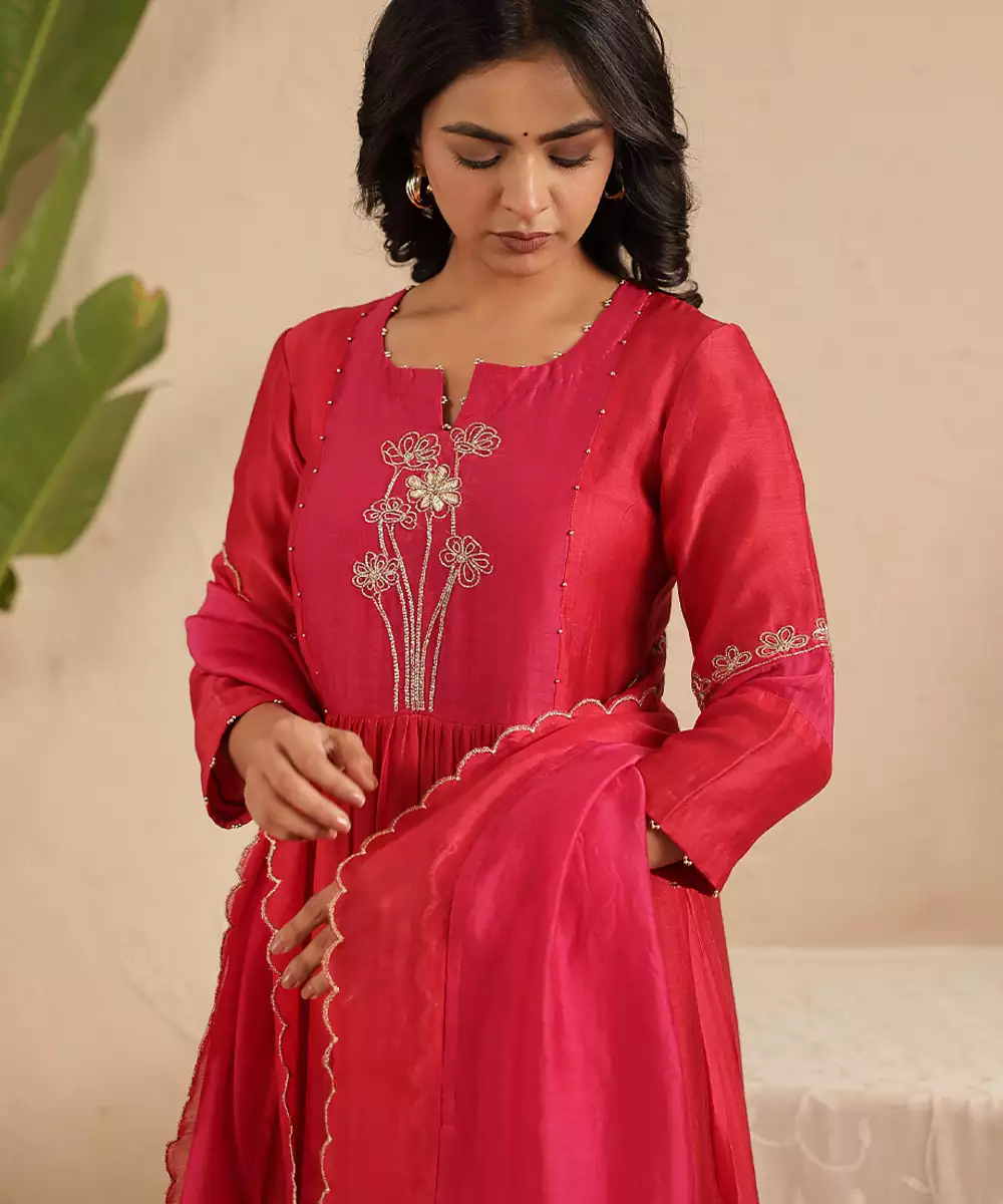 Shades Of Red And Hotpink Have Always Been The Topsellers Of Every Season Because Of Their Happy And Vibrant Vibe. This One Is No Different. The Intricate Detailing On The Sleeves And Yoke Makes It All The More Appealing.