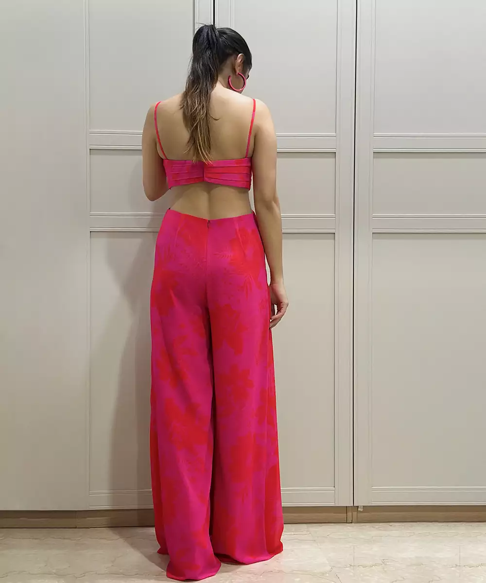 Pink/Red Printed Jumpsuit With Pleats On Body. Color : Pink/Red Fabric : Georgette Components : 1 (Jumpsuit) Work :Printed