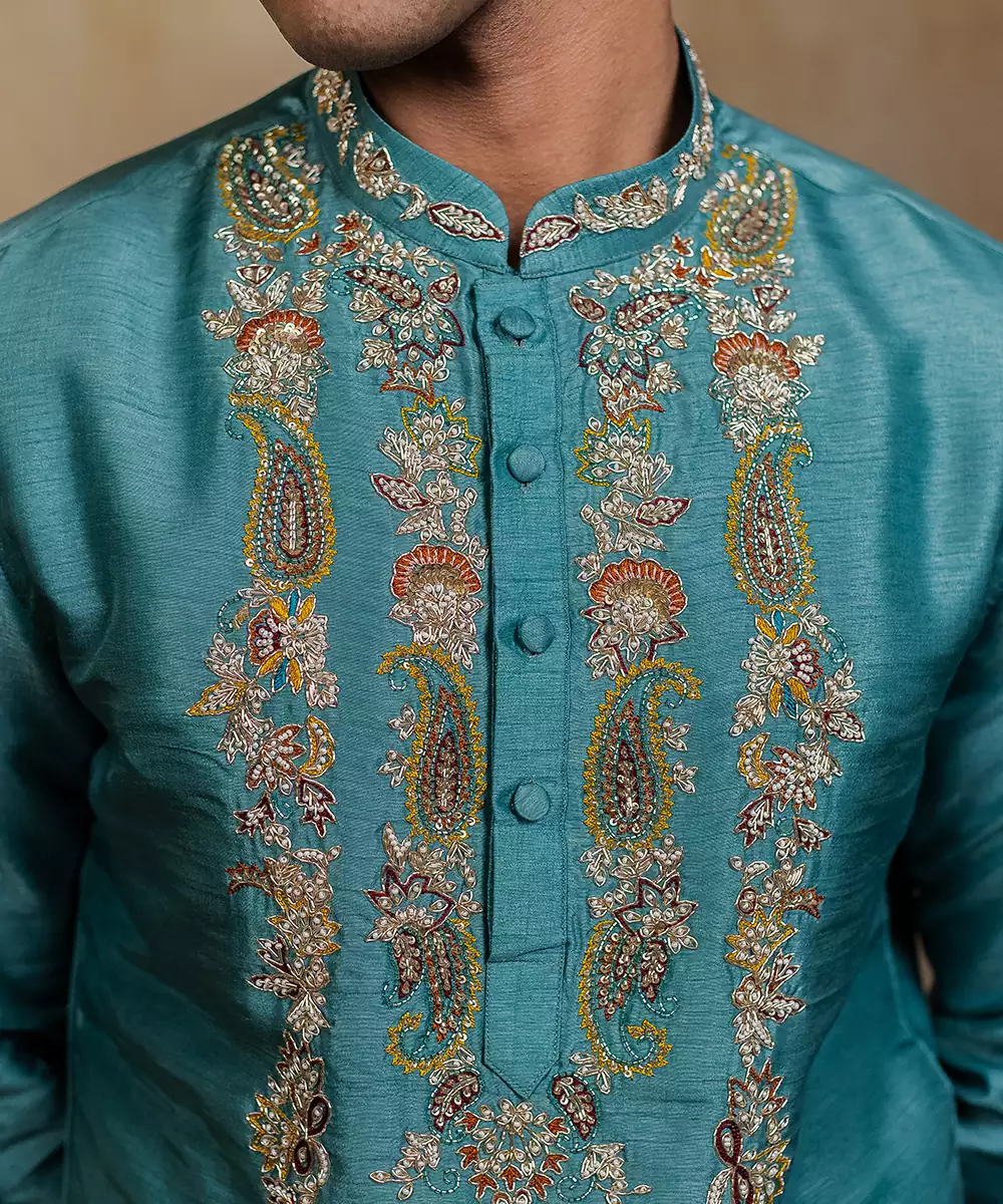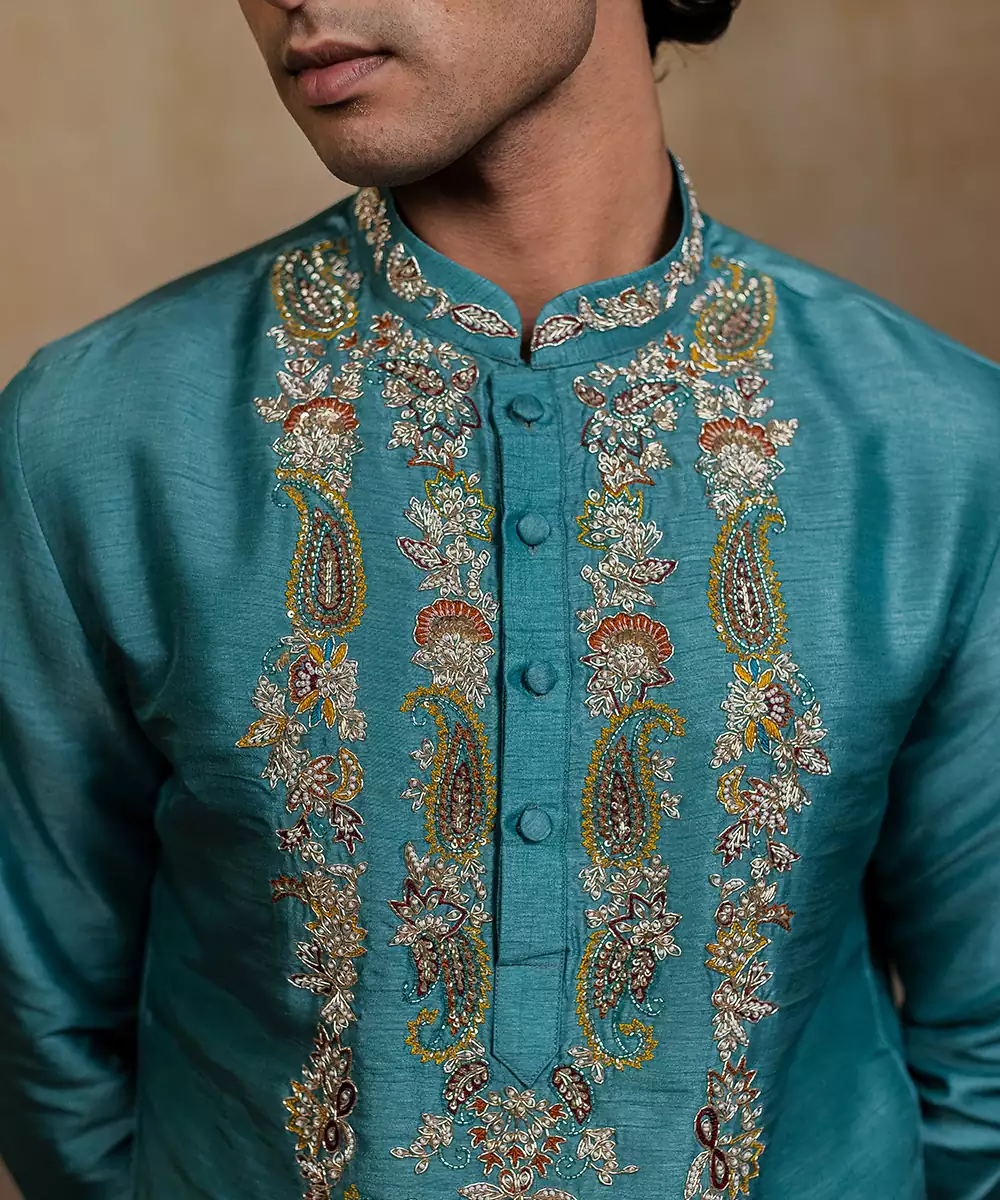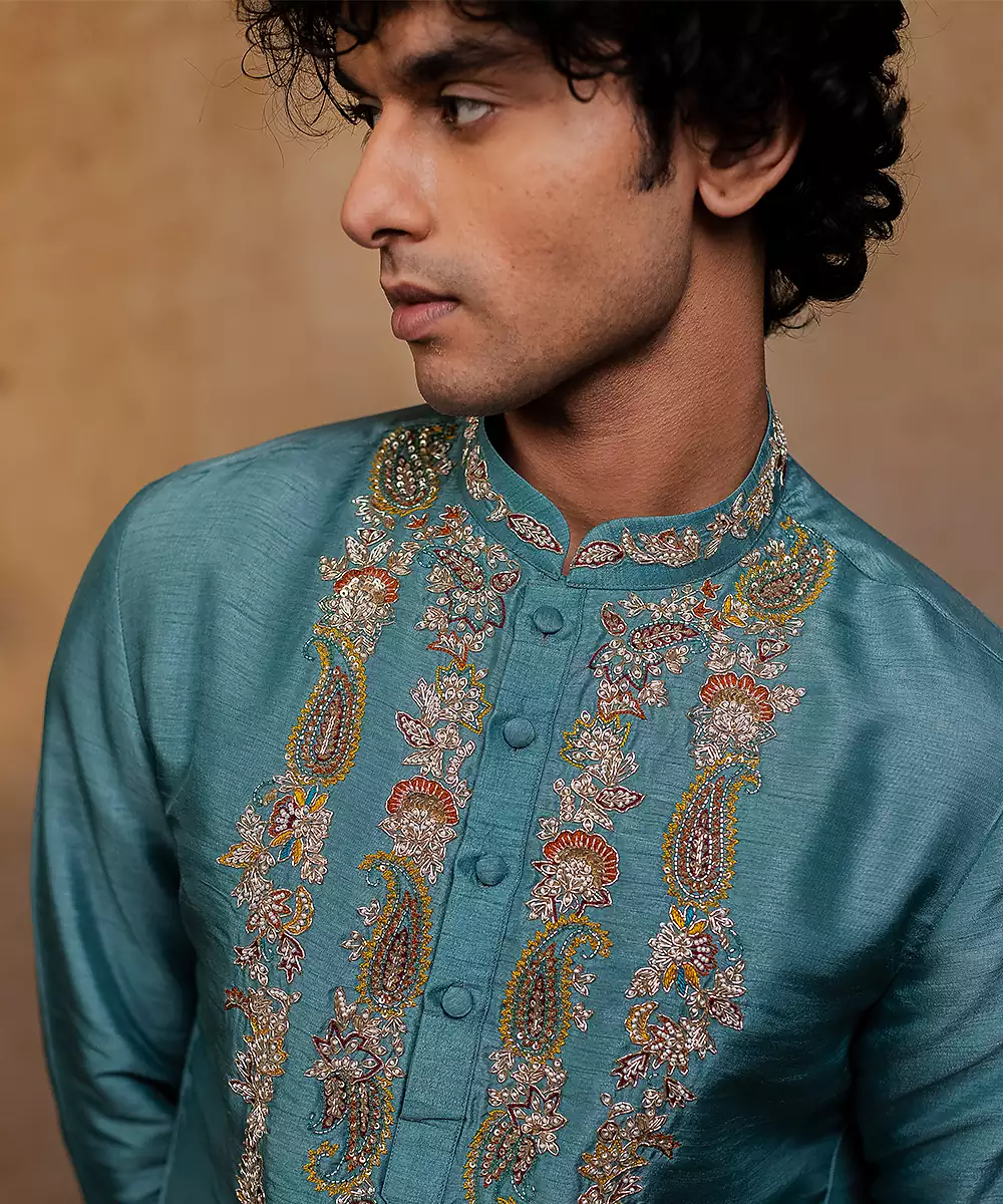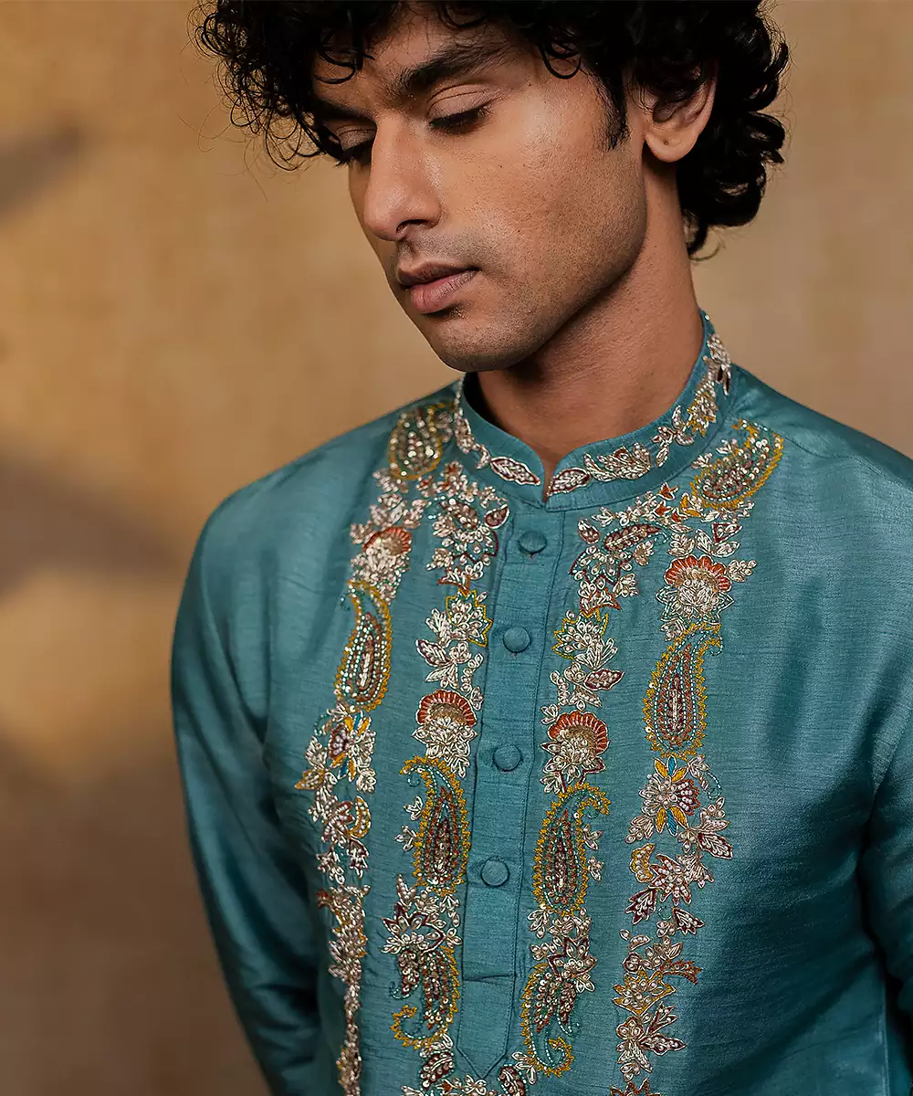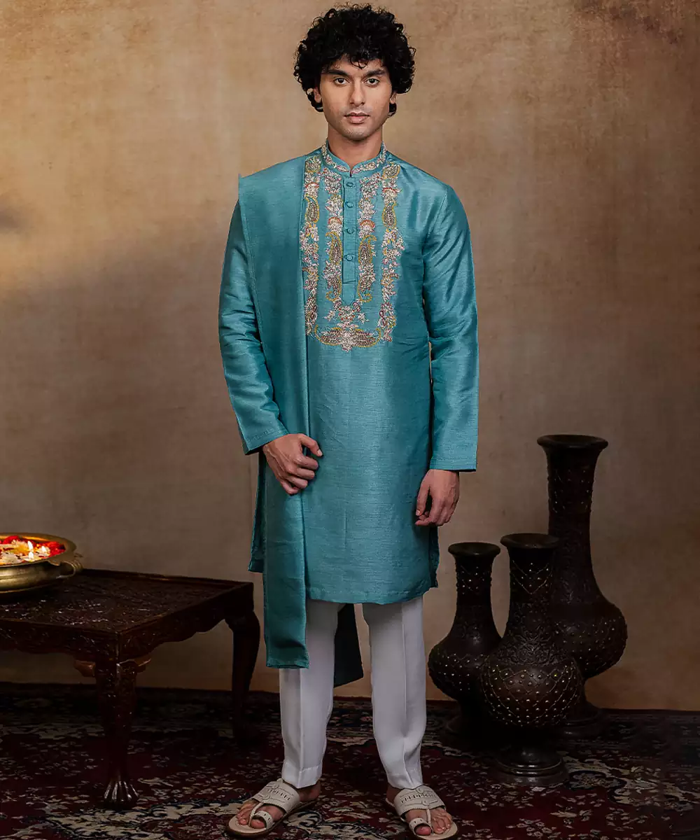 Falling Raw Silk Is A Luxurious Fabric That Combines The Rich Texture Of Raw Silk With The Lightweight, Breathable Comfort Of Viscose, Giving It A Soft Hand Feel And Graceful Drape. Unlike Traditional Raw Silk, Which Can Feel Stiff, This Fabric Flows Effortlessly While Retaining The Signature Slub And Sheen, Making It Ideal For Festive Kurtas. Its Unique Structure Allows Both Hand And Machine Embroidery To Stand Out Beautifully,