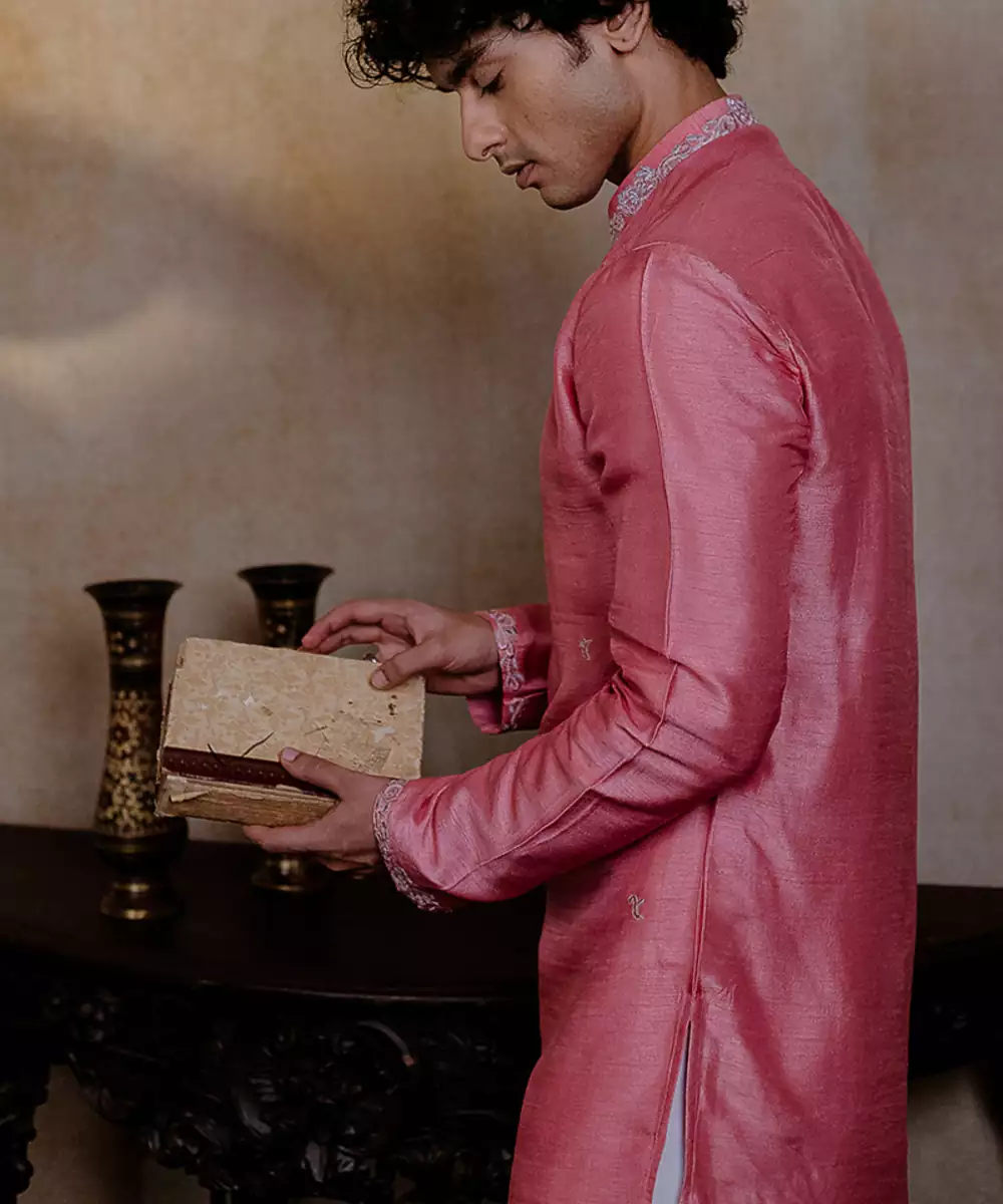 Falling Raw Silk Is A Luxurious Fabric That Combines The Rich Texture Of Raw Silk With The Lightweight, Breathable Comfort Of Viscose, Giving It A Soft Hand Feel And Graceful Drape. Unlike Traditional Raw Silk, Which Can Feel Stiff, This Fabric Flows Effortlessly While Retaining The Signature Slub And Sheen, Making It Ideal For Festive Kurtas. Its Unique Structure Allows Both Hand And Machine Embroidery To Stand Out Beautifully,
