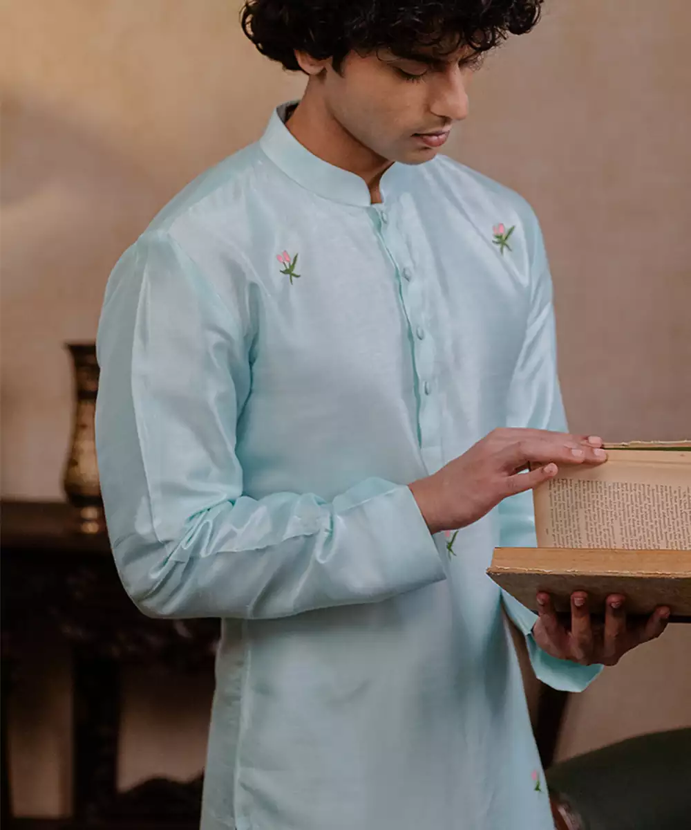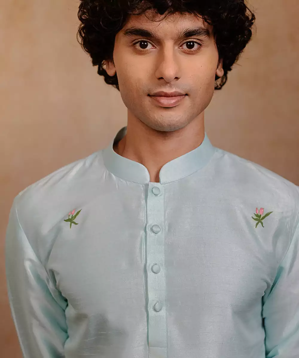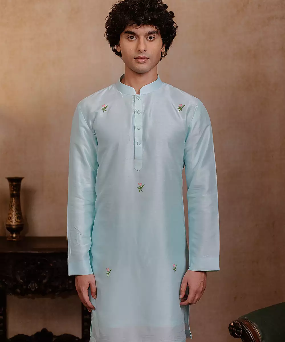 Falling Raw Silk Is A Luxurious Fabric That Combines The Rich Texture Of Raw Silk With The Lightweight, Breathable Comfort Of Viscose, Giving It A Soft Hand Feel And Graceful Drape. Unlike Traditional Raw Silk, Which Can Feel Stiff, This Fabric Flows Effortlessly While Retaining The Signature Slub And Sheen, Making It Ideal For Festive Kurtas. Its Unique Structure Allows Both Hand And Machine Embroidery To Stand Out Beautifully,