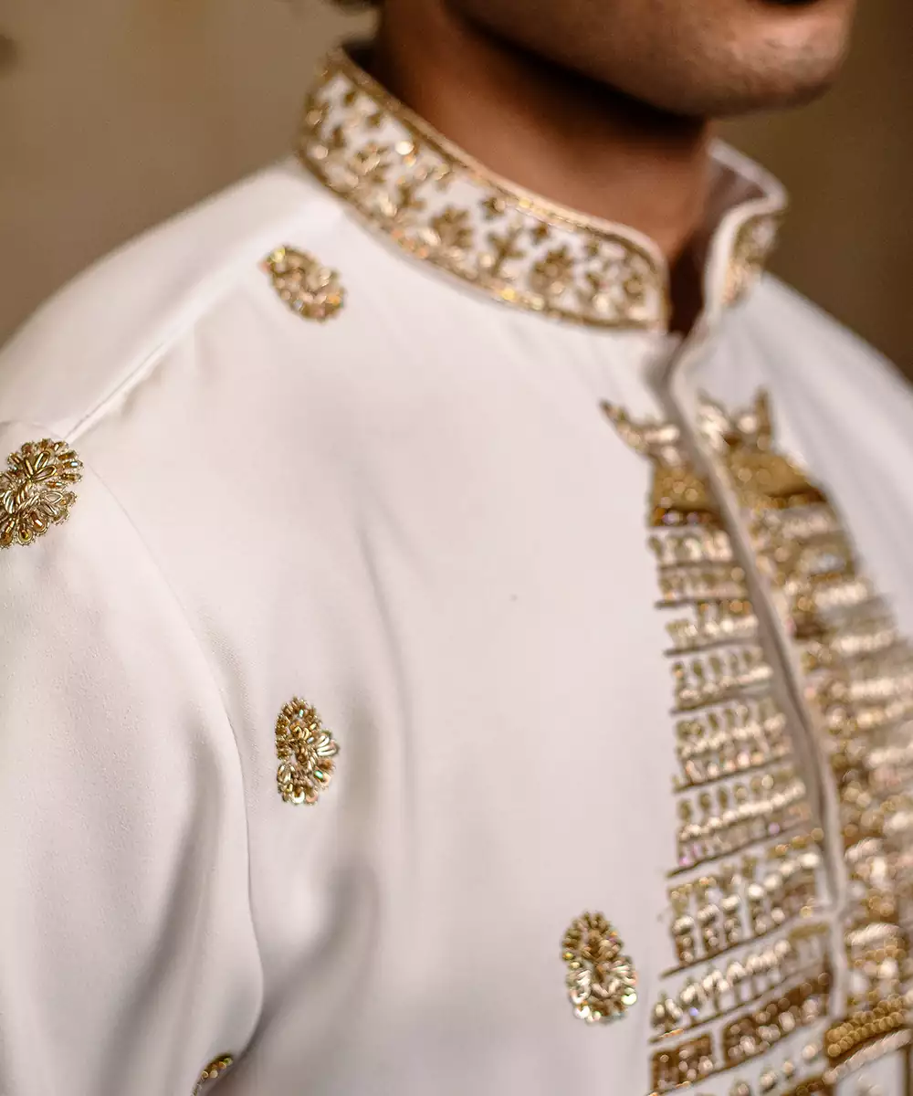 Falling Raw Silk Is A Luxurious Fabric That Combines The Rich Texture Of Raw Silk With The Lightweight, Breathable Comfort Of Viscose, Giving It A Soft Hand Feel And Graceful Drape. Unlike Traditional Raw Silk, Which Can Feel Stiff, This Fabric Flows Effortlessly While Retaining The Signature Slub And Sheen, Making It Ideal For Festive Kurtas. Its Unique Structure Allows Both Hand And Machine Embroidery To Stand Out Beautifully,
