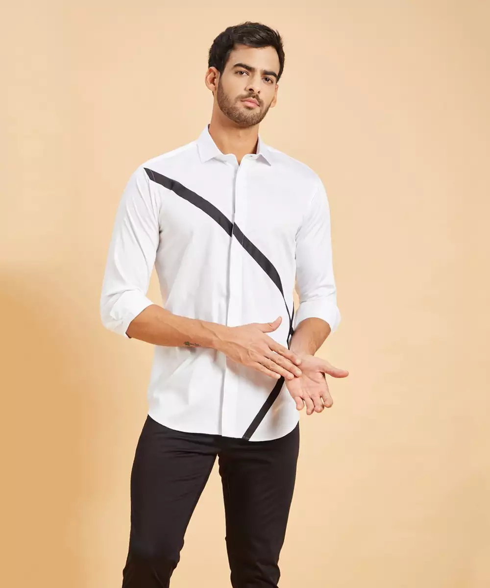 White Long Sleeved Shirt With Black Coloured V Shaped Pattern Is A Perfect Blend Of Comfort And Style. It Can Be Worn On Formal Occasions At Parties And Casual Outings. It Offers All Day Comfort With Pure And Breathable Cotton.
