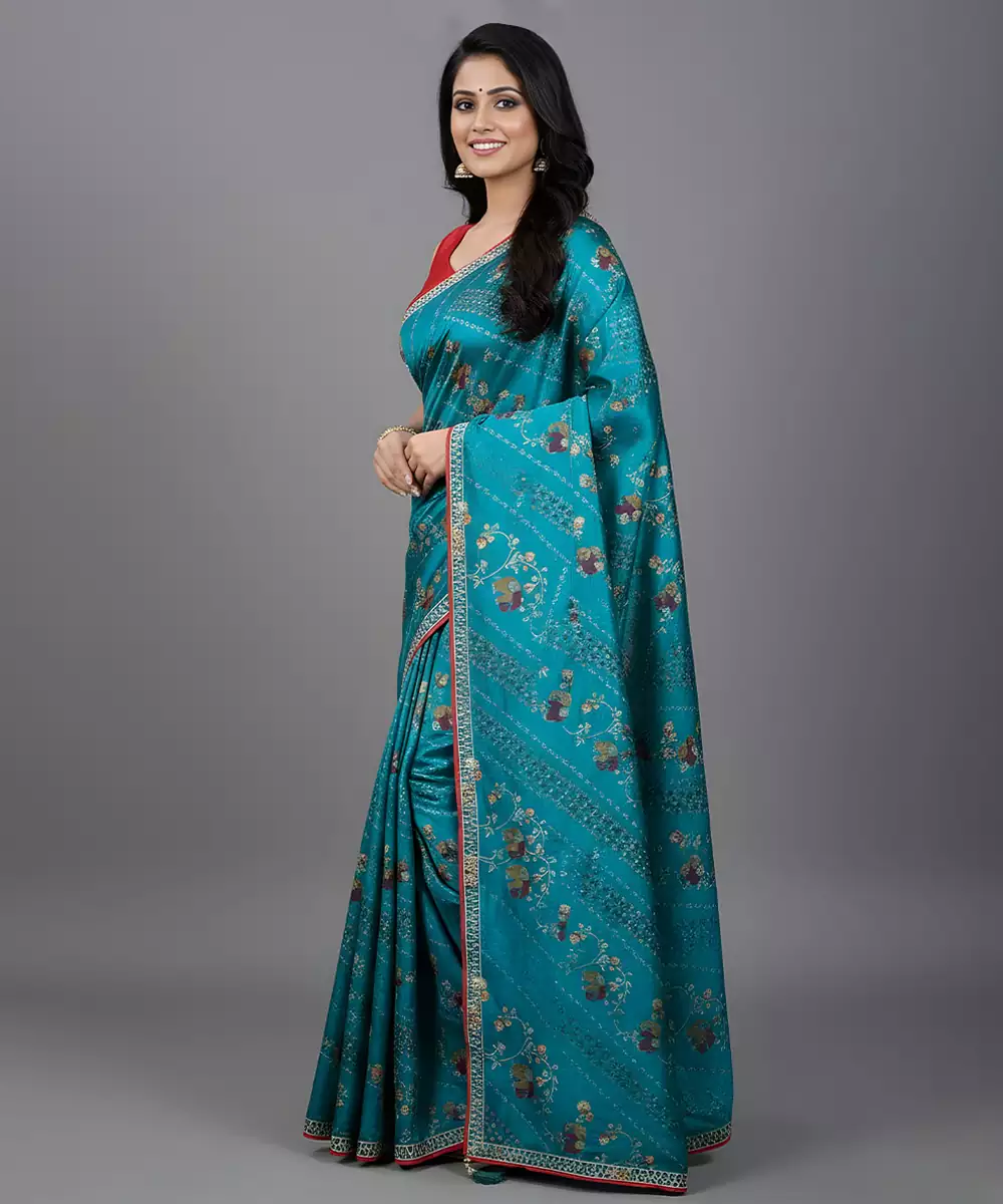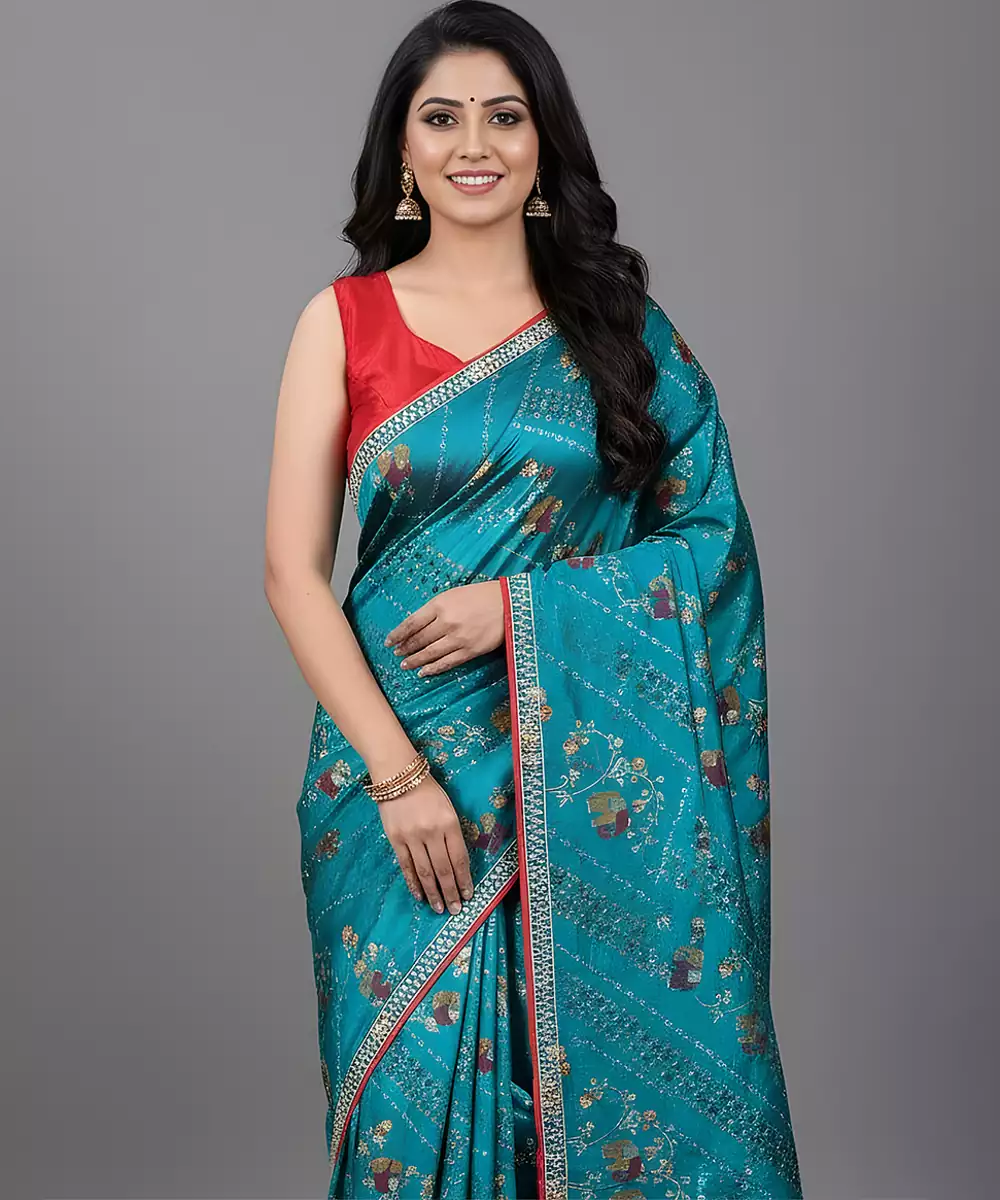 Blue Embroidered Satin Saree Featuring A Smooth, Glossy Finish And Elegant Drape. Adorned With Delicate Embroidery That Enhances Its Festive Charm. Soft And Luxurious, This Saree Is Perfect For Weddings, Celebrations, And Special Occasions, Adding A Radiant, Graceful Touch To Traditional And Contemporary Ensembles.