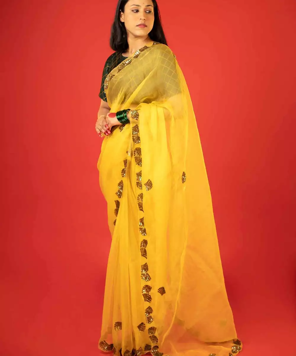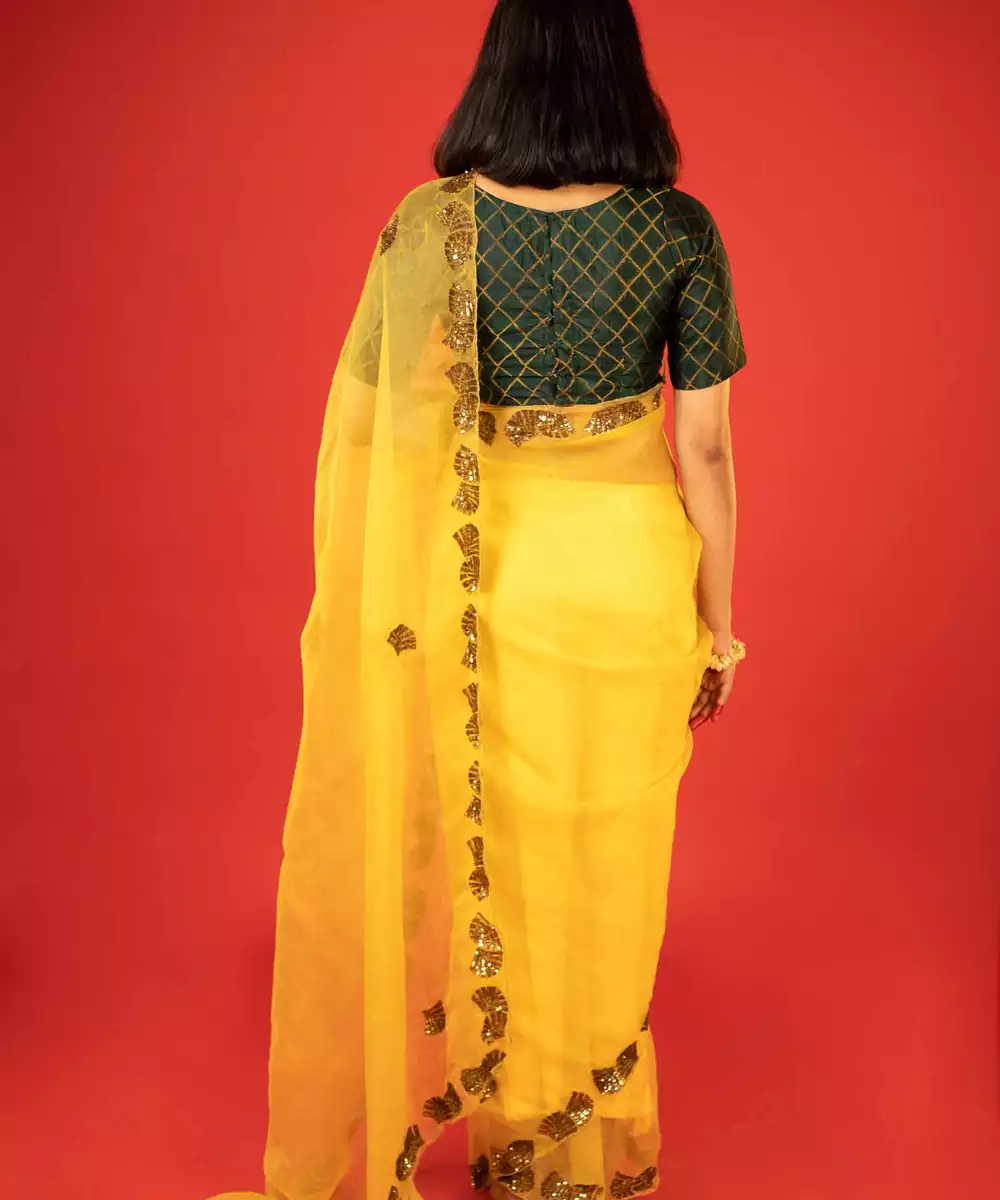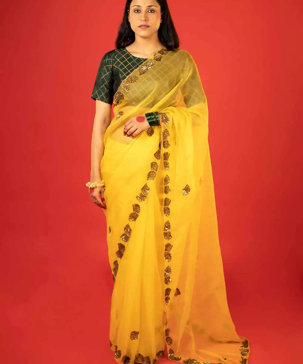 Deetya Is A Radiant Yellow Silk Organza Saree, Hand Embroidered With Antique Cutdana And Sequins. Featuring A Zari Scallop Border, It Glows With Festive Warmth And Refined Elegance—Ideal For Haldi, Daytime Celebrations, And Sacred, Light Filled Occasions.