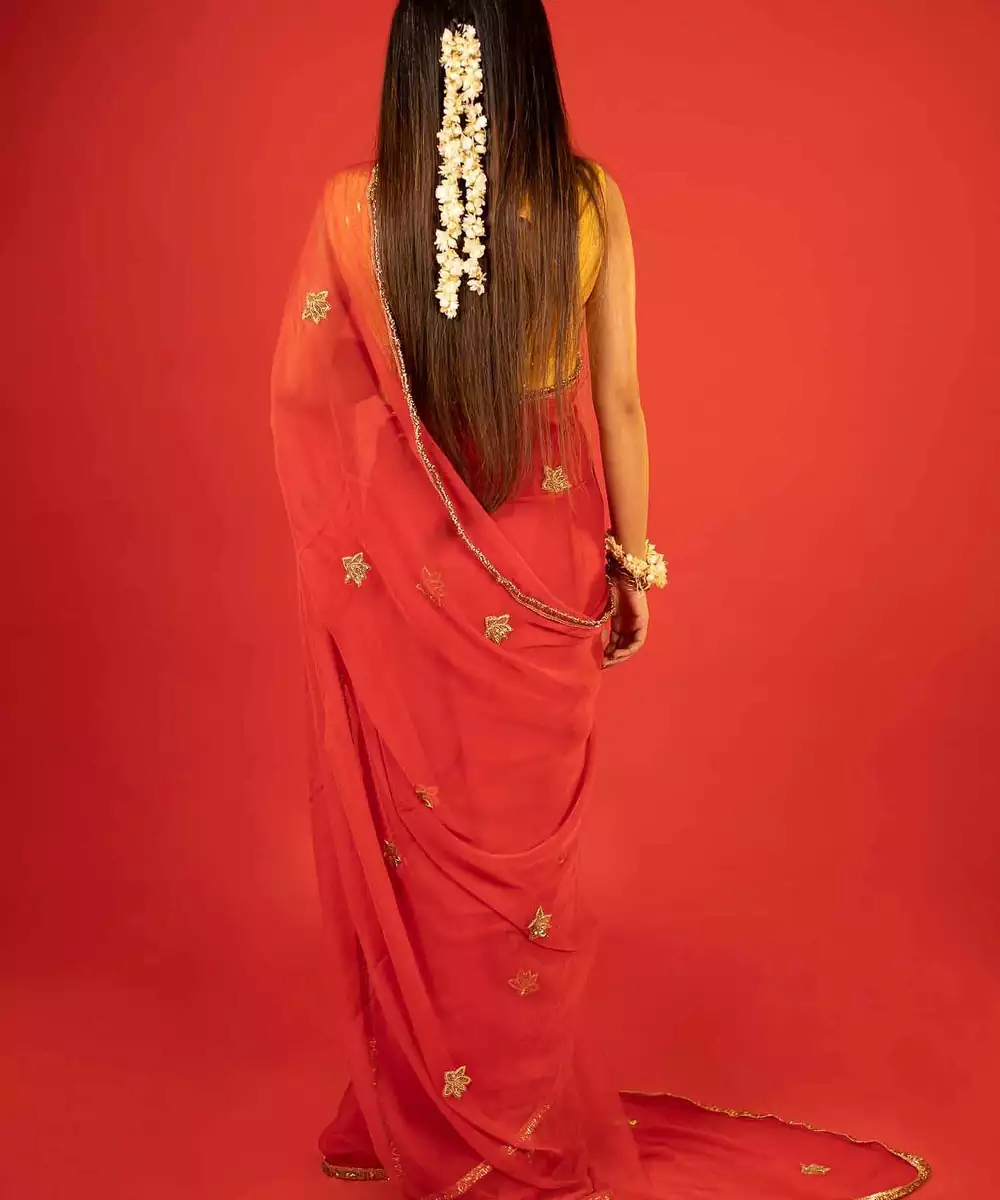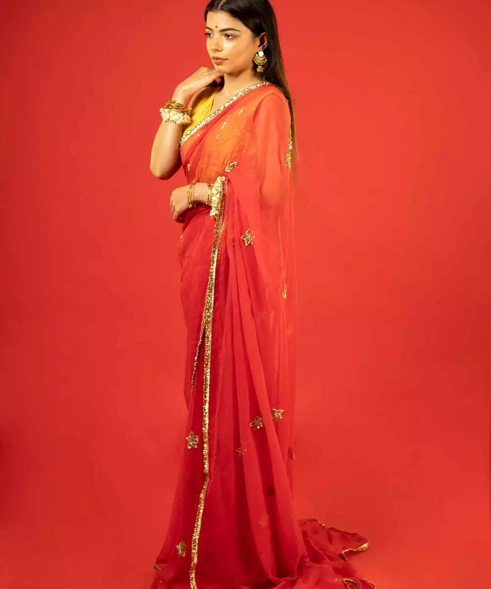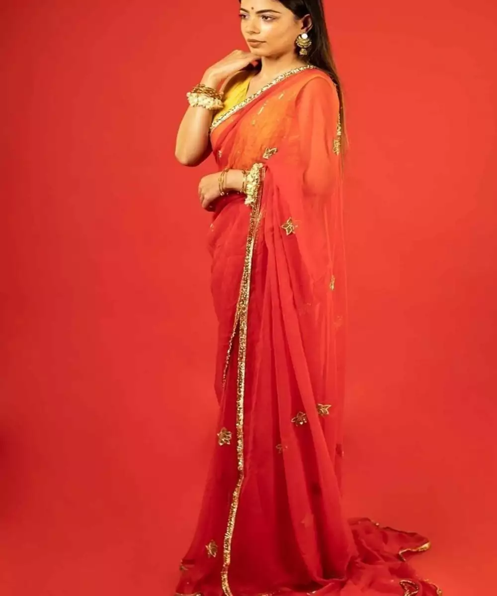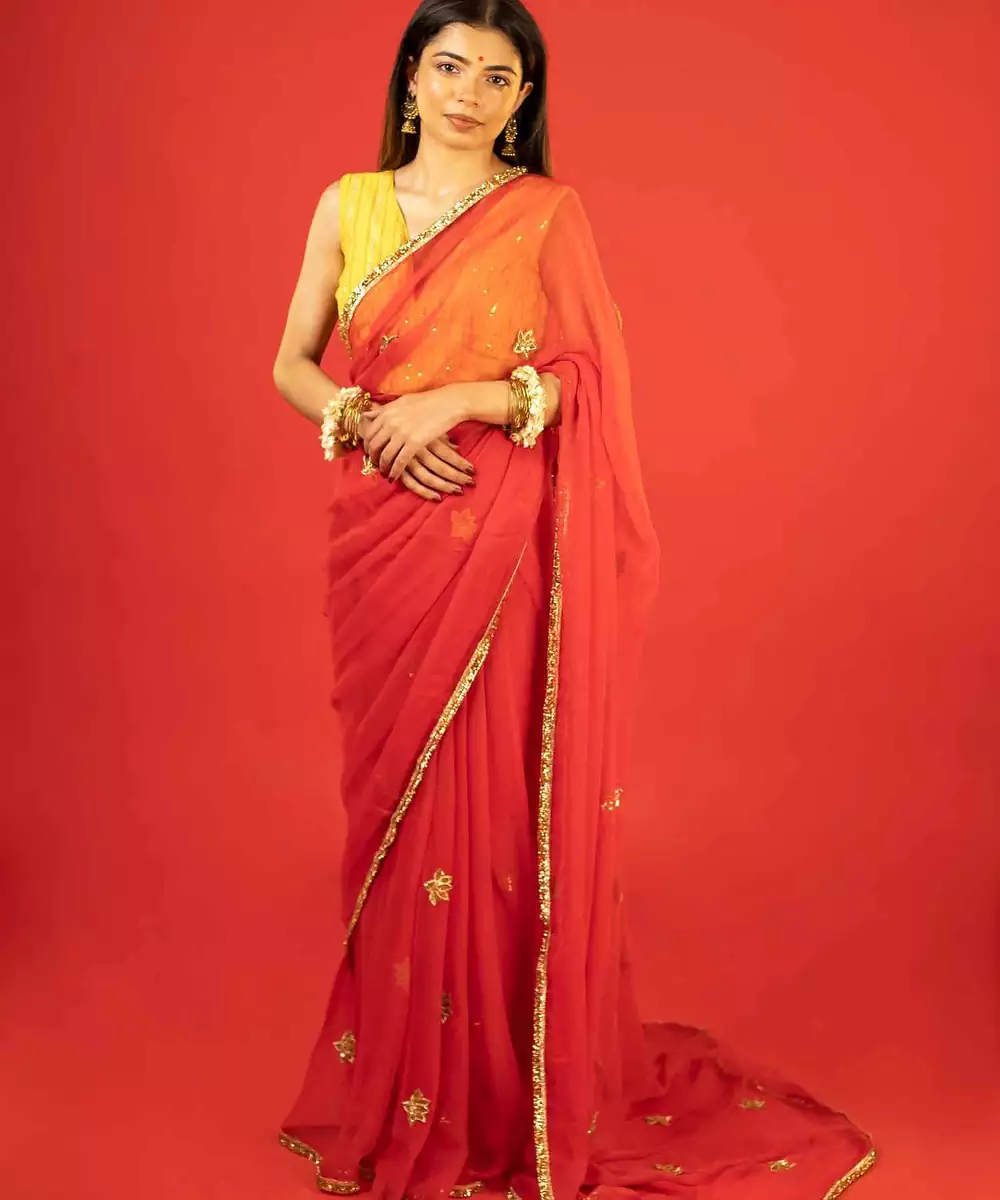 Shree Is A Red Chiffon Saree, Hand Embroidered With Antique Sequins And Dabka Work For A Rich, Graceful Shimmer. Accented With Golden Lace Borders, It Exudes Timeless Elegance—Perfect For Weddings, Festivals, And Celebrations Steeped In Tradition And Beauty.