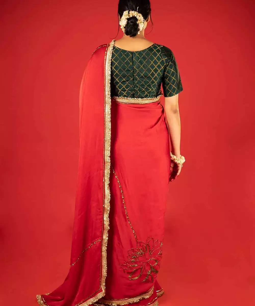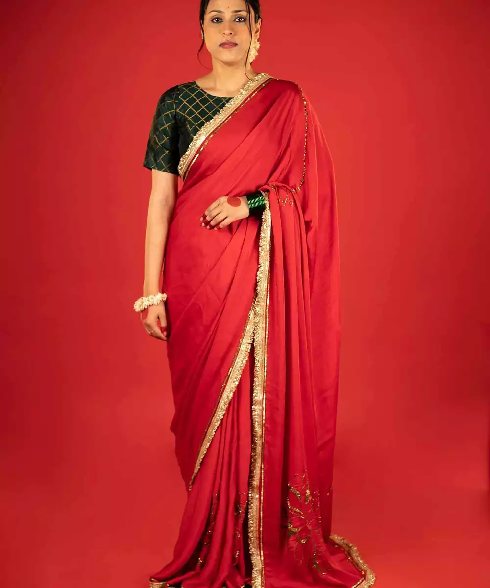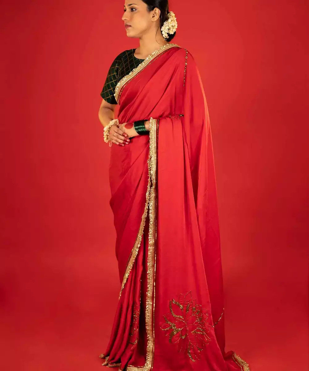 Kishori Is A Striking Red Satin Georgette Saree, Hand Embroidered With Antique Cutdana And Sequins. Finished With Ornate Borders And Golden Lace, It Radiates Regal Charm—Perfect For Weddings, Festive Nights, And Grand Celebrations Steeped In Timeless Tradition.