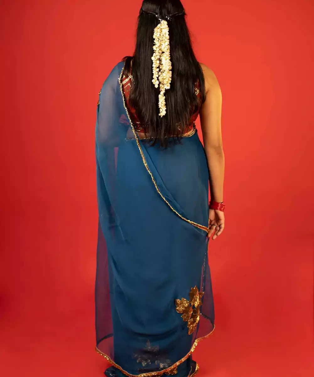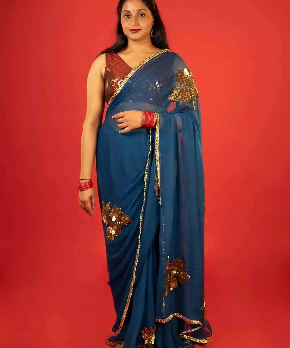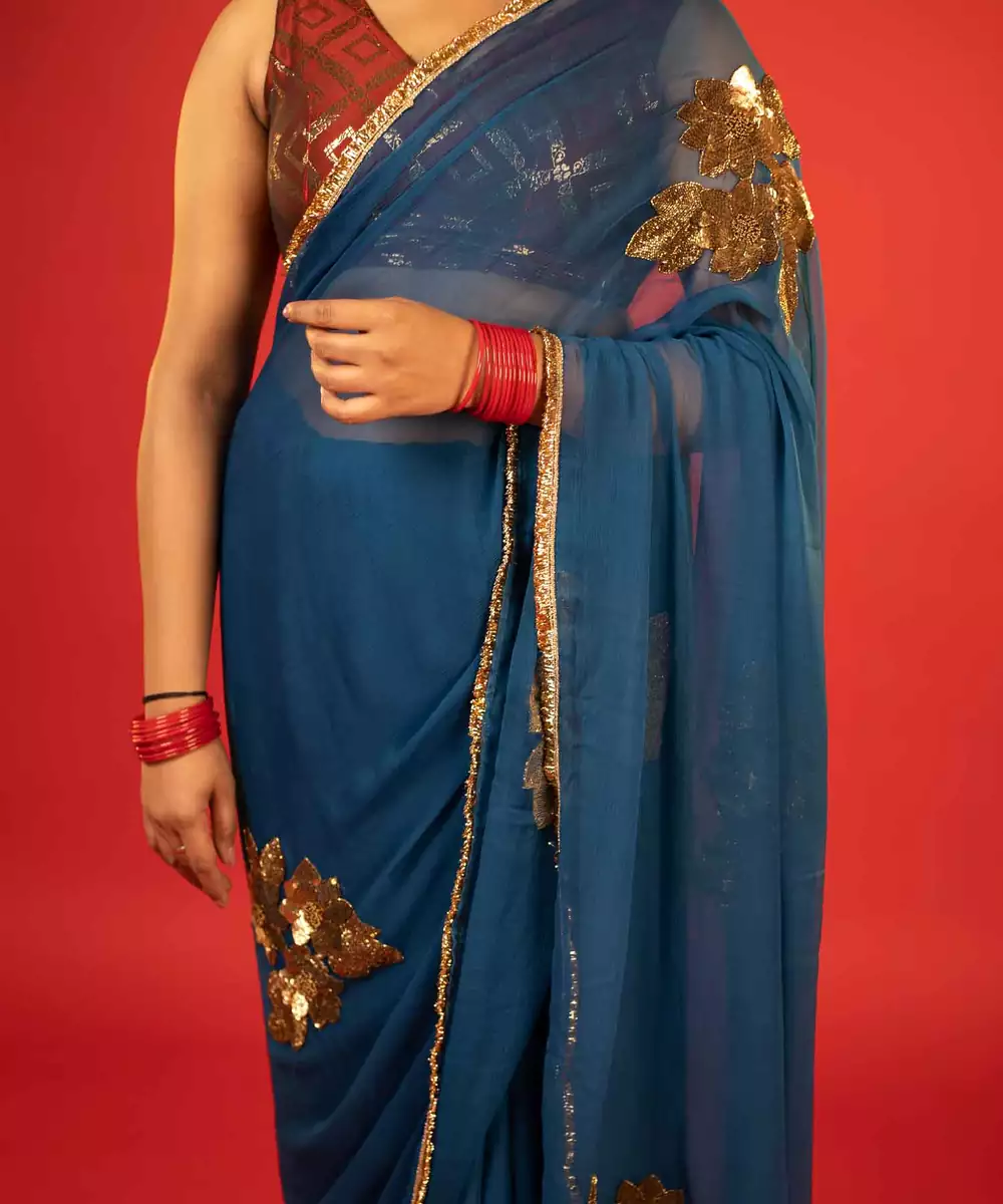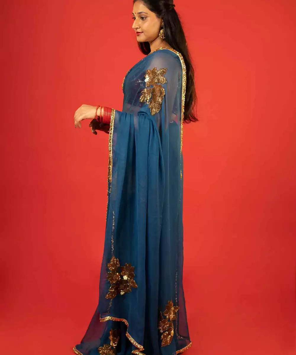 Ahalya Is A Marine Blue Chiffon Saree, Exquisitely Hand Embroidered With Cutdana, Sequins, And Beads. Finished With Golden Lace Borders, It Drapes Gracefully—Perfect For Festive Soirées, Receptions, Or Spiritual Celebrations, Exuding Timeless Charm And Delicate Craftsmanship.