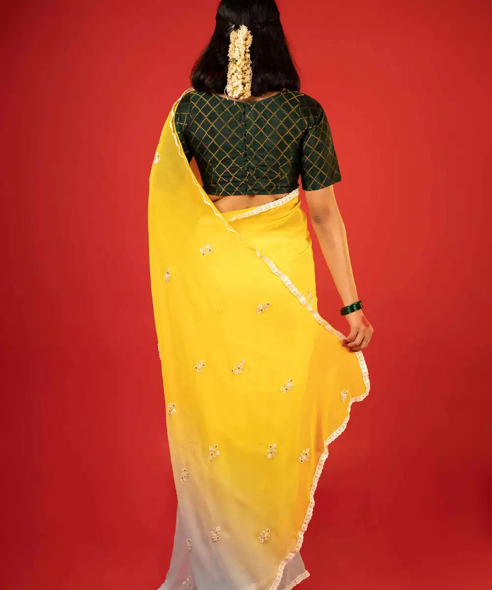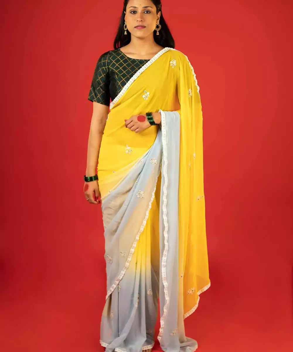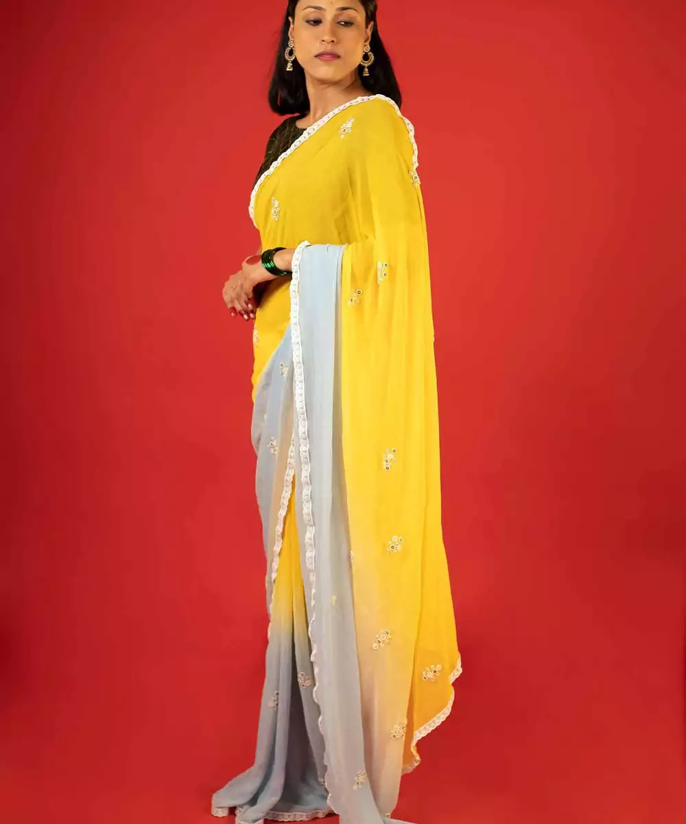 Dhriti Is A Yellow To Blue Ombre Saree In A Lightweight, Fluid Fabric, Hand Embroidered With Premium Beads For A Luxurious Shimmer. Finished With White Organza Lace, It Blends Modern Elegance With Tradition—Perfect For Summer Weddings, Rituals, Or Intimate Celebrations.