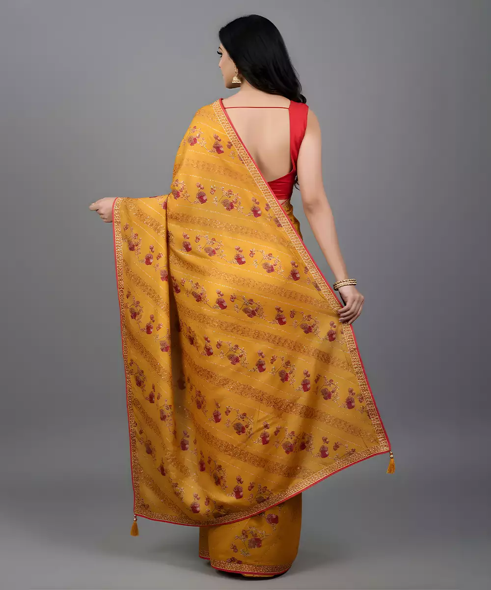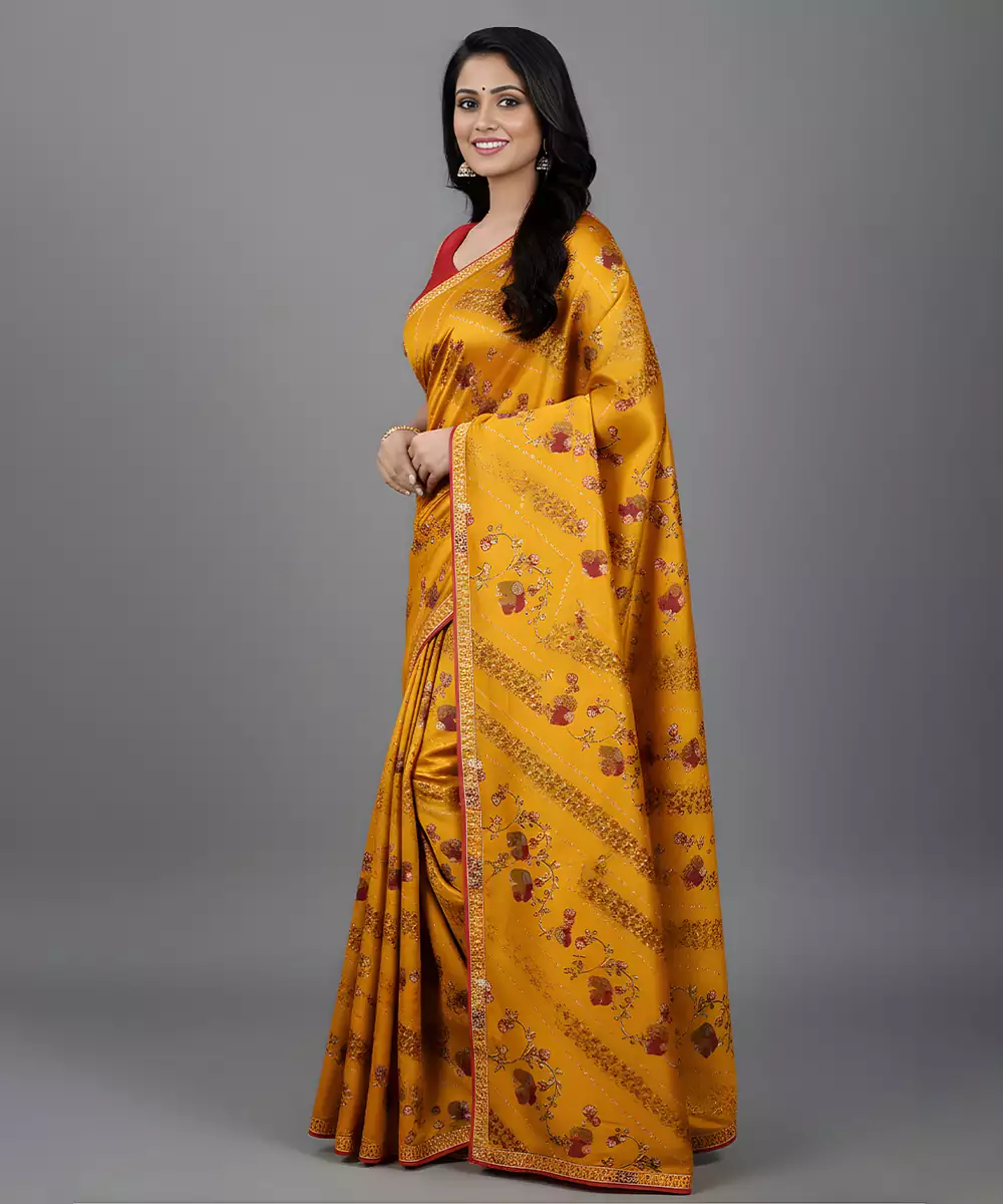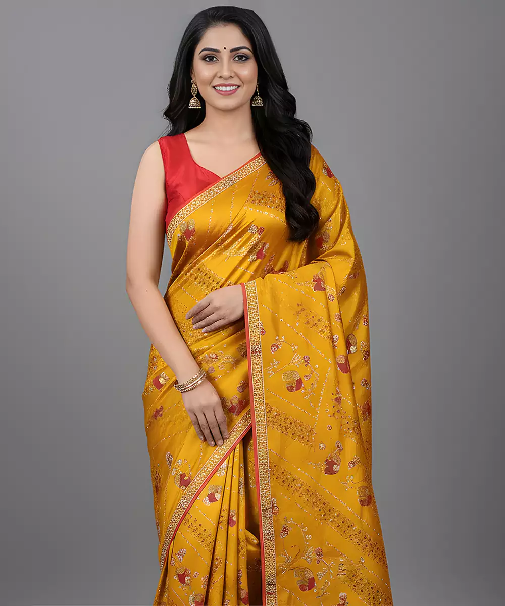 Yellow Embroidered Satin Saree Featuring A Smooth, Glossy Finish And Elegant Drape. Adorned With Delicate Embroidery That Enhances Its Festive Charm. Soft And Luxurious, This Saree Is Perfect For Weddings, Celebrations, And Special Occasions, Adding A Radiant, Graceful Touch To Traditional And Contemporary Ensembles.