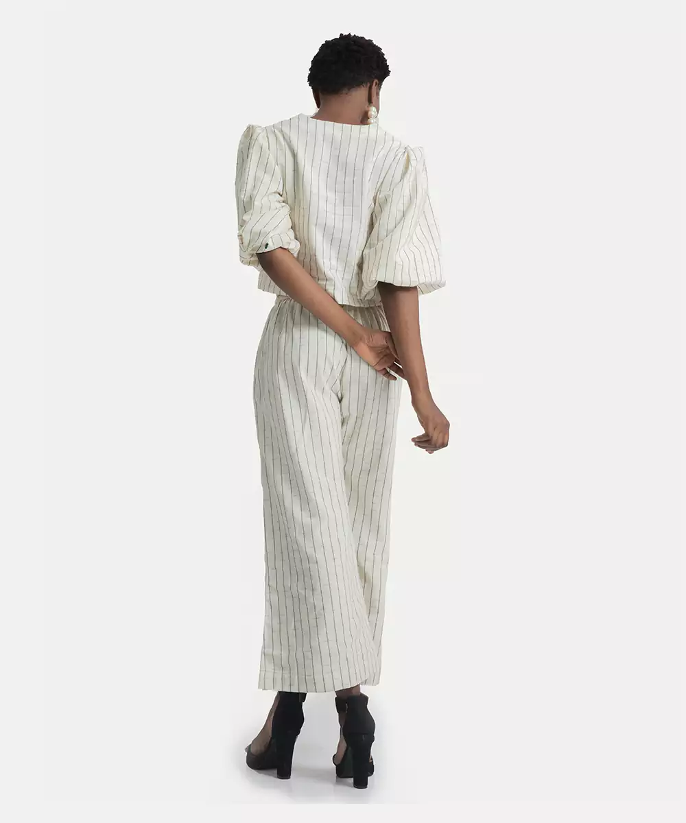 Perfect Combination Of Comfort And Style, The Claire Fleur Balloon Sleeve Co Ord Consists Of A Balloon Sleeves Short Blouse And Wide Legged Pants. The Blouse Features A V Neck With Floral Embroidery On One Side. The Front Is Adorned With Pearl Closure All Along. Paired With A Vintage Style Bell Bottom Trousers That Adds More Versitality To The Ensemble.