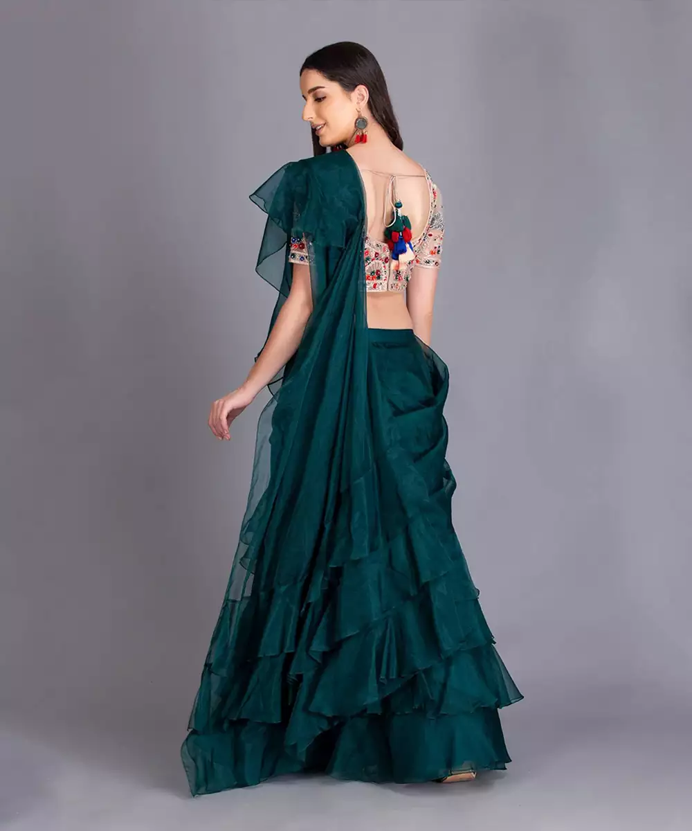 A Must Have For Your Word Ruffled Drapped Save With Multi Colour Thread Work Embroidery On The Blouse.