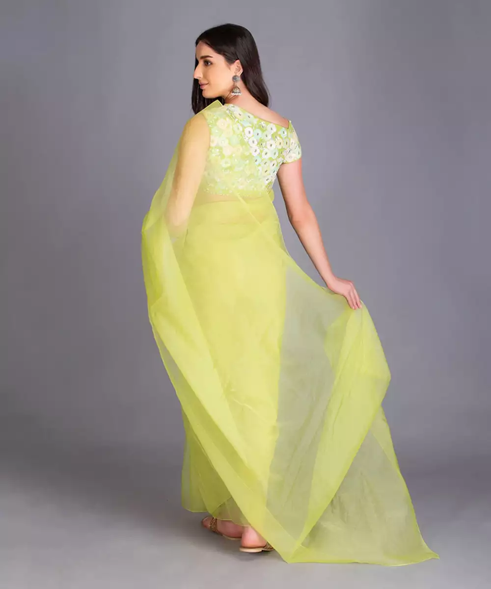 Look Super Classic In This Beautiful Silk Organza Pop Colour Save With Stylized On Shoulder Multi Colour Sequin Blouse.