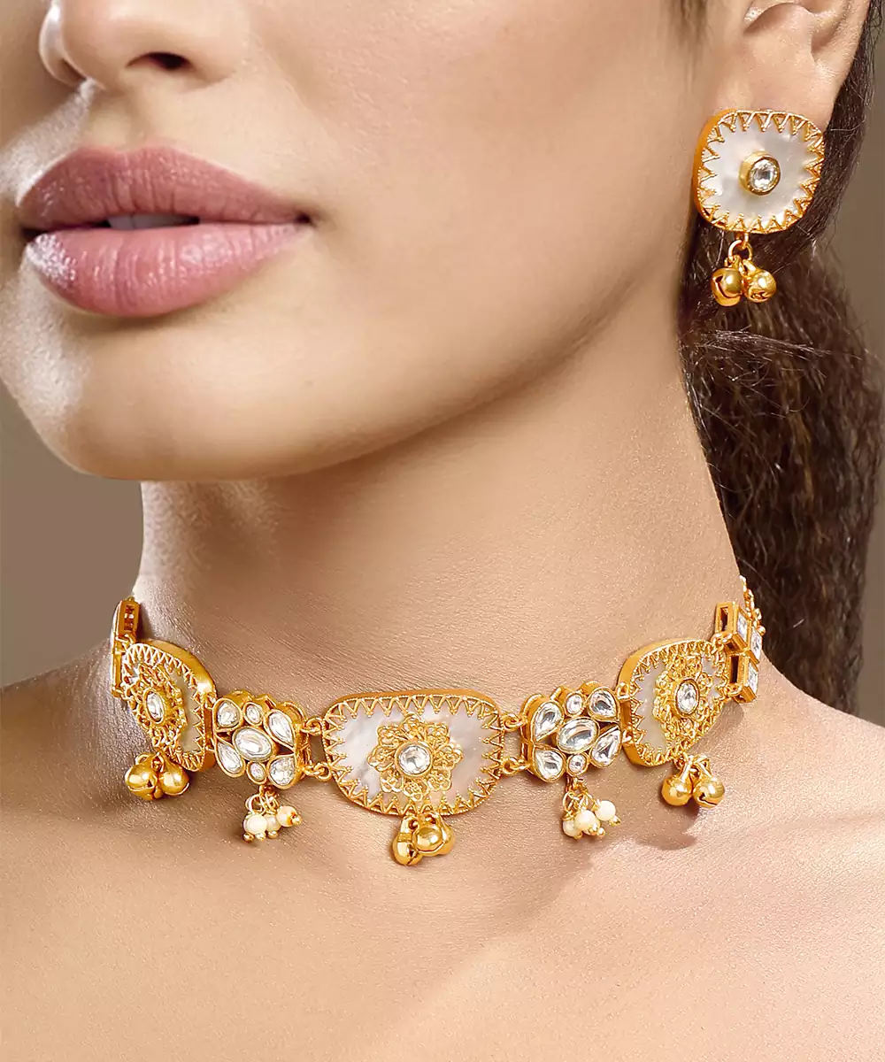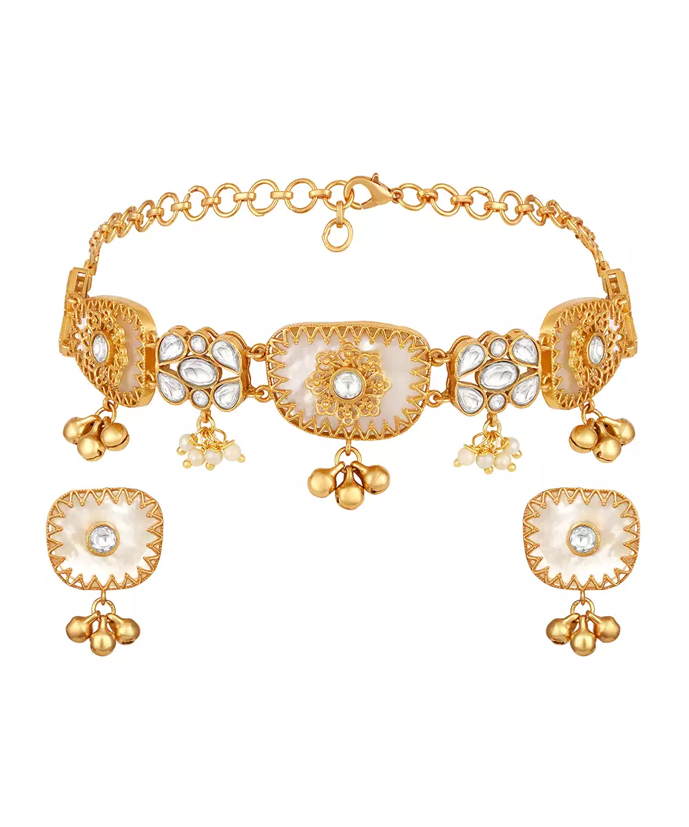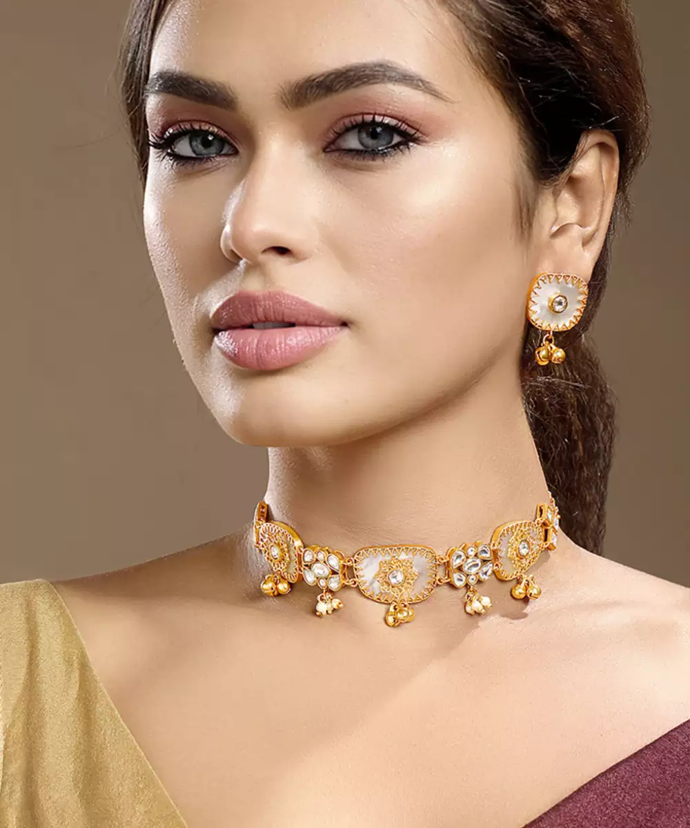 Elevate Your Festive Look With This Gold Plated Kundan Choker Necklace Set. Expertly Crafted With Intricate Detailing, It Reflects Timeless Tradition And Elegance. Perfect For Weddings, Celebrations, Or Cultural Events, This Stunning Choker Set Adds A Regal Touch And Graceful Sophistication To Any Ethnic Ensemble.