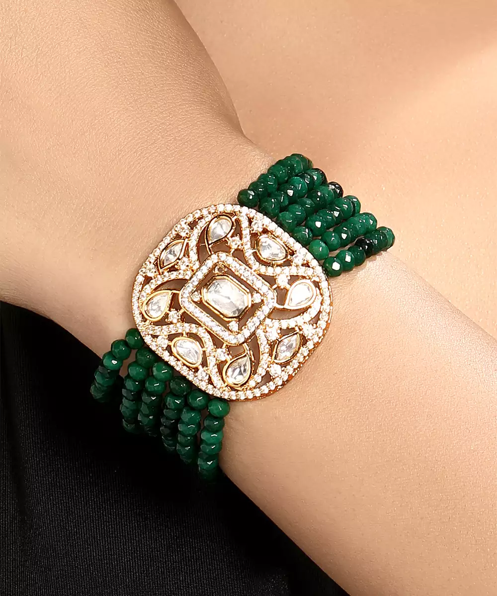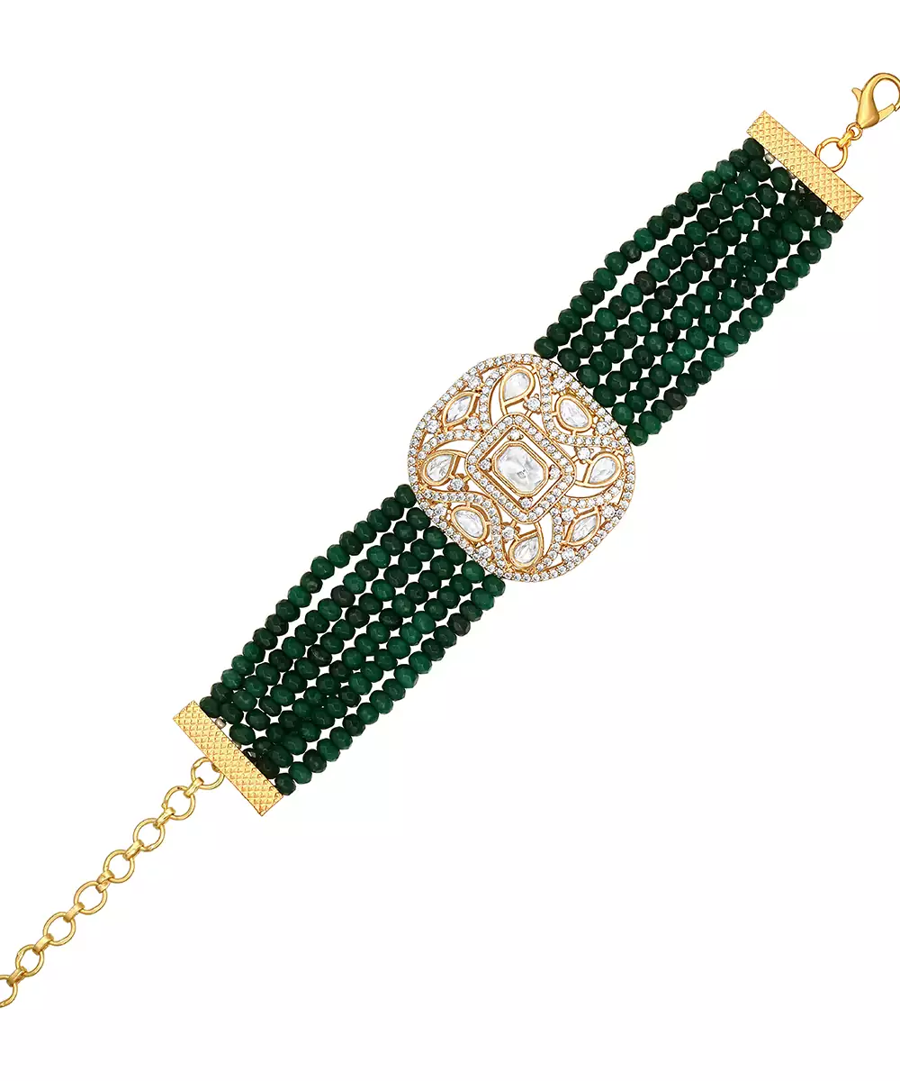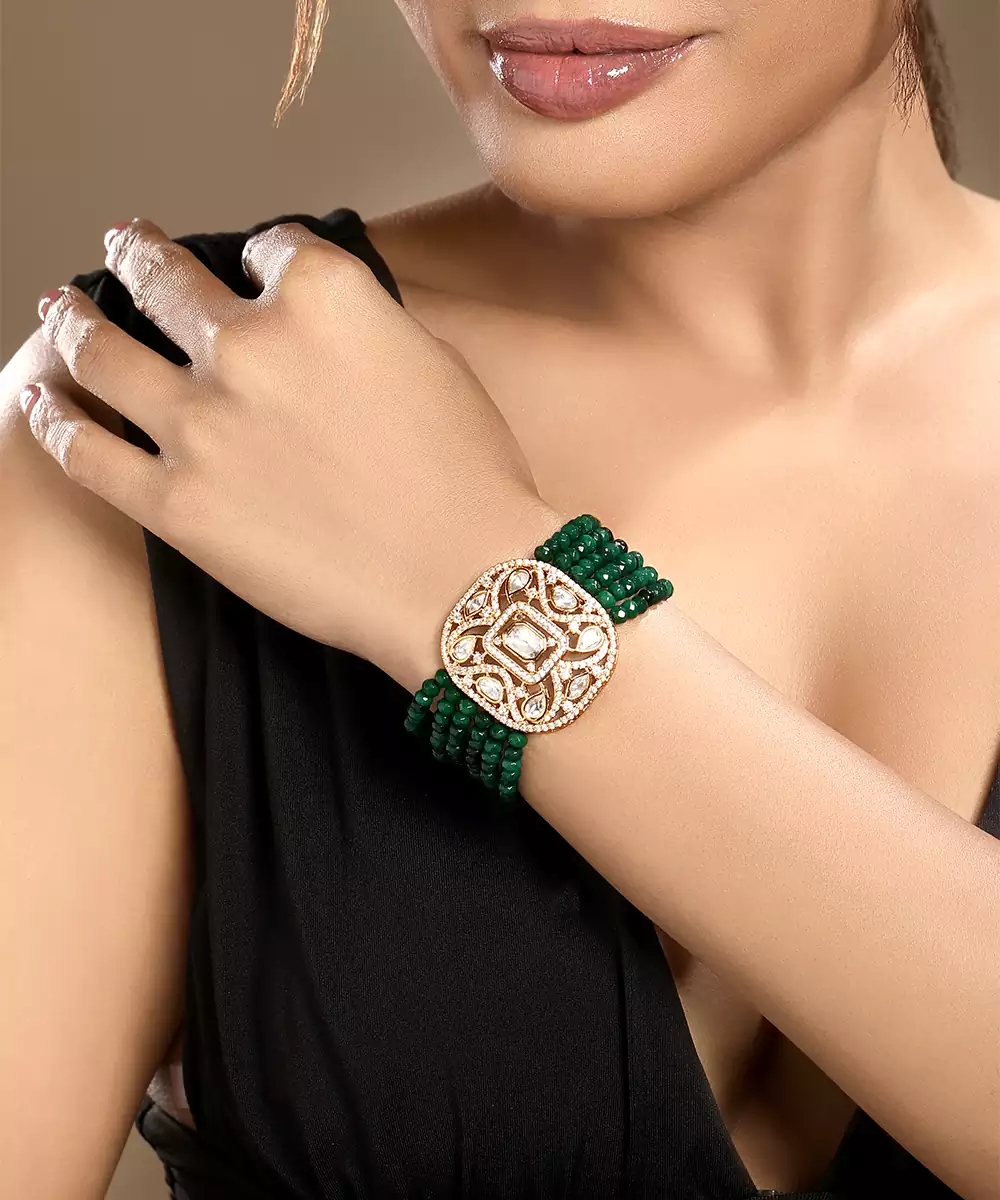 Add A Touch Of Elegance To Your Look With This Gold Plated Kundan Green Stones Bracelet. Beautifully Crafted With Intricate Detailing And Vibrant Green Stones, It Reflects Classic Kundan Artistry. Perfect For Festive Occasions, Weddings, Or Special Events, This Graceful Bracelet Enhances Both Traditional And Fusion Outfits With Timeless Charm.