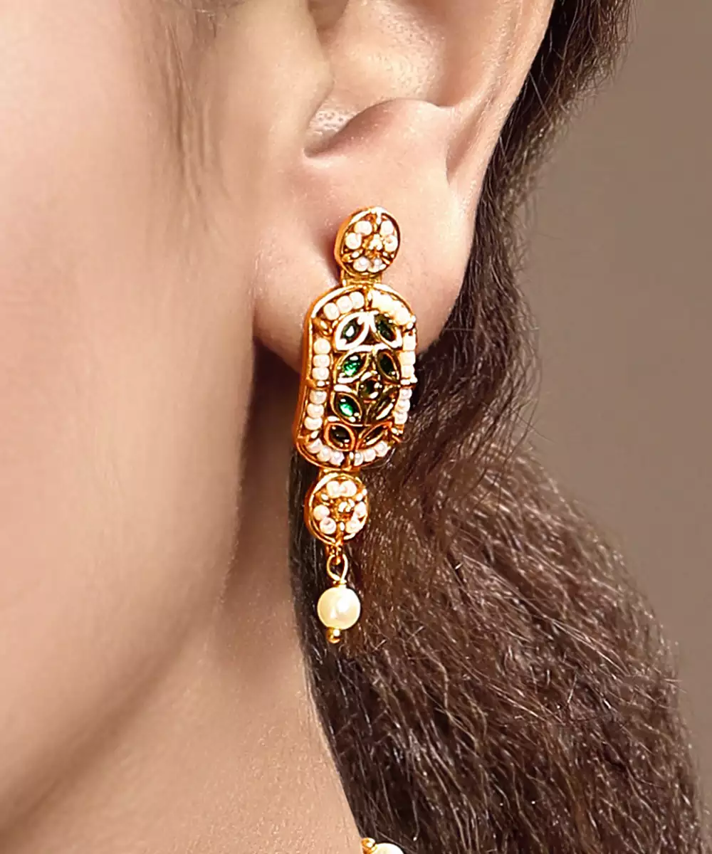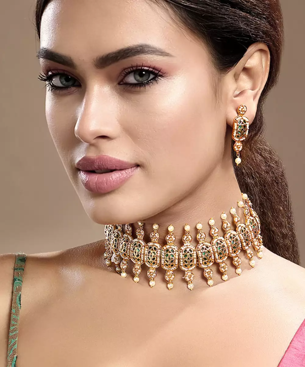 Enhance Your Festive Look With This Gold Plated Kundan Green Stones Choker Necklace Set. Designed With Intricate Craftsmanship And Vibrant Green Stones, It Offers A Perfect Blend Of Tradition And Elegance. Ideal For Weddings, Celebrations, Or Special Occasions, This Choker Set Adds Regal Charm And Refined Sophistication.
