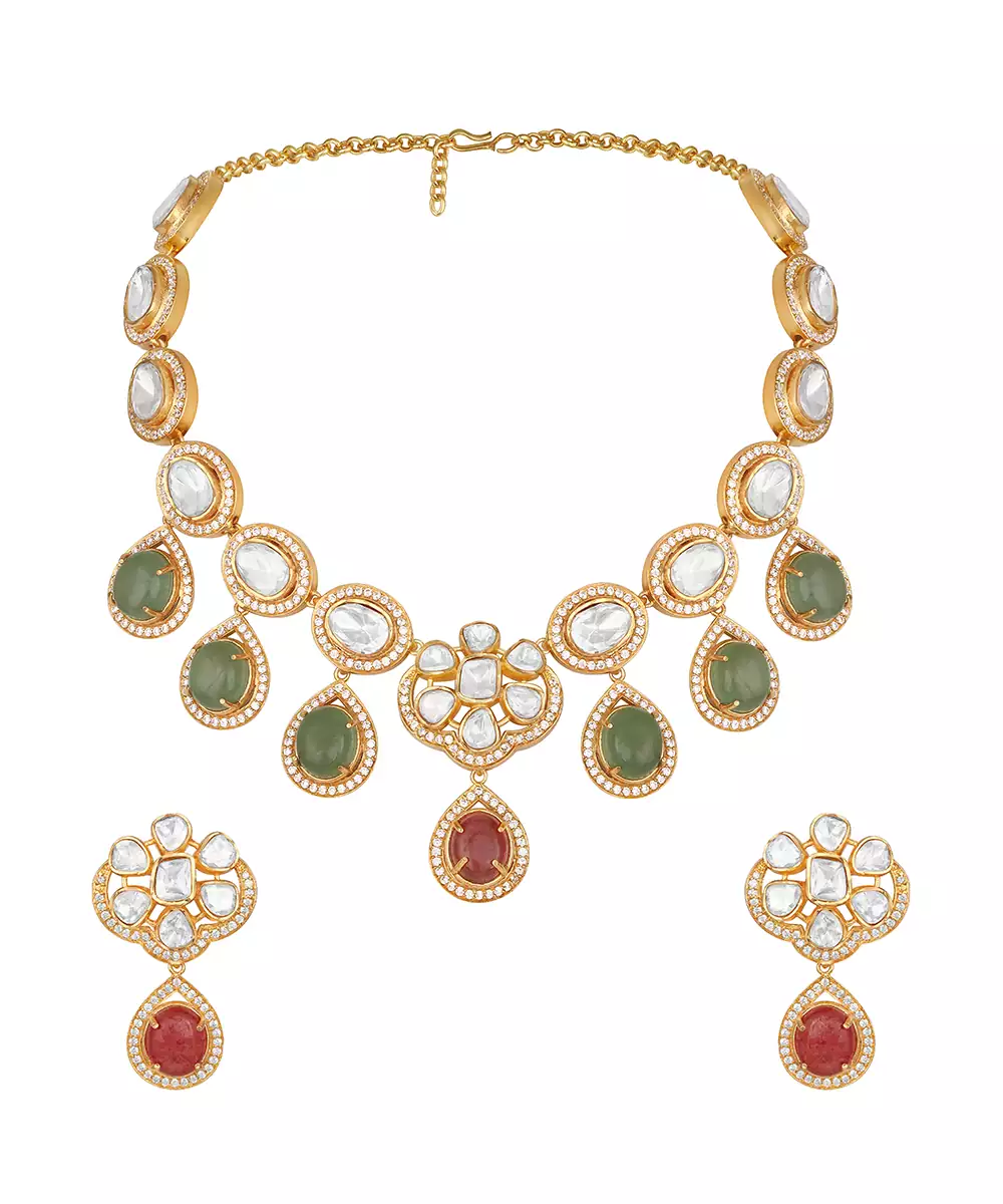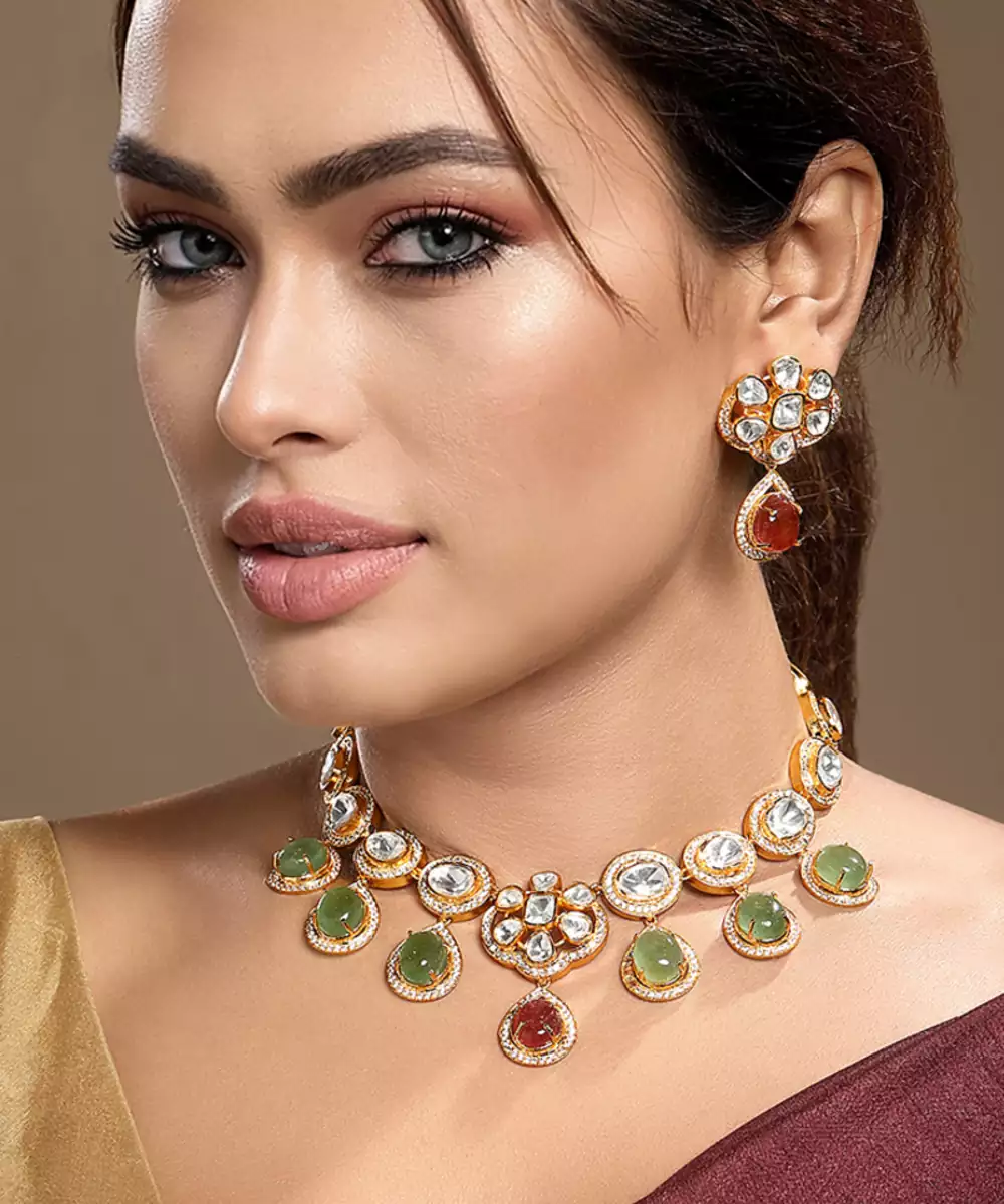 Elevate Your Elegance With This Gold Plated Kundan Green Stones Necklace Set. Designed With Intricate Craftsmanship, It Features Radiant Green Stones Set In Traditional Kundan Style. Perfect For Weddings, Festive Occasions, Or Special Celebrations, This Timeless Set Adds Regal Charm And Graceful Sophistication To Any Ethnic Ensemble.