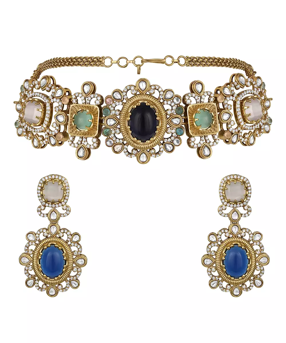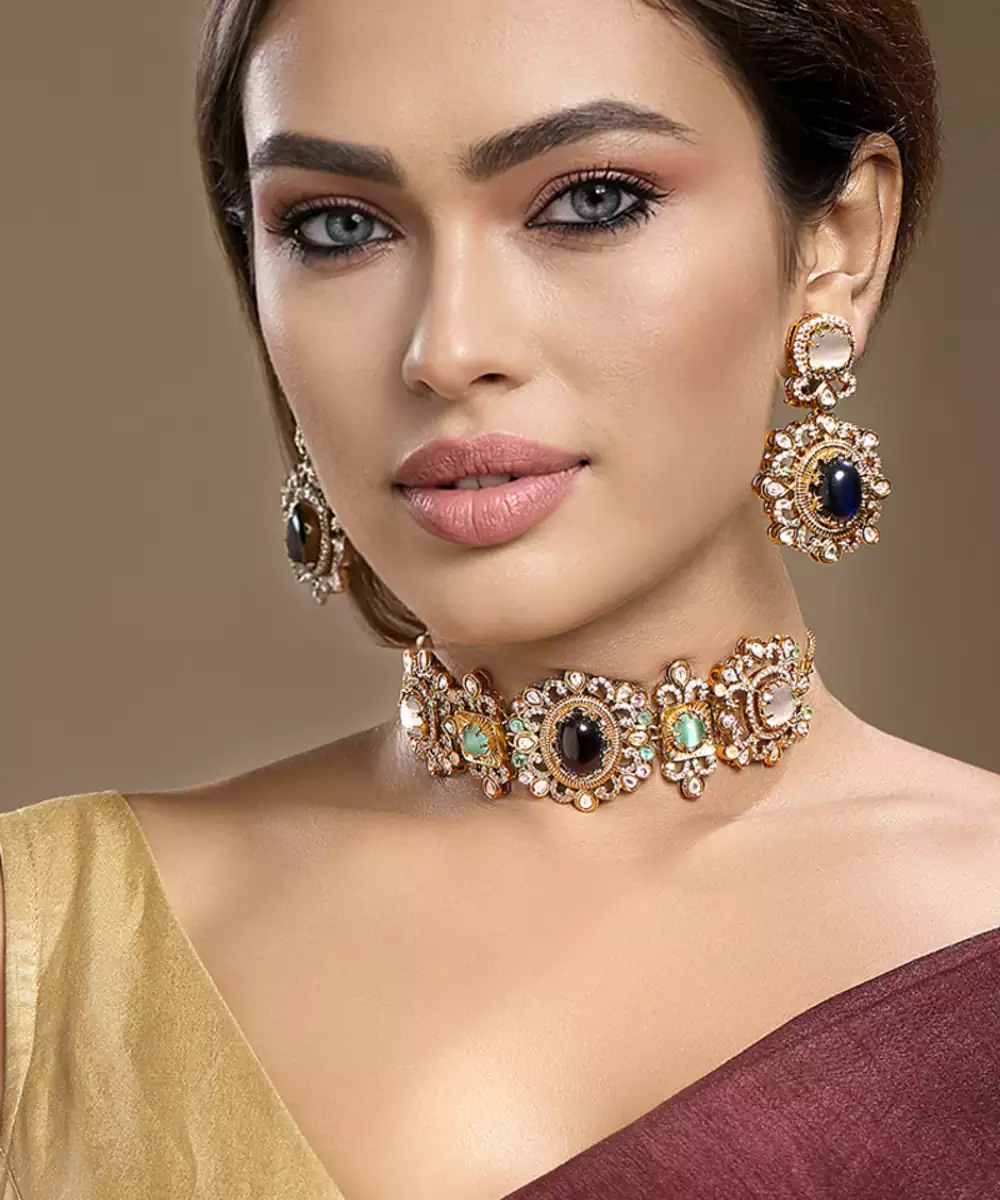 Add Vibrant Elegance To Your Festive Look With This Gold Plated Kundan Multicolor Choker Necklace Set. Beautifully Crafted With Intricate Detailing And Colorful Stones, It Blends Traditional Charm With Modern Appeal. Perfect For Weddings, Celebrations, Or Special Occasions, This Striking Choker Set Enhances Ethnic Outfits With Rich, Eye Catching Sophistication.