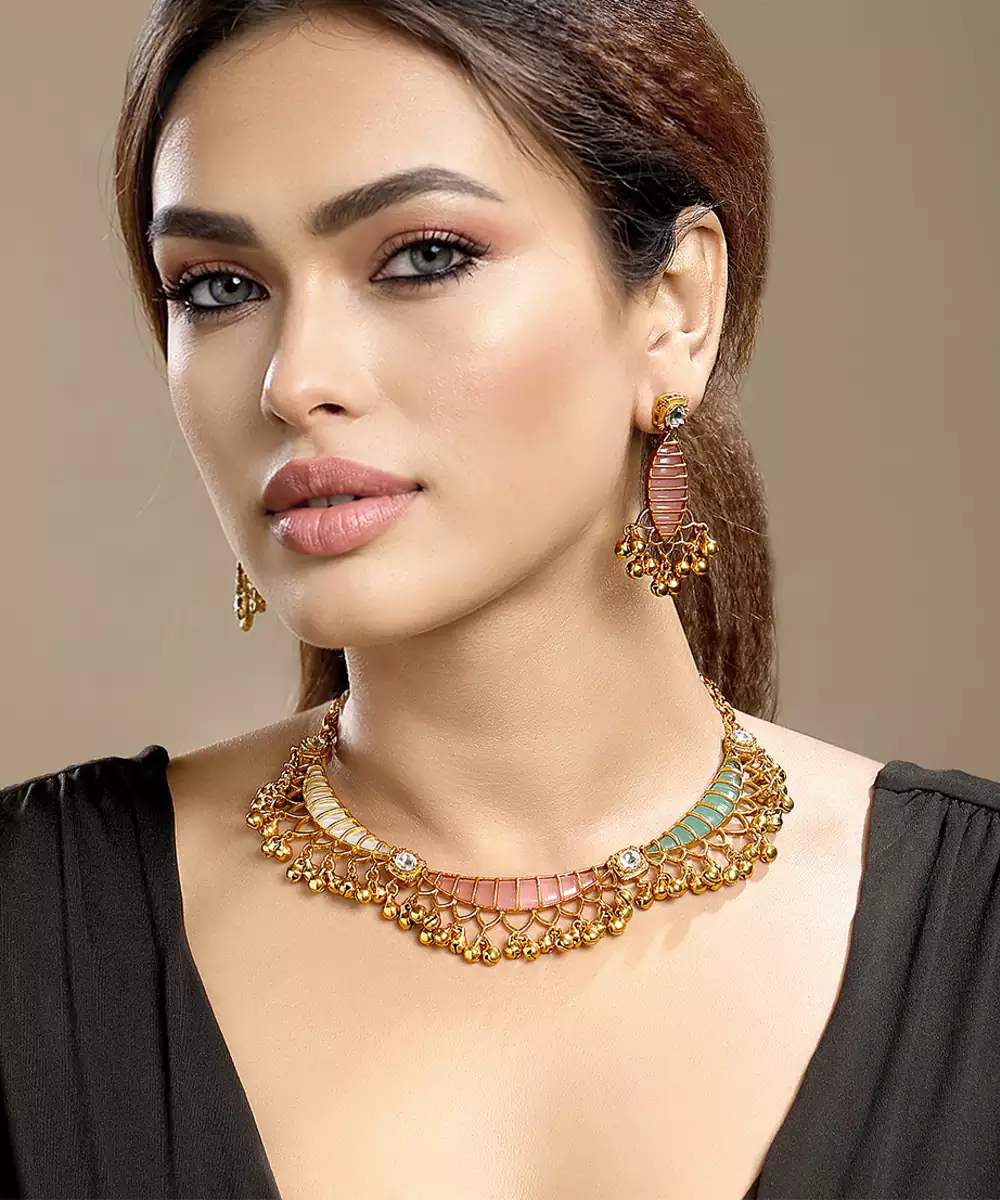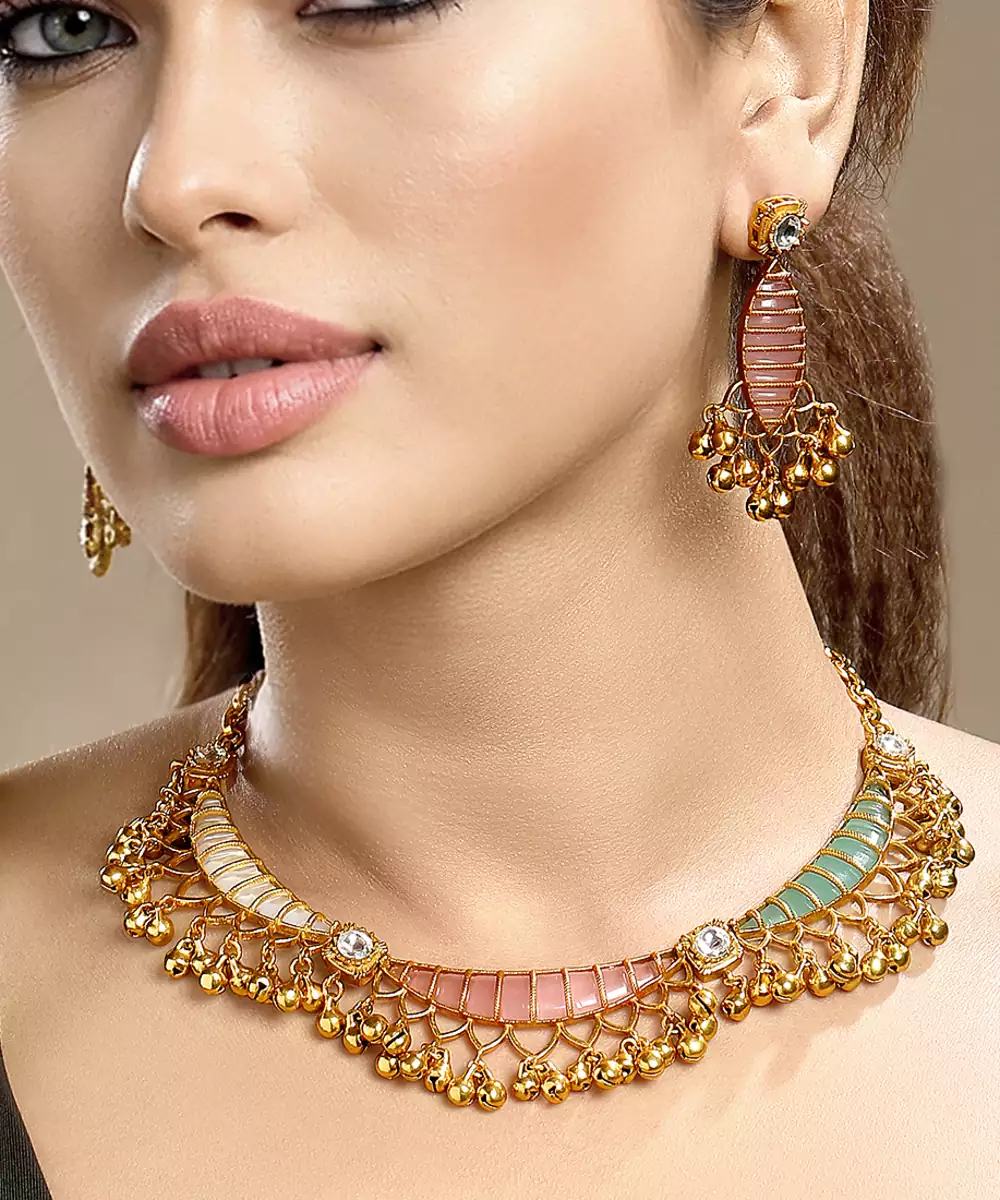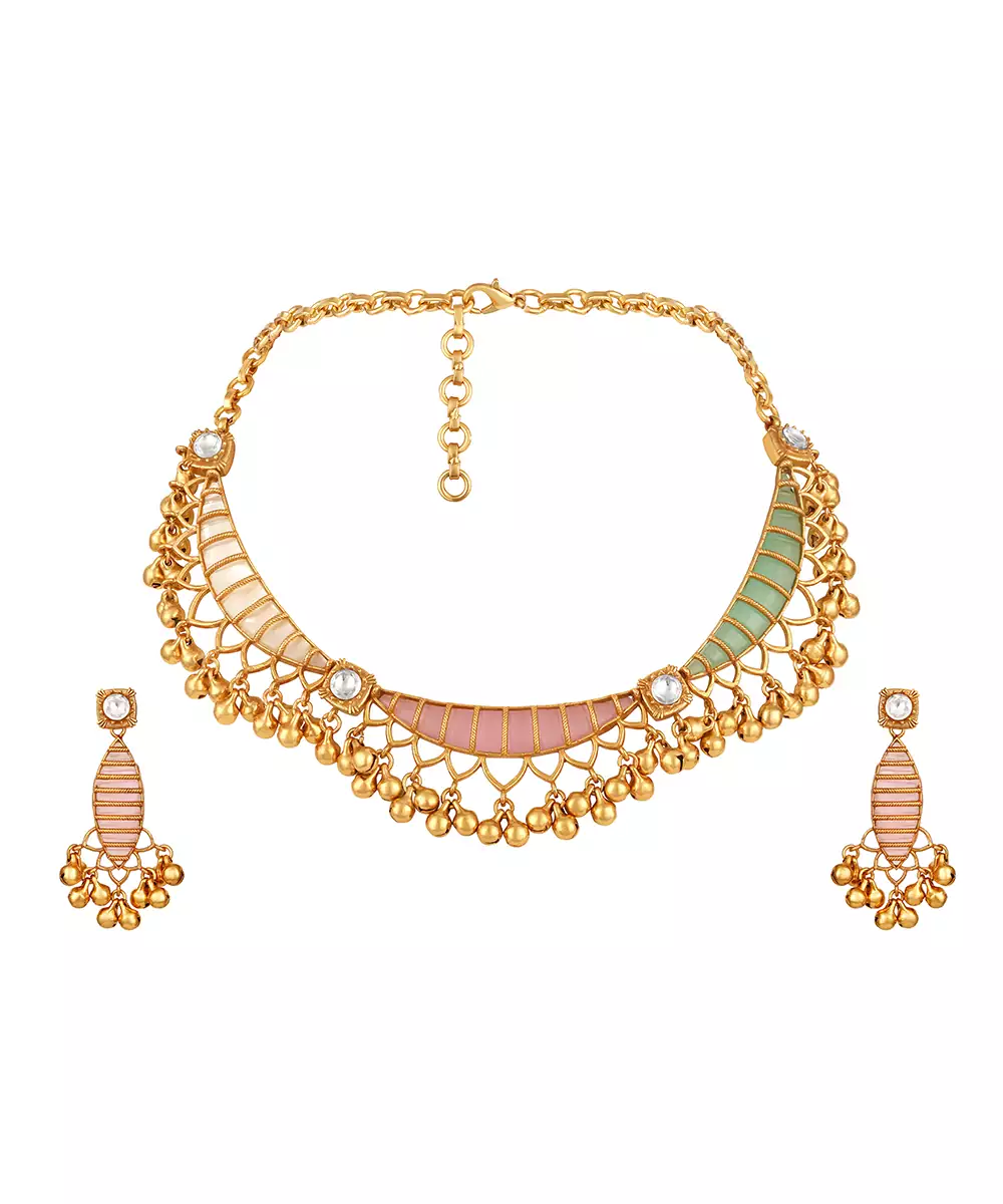 Elevate Your Elegance With This Gold Plated Kundan Multicolor Stones Necklace Set. Designed With Intricate Craftsmanship, It Features Radiant Multicolor Stones Set In Traditional Kundan Style. Perfect For Weddings, Festive Occasions, Or Special Celebrations, This Timeless Set Adds Regal Charm And Graceful Sophistication To Any Ethnic Ensemble.