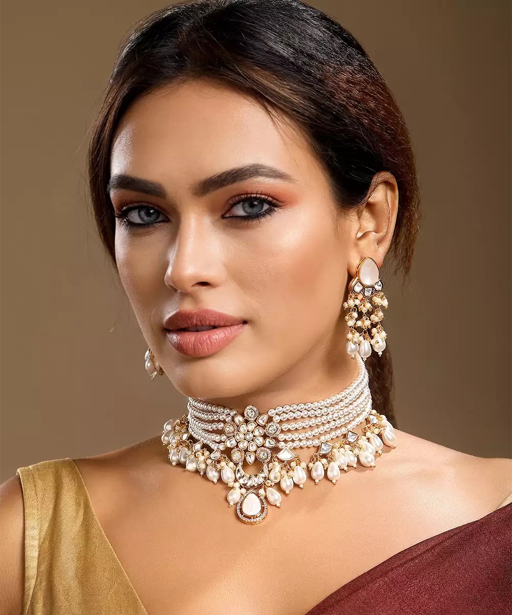 Enhance Your Traditional Elegance With This Gold Plated Kundan Pearl Choker Necklace Set. Featuring Lustrous Pearls And Intricate Kundan Craftsmanship, It Exudes Timeless Beauty And Grace. Perfect For Weddings, Festive Occasions, Or Special Celebrations, This Refined Choker Set Adds A Regal, Sophisticated Touch To Any Ethnic Ensemble.