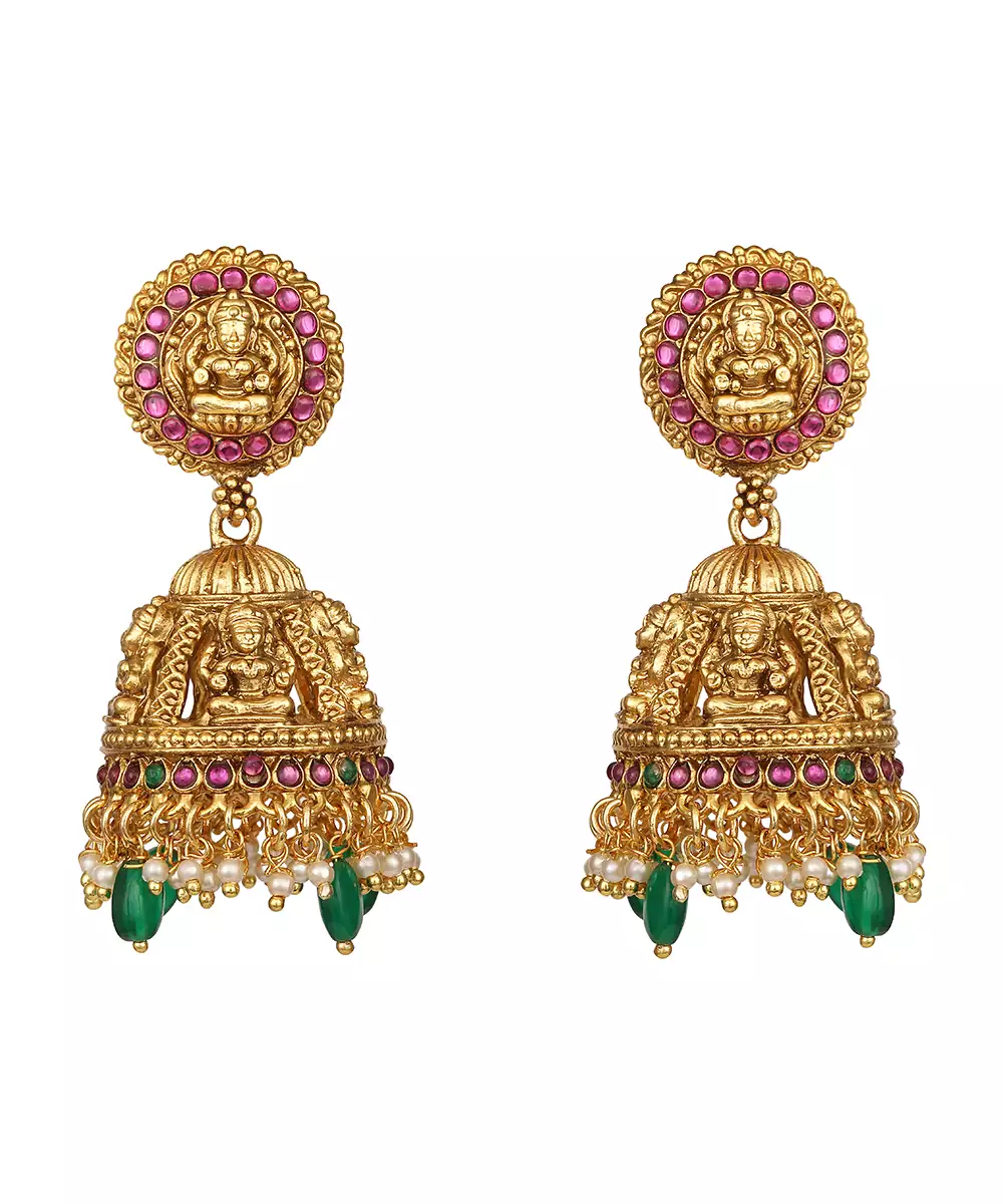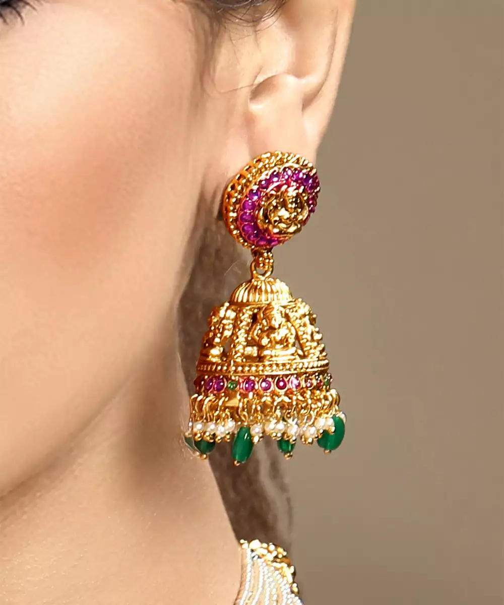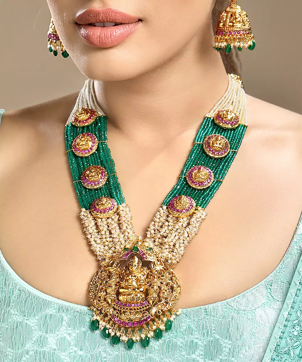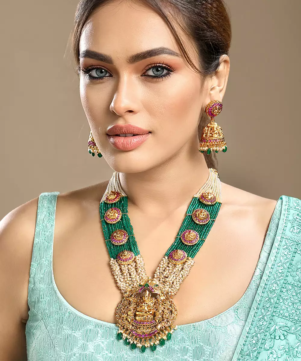 Embrace Traditional Elegance With This Gold Plated Temple Necklace Set. Inspired By Classic Temple Jewelry Designs, It Features Intricate Motifs And Exquisite Detailing. Perfect For Weddings, Festivals, Or Religious Ceremonies, This Timeless Set Adds A Divine, Regal Touch To Silk Sarees And Ethnic Ensembles.