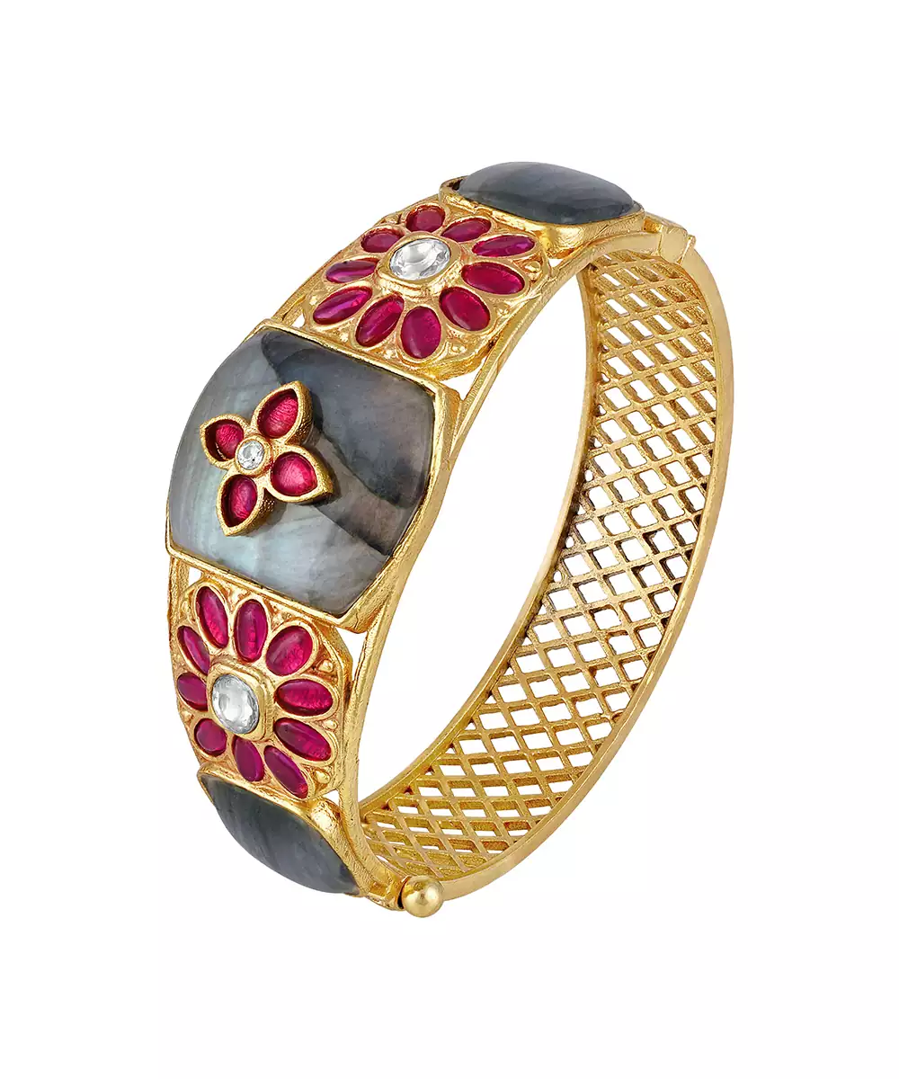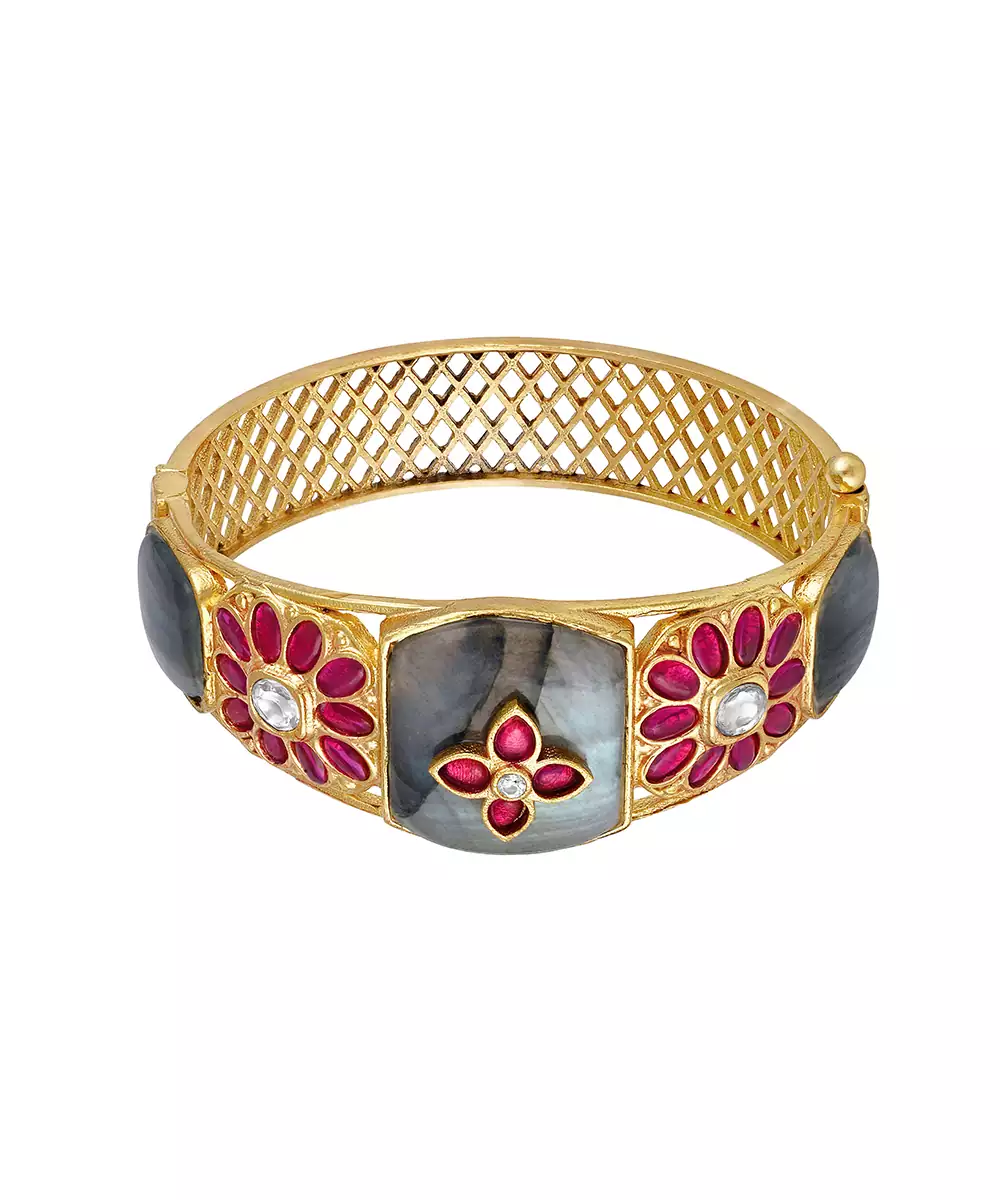 Micron Gold Polished Brass With Mosanite Kundan Polki, Synthetic Ruby, Natural Moon Stone Quartz May Have Minor Variotion In Shape And Colour Than The Image On Website.
