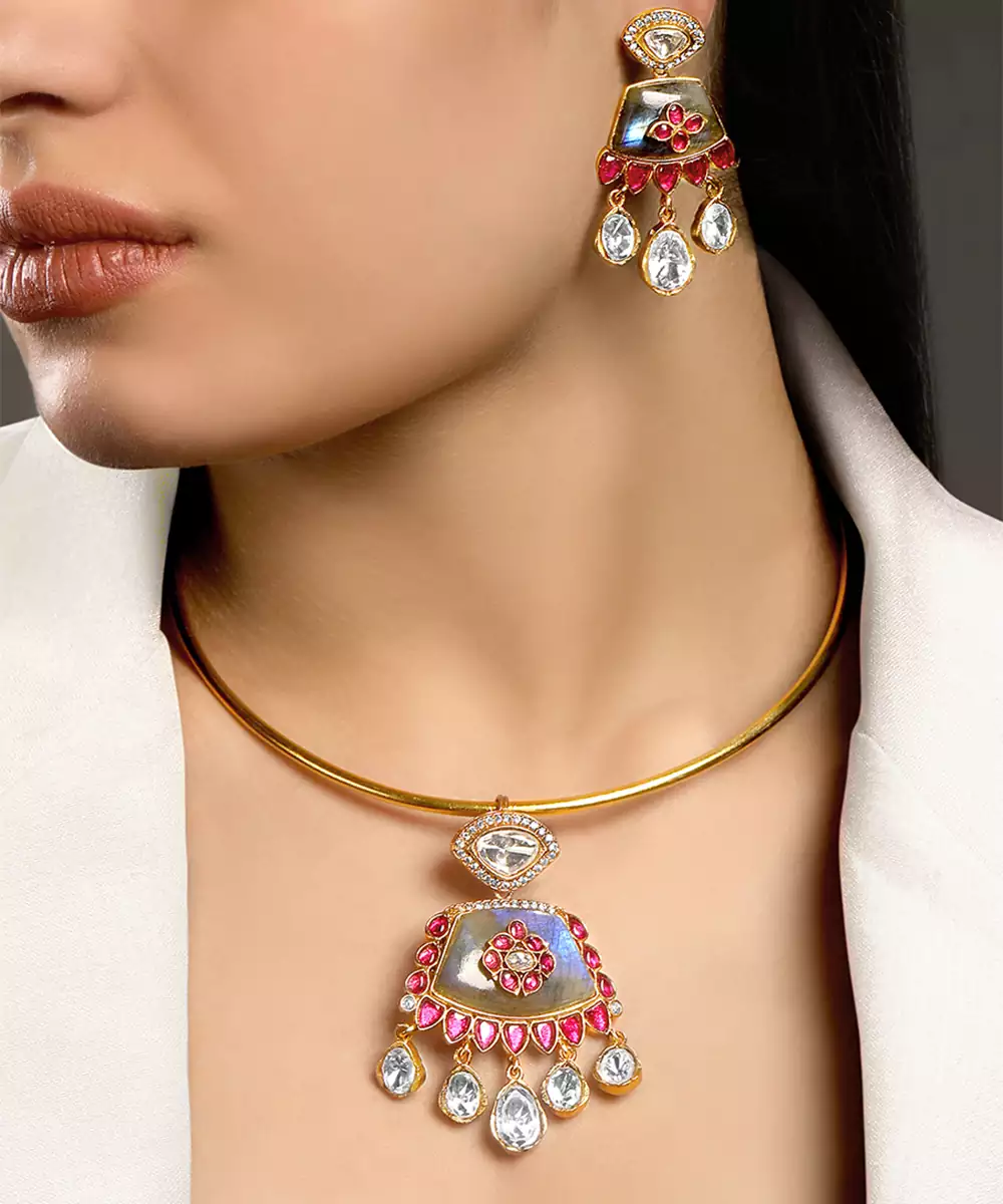 Micron Gold Polished Brass Hasli With Shaded Gold And Rust Polish And Natural Bends, With Mosanite Kundan Polki, Synthetic Ruby, Natural Moon Stone Onyx May Have Minor Variotion In Shape And Colour Than The Image On Website.