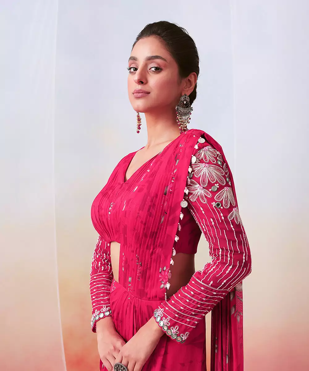 Pink Floral Printed And Embroidered Pre Stitched Saree Set