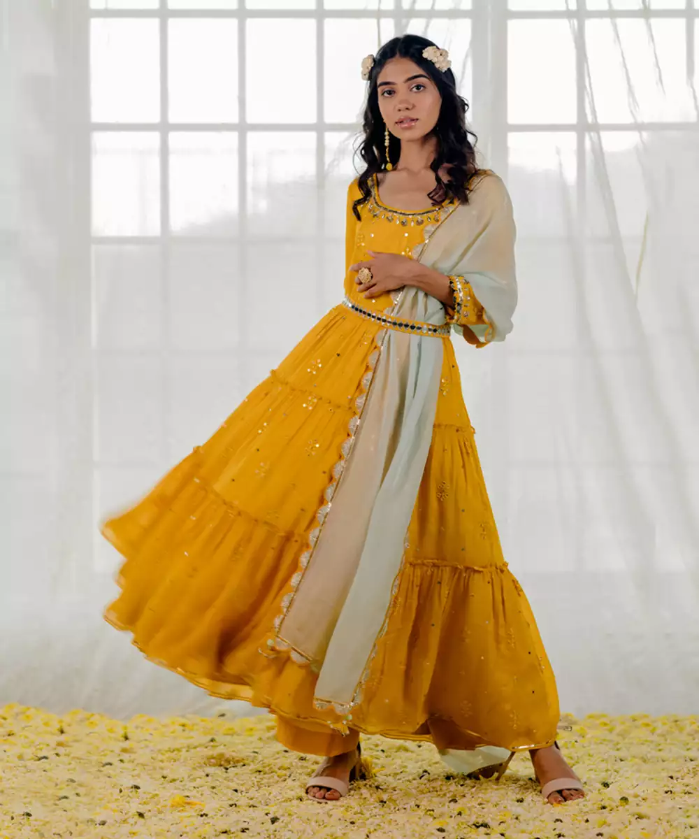 Featuring An Mustard Tiered Anarkali In Silk Chiffon Base With Mirror Work Detailing And Sequins Embroidery. It Is Paired With Matching Wide Leg Palazzo Pants In Upada Silk And An Aqua Viscose Organza Dupatta With Gota Scallop Border And A Mirror Work Tie Up Waist Belt And A Matching Mask.