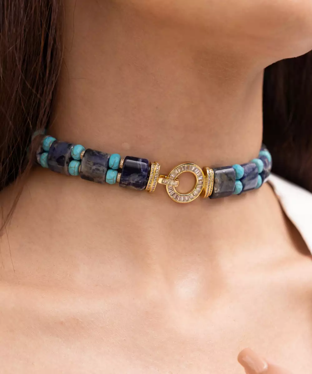 A Playful Blend Of Indigo And Turquoise Tones, This Beaded Choker Features A Gold Toned Clasp Style Motif At Its Center. A Subtle Statement For Casual Occasions, Beachy Weddings, Or Fusion Celebrations.