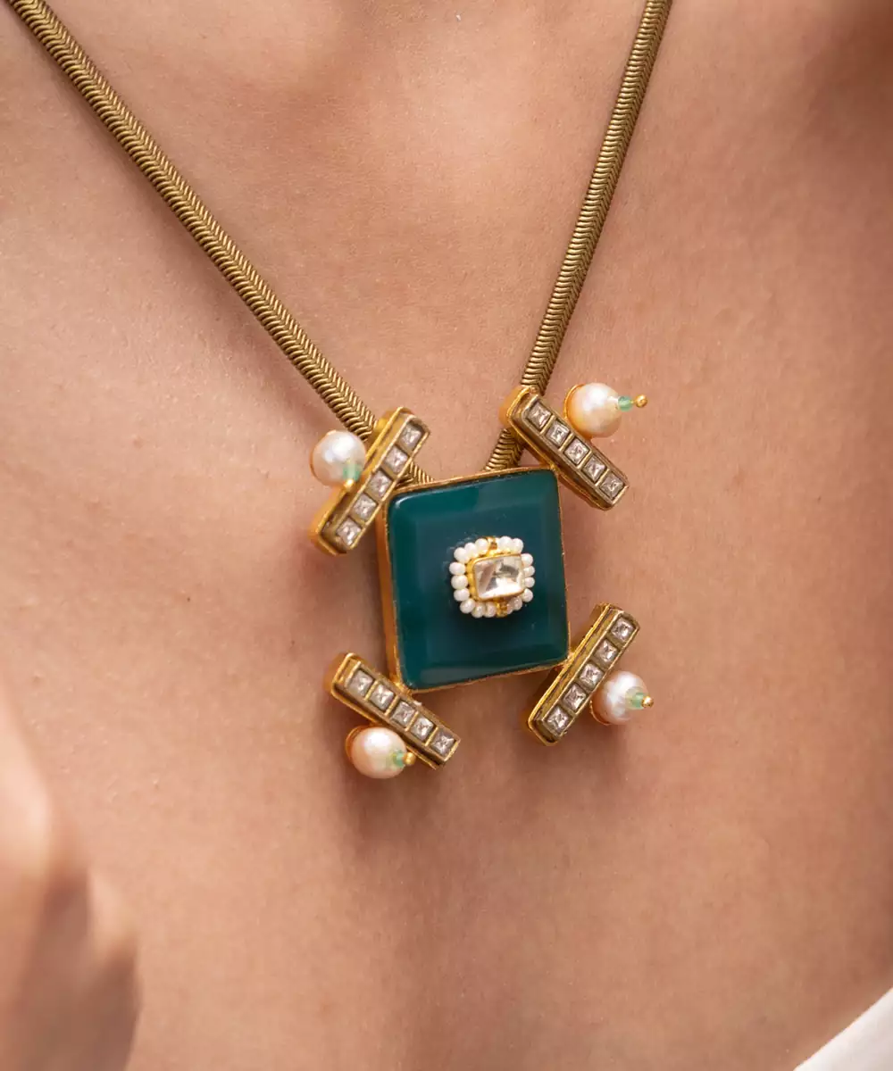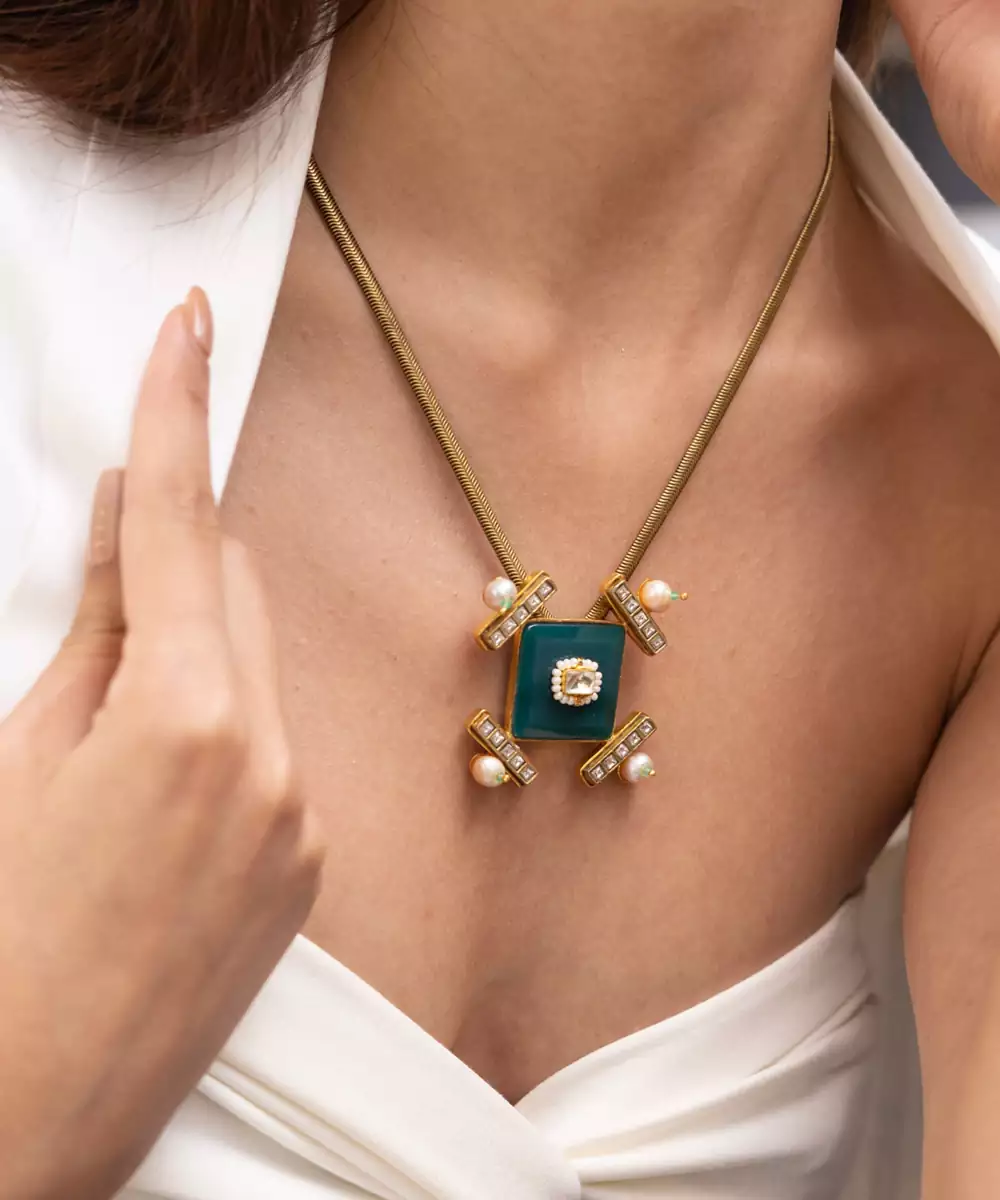 Featuring A Square Cut Green Center Stone On A Double Chain Setting, This Necklace Is Both Minimal And Architectural. A Refined Piece For Modern Ethnic Outfits Or Indo Western Ensembles.