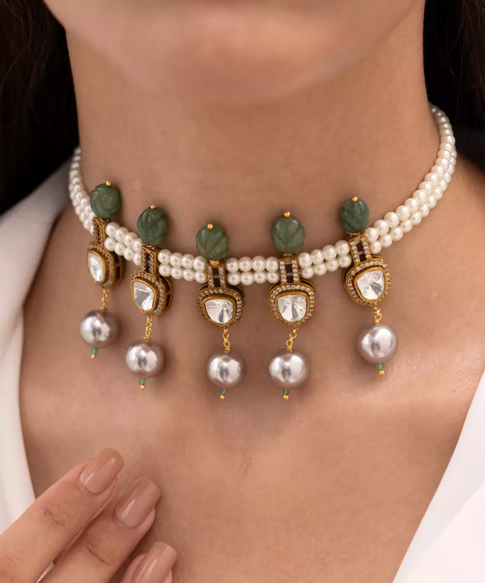 With Alternating Mirror Elements And Antique Gold Drops, This Bold Choker Creates A Rhythmic, Reflective Beauty Around The Neck. Designed For Standout Moments At Mehendi Nights Or Festive Dance Floors.