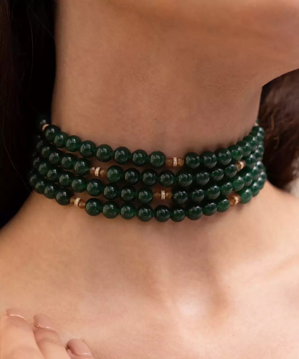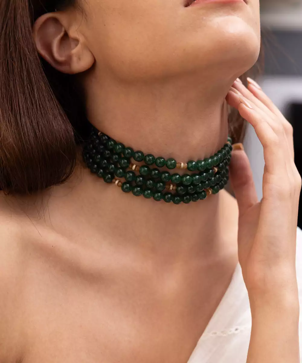 A Deep Green Multi Strand Choker Crafted With Polished Beads And Centered By A Subtle Charm. It Radiates A Classic Elegance Ideal For Evening Functions And Traditional Silhouettes.