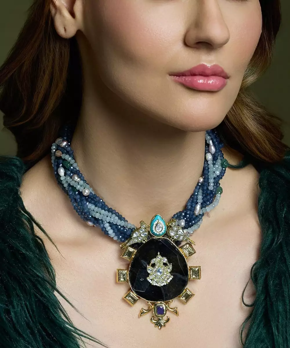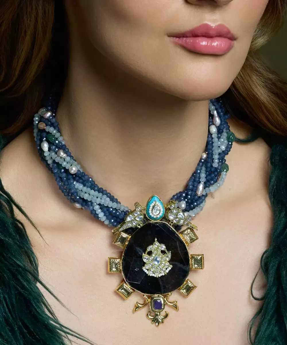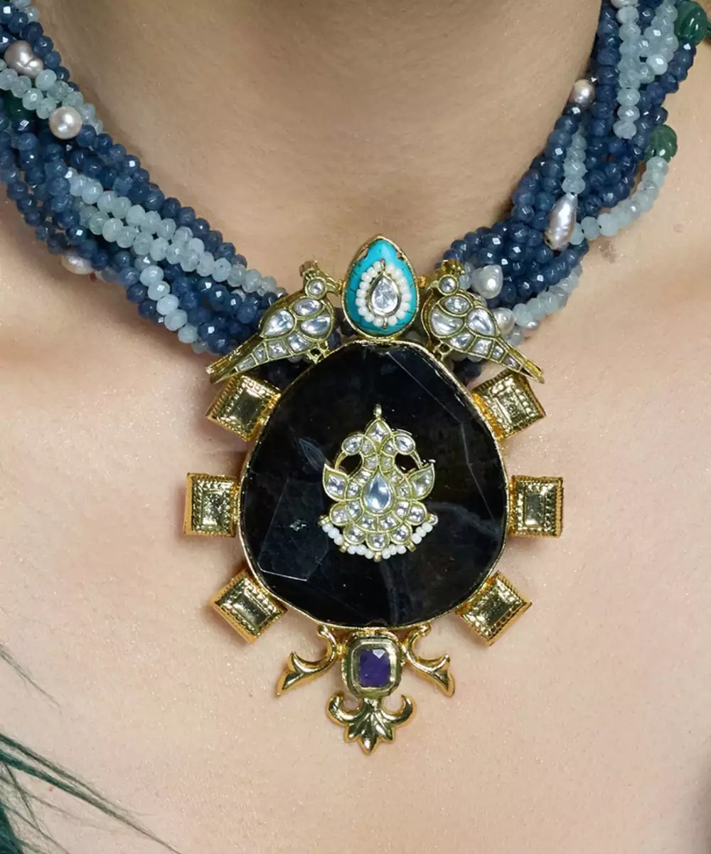This Stunning Necklace Features A Braided Blue Beaded Chain With A Central Black Pendant Adorned With A Divine Symbol, Radiating Elegance And Spirituality. Perfect For Traditional Attire Or Spiritual Occasions With A Royal Touch.