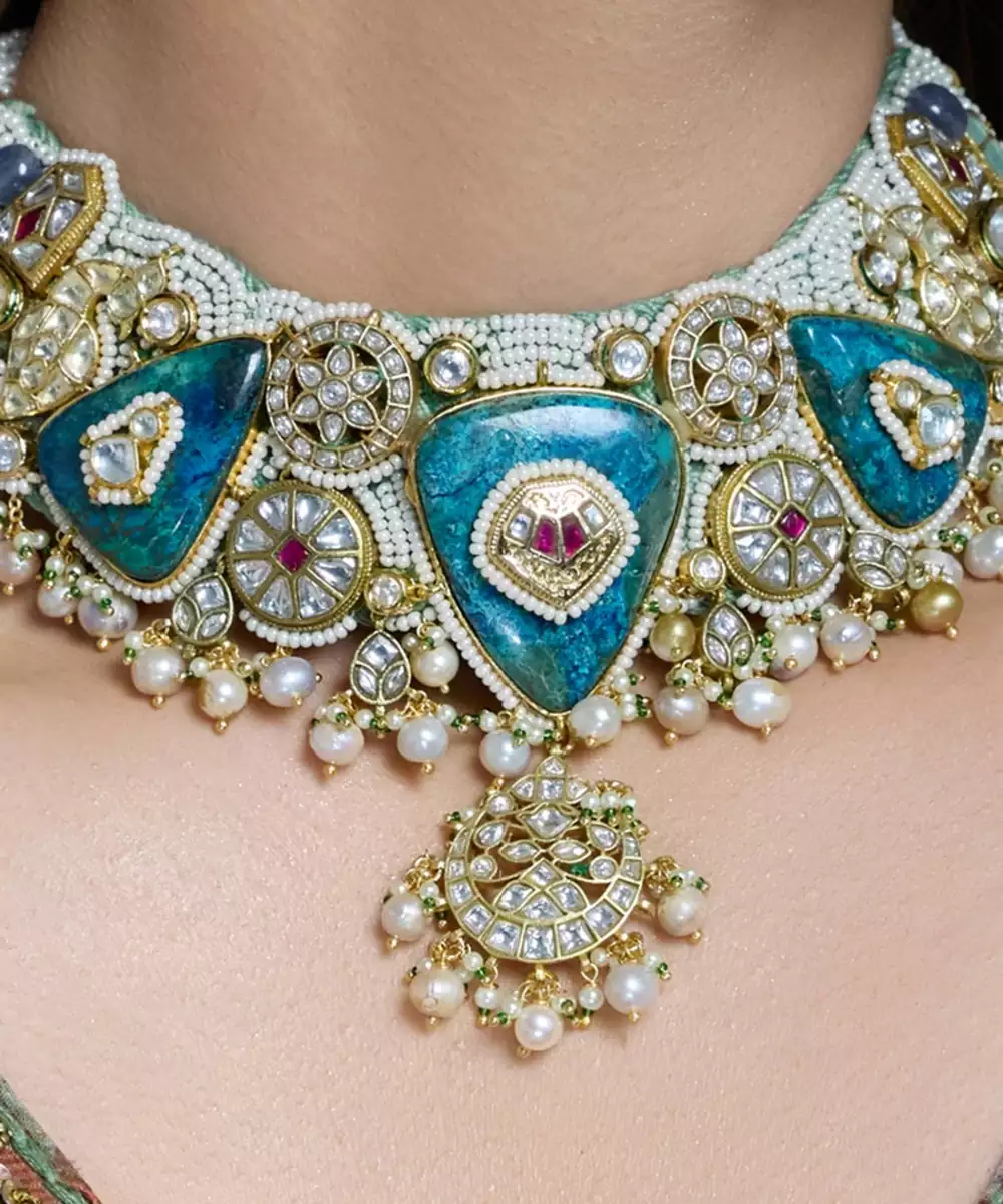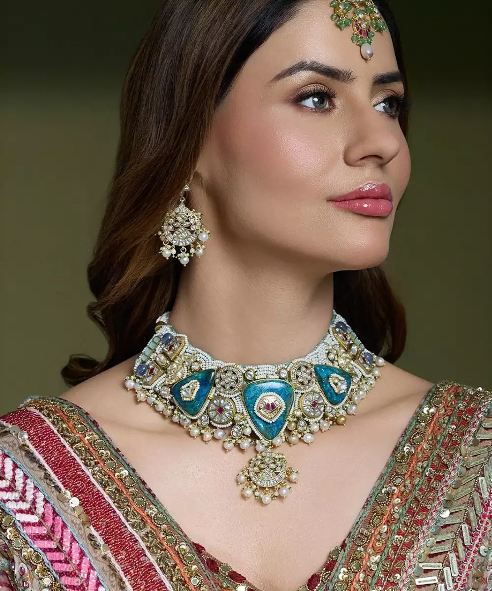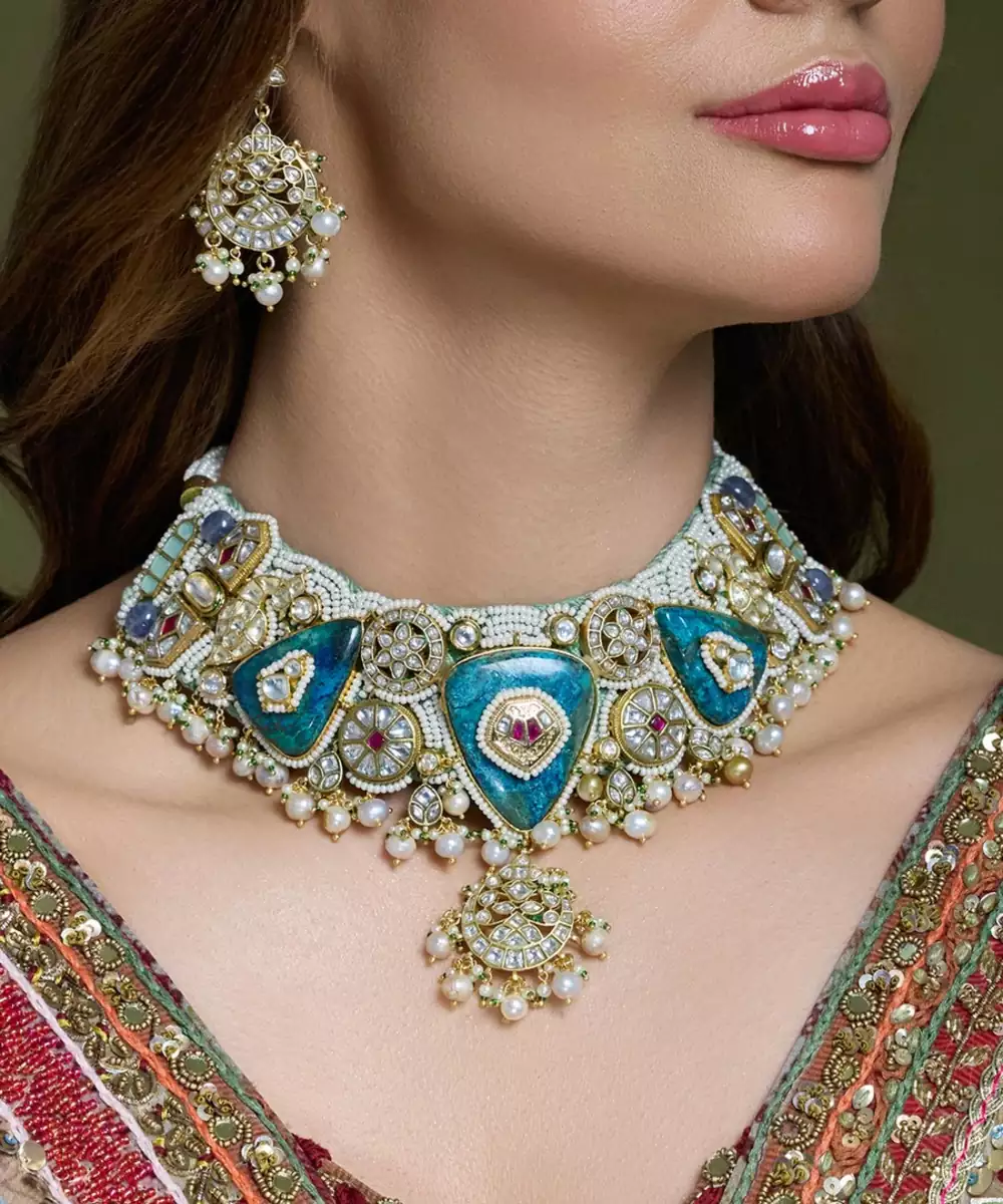 Infused With Royal Enamel Work And Intricate Detailing, This Bold Necklace Set In Teal And Gold Tones Captures The Essence Of Royal Heritage, Crafted To Elevate Your Grandeur At Every Celebration. Add Matching Earrings & Accessories To Complete The Look.