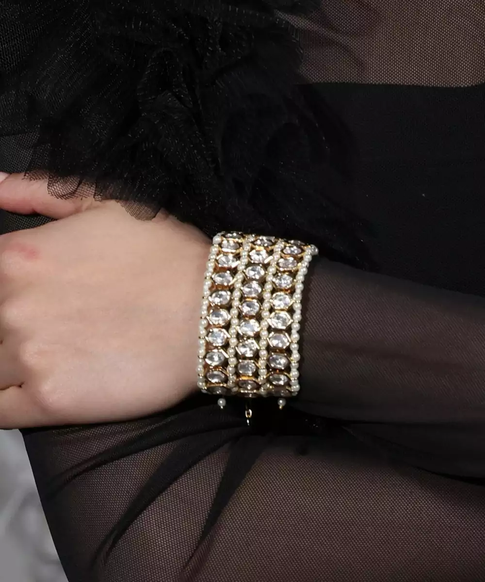 Elevate Your Elegance With Shober's Regal Allure Pearl Mesh Bracelet, Which Is An Intricate Fusion Of Golden Sparkle And Pearl Detailing. Perfect For Festive And Bridal Wear.