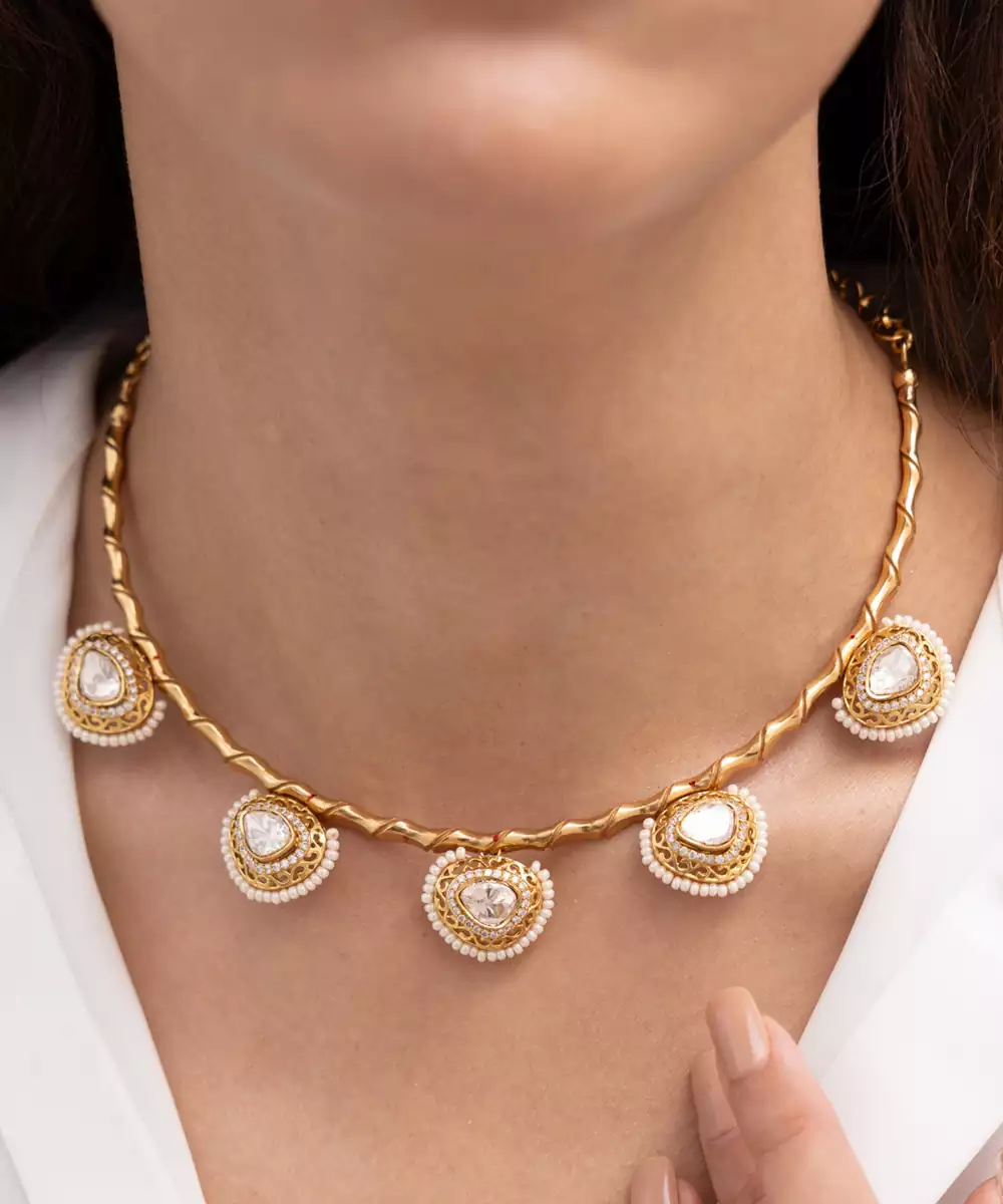Adorned With Gold Floral Discs And Embossed Details, This Choker Carries An Old World Charm With A Touch Of Modern Glam Its Bold Presence Makes It A Natural Fit For Celebrations And Heritage Styling.