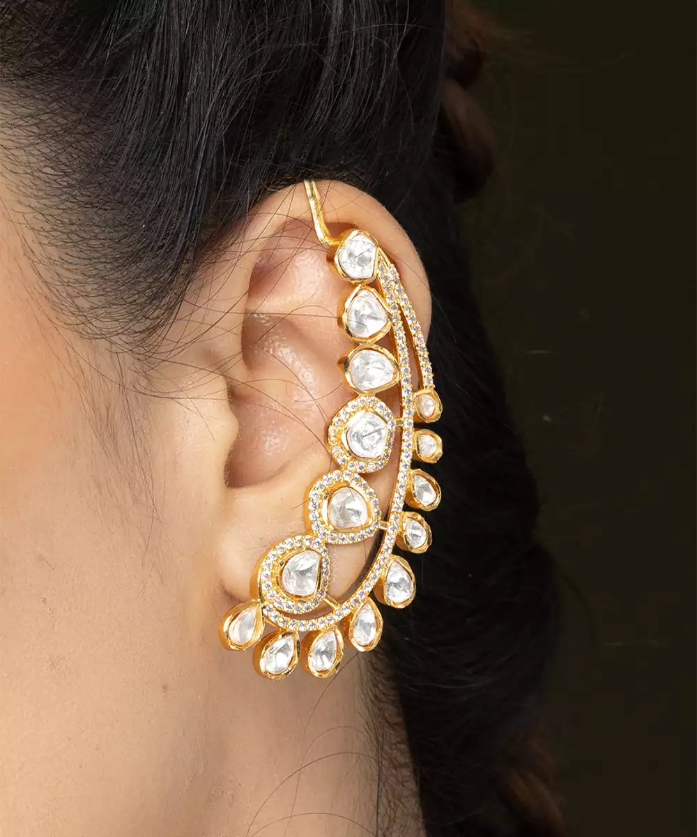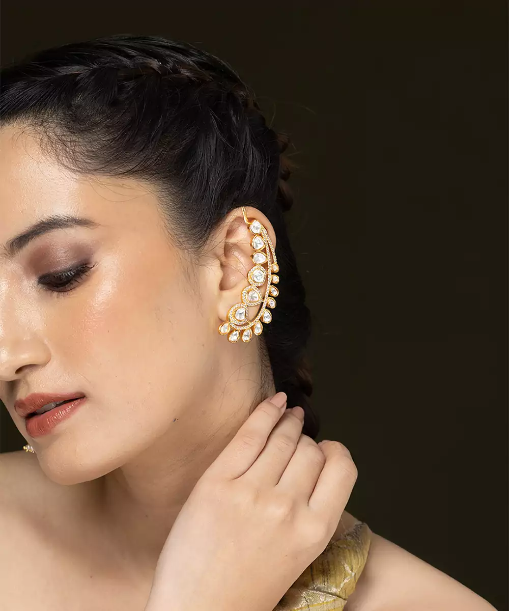 The Earrings Redefine Modern Elegance By Blending A Unique Contemporary Design With Timeless, Traditional Motifs. These Striking Earrings Are Designed To Sweep Gracefully Up The Curve Of The Earlobe, Creating An Elongated And Sophisticated Profile.