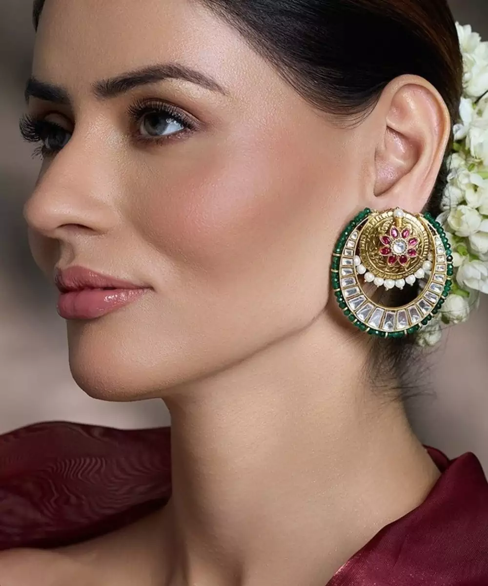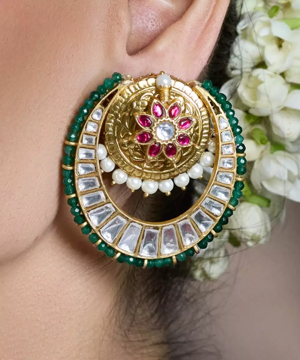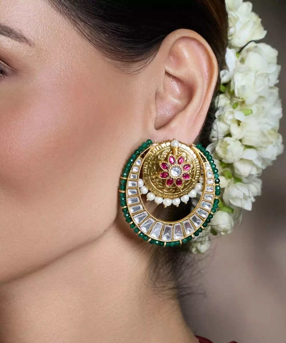 Majestic Bloom Chandbali Earrings Featuring Vibrant Stones, Pearl Accents, And Antique Gold Finish. Perfect For Weddings, Festivals, And Traditional Outfits.
